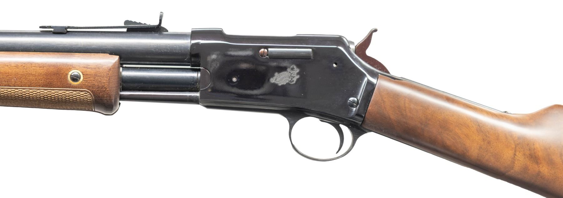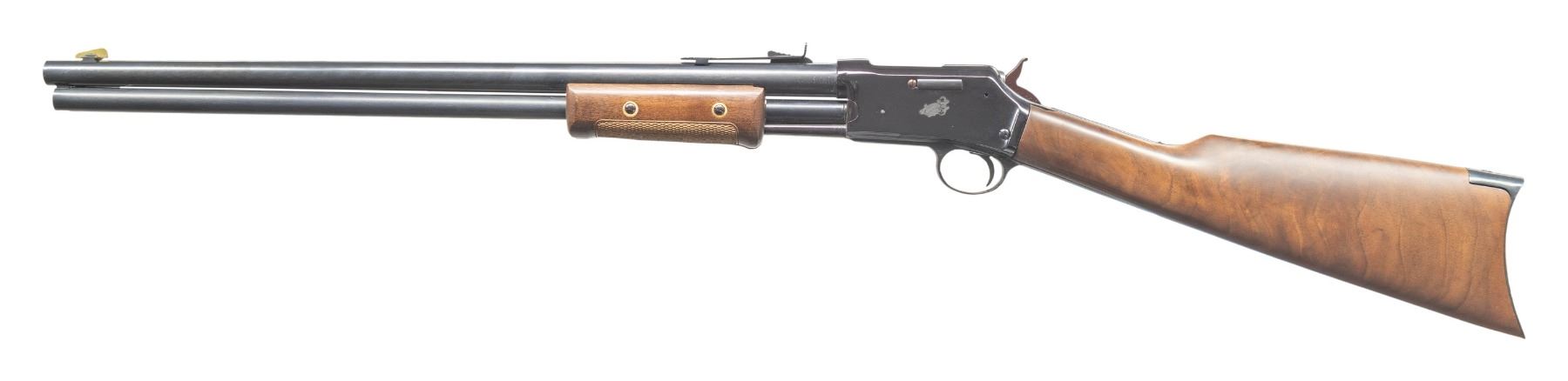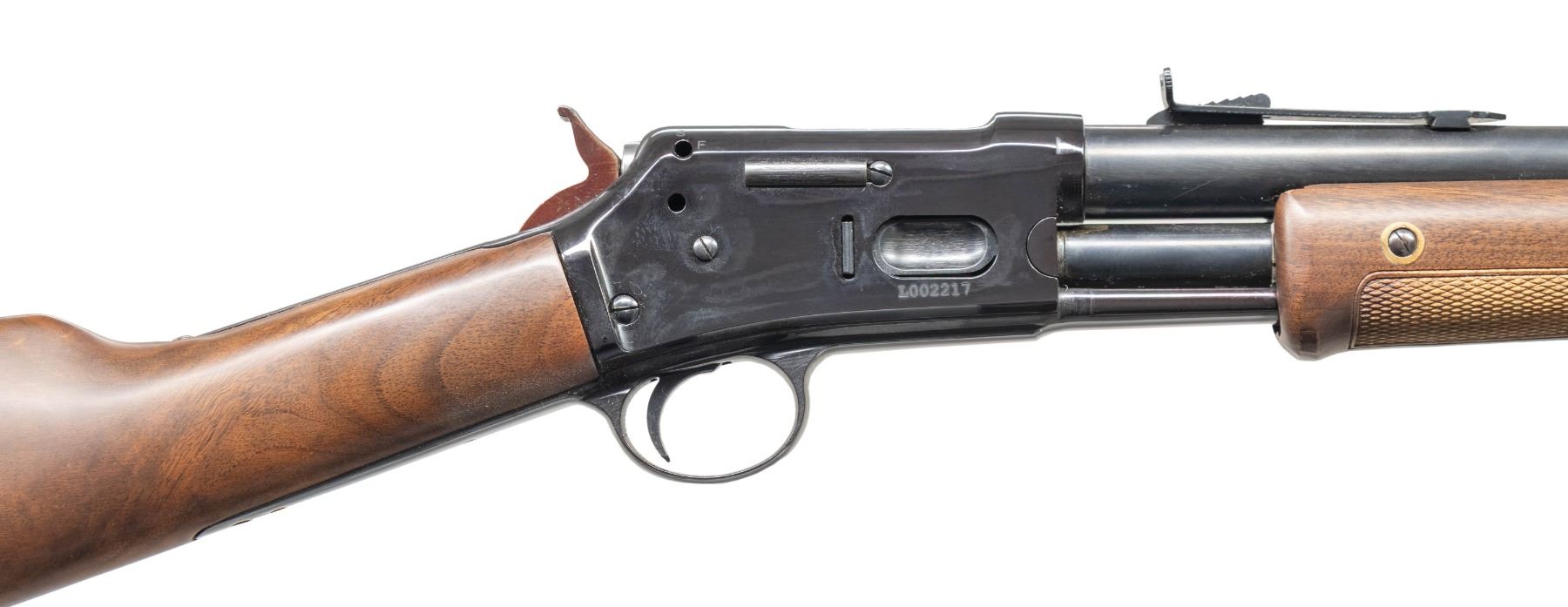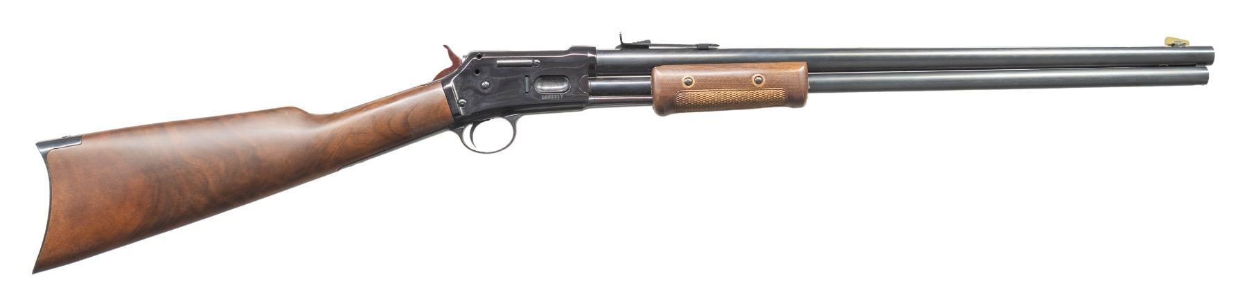 Cal. 45 Colt (45 LC). S# L002217. Imported 2003-2004; patterned after the Colt Lightning. Rnd. 20" barrel. Brass blade front sight & elevator rear sight. 11 Shot tubular mag. Blued finish. Walnut stock set w/ crescent buttplate & 2 piece checkered forearm. CONDITION: very good to near excellent metal & wood finish with light handling marks & plum hue to receiver. Near excellent rifling. PROVENANCE: From the PMRB Collection. (25-5957/MD). MODERN. $300-500.