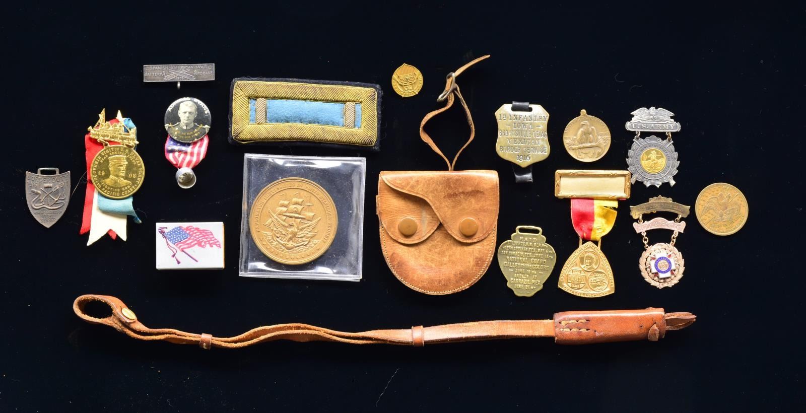 & HUMIDOR. This widely varied lot includes a 58 cal. Civil War ammunition crate stenciled “FROM SAINT LOUIS ARSENAL DEC. 1864. 1000 RIFLE MUSKET EXP’D’G. BALL CARTS. CAL . . . . . 58 1200 PERS CAPS. OV”. / 6 Mexican Border Service watch fobs & pins. / Admiral Dewey match safe. / Gold U.S.W.V National Auxiliary Past Presidents medal. / WWII Navy of Occupation medal planchet. / 5 Euro coin. / WWI era single 1st Lt. shoulder strap for infantry. / Medal commemorating the 1908 visit of the naval fleet to the Pacific coast featuring “Fighting Bob”. / 1940 GAR medal from Detroit, MI. / Admiral Evans pinback button. / 1898 Desk medal from the women of South Carolina to Lieut. Victor Blue U.S.N. / Sword knot for a M1913 Patton saber. / Banner for Veterans of Foreign Wars stenciled “CHINA MARINES”. / Admiral Dewey motif red, white & blue ceramic humidor. CONDITION: ammo. box has minor paint losses & no lid. Other items show light wear. (02-13711/BF). $1,000-2,000.