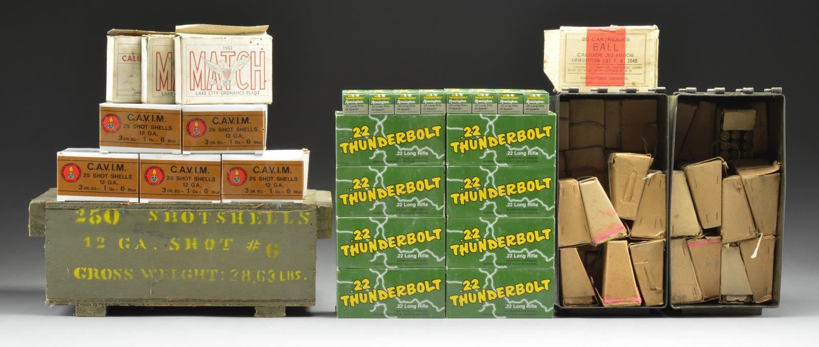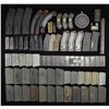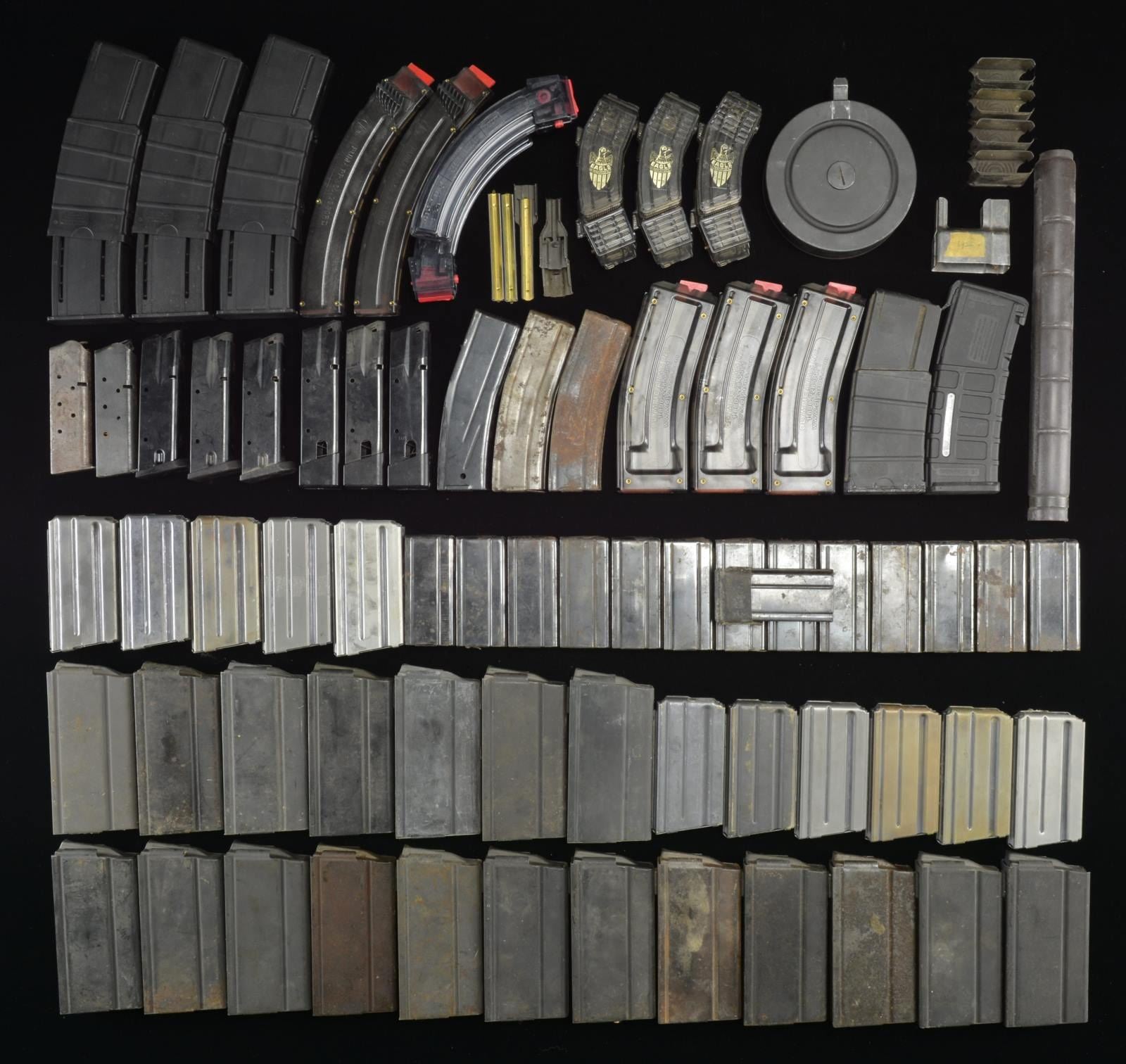 MAGAZINES: 14 - M1 Carbine 15 rd. mags. / 3 - M1 Carbine 30 rd. mags. / 19 - M14 20 rd. mags. / 11 - M16/Ar15 steel 20 rd. mags. / 3 - Black Dog MAchine Ar 15 cal. 22 LR. 30 rd. mags. / 3 - Thermold AR15 40 rd. mags. / 2 - AR15 30 rd. mags. / 6 Eagle 10/22 mags. / 2 Butler Creek 25 rd. mags. for 10/22. / 2 Puma PPS50 30 rd. mags. / 1 Drum mags. for 22 LR PPS. / 2 Model 1911 mags. / 6 pistol. mags. / misc. strippers clips. / Also included are 4 ammo cans. CONDITION: steel mags. in fair condition w/ red rust throughout, plastic mags. good w/ wear. Ammo boxes in good overall condition w/ ammo appearing serviceable. (02-16978-2/MD). $400-600.