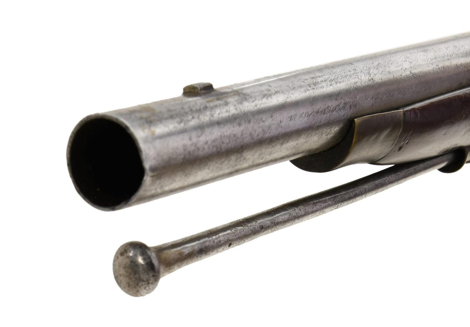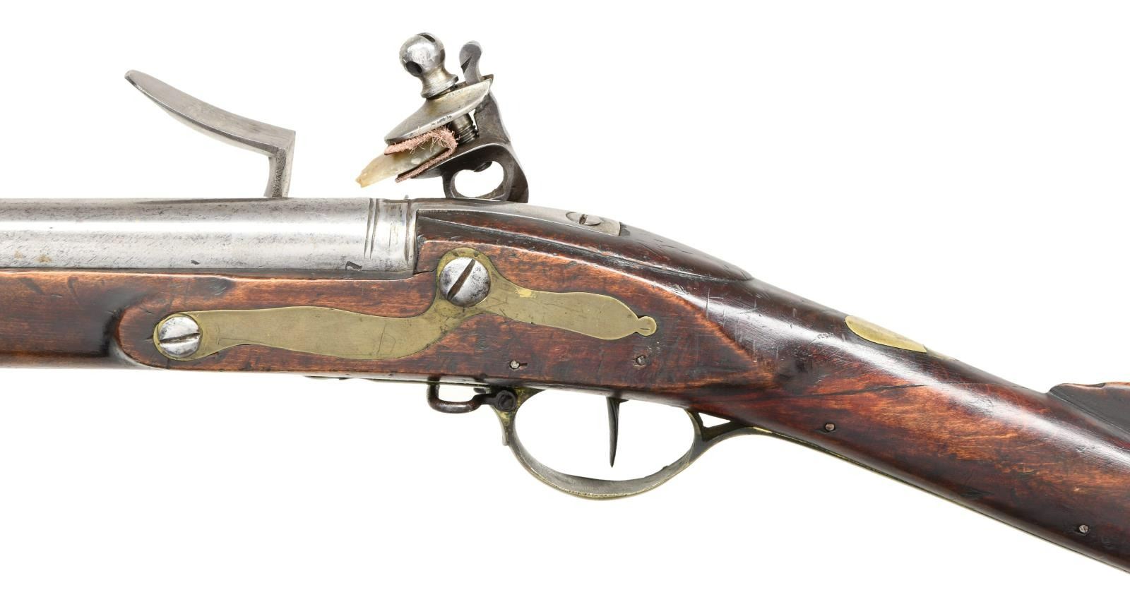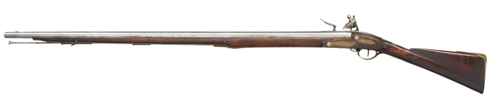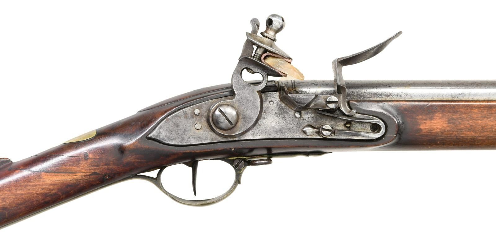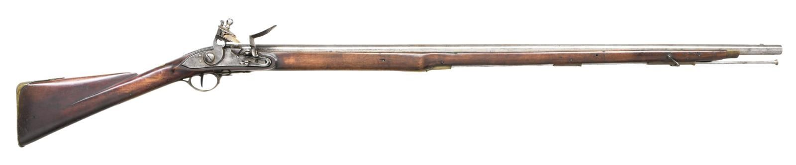 Cal. 70. NSN. Bbl. 40". Barrel has a rectangular lug/sight near the muzzle and turned rings at the bolster. The barrel & lock have no marks. Brass trigger guard in the style of a Brown Bess. Brass butt plate, heart wrist escutcheon, flat side plate, entry thimble, ramrod thimbles with Pratt's improvement, and nose cap. Iron ramrod & sling swivels. Unmarked stock. CONDITION: barrel has a light gray overall patina. Lock has a medium patina and holds both full & half cock. Brass parts have a deep mustard brown patina. The stock has a drying crack near the butt and tight repaired cracks near the wrist. Fair but dirty bore. (01-24064/BF). ANTIQUE. $1,600-2,200.