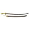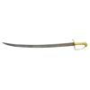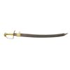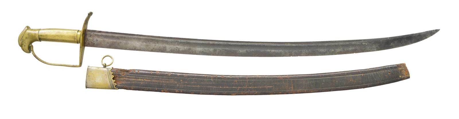 Overall length: 34”. Blade length: 28 1/2”. Blade has a single medium fuller with a smaller fuller near the spine. Solid brass hilt with the guard terminated by a folky scallop shell. Plain guard joins the eagle head under the beak. As with most sabers by Prahl, the type 3 version has round eyes with 3 semi-circular lines behind the beak opening. The classic decagonal grip of Prahl is undecorated, as normally seen. The scabbard is quite likely not original to the sword as it appears to be from a high-grade English made saber. It has a leather body with a lightly silvered brass throat. All other mounts are missing. CONDITION: blade has a dark gray mottled patina. Hilt is quite solid and shows a very pleasing overall mustard patina. Scabbard shows flexing and has a hole in the reverse. Throat has only traces of silver plate remaining. (02-19213/BF). $1,800-2,800.