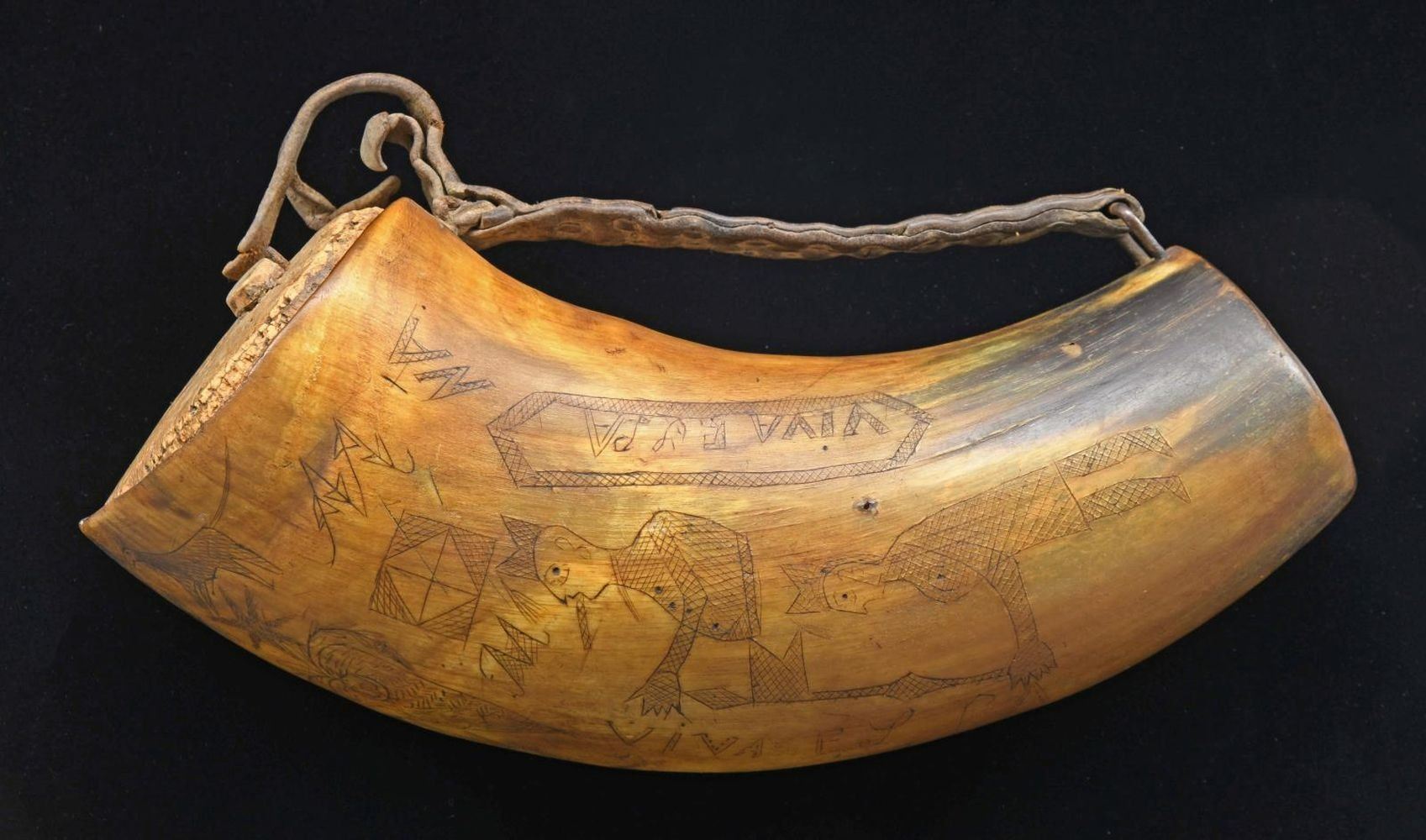 POSSIBLE SPANISH ORIGIN. This horn measures approx. 10 1/2" x 4” at the butt. Both ends are closed with a cork-like material; the narrow end being permanent and the butt being removable. Carved figures on the horn include a soldier smoking a cigar and a soldier holding a cavalry lance. There is a panel that reads “VIVA ELPA”. The horn also has foliate motifs, birds, a topless female figure, and geometric decorations. There is an iron cleat at the spout for attachment to a leather suspension strap, and the opposite end is threaded through the horn with a leather thong. CONDITION: the horn generally shows light wear with some deterioration of the cork ends. The leather carrying strap is a bit dry but remains solid. The engraving generally remains quite clear and easily discerned. (02-22462/BF). $400-600.