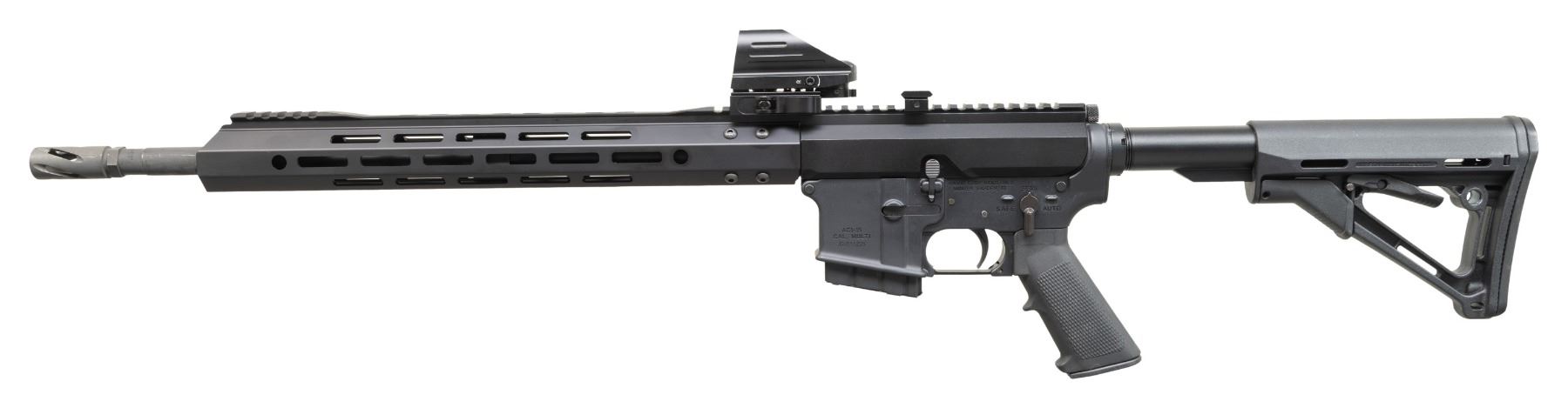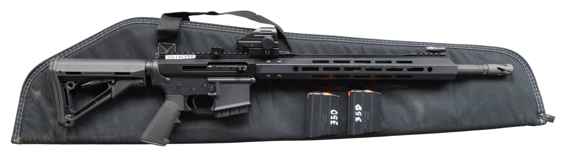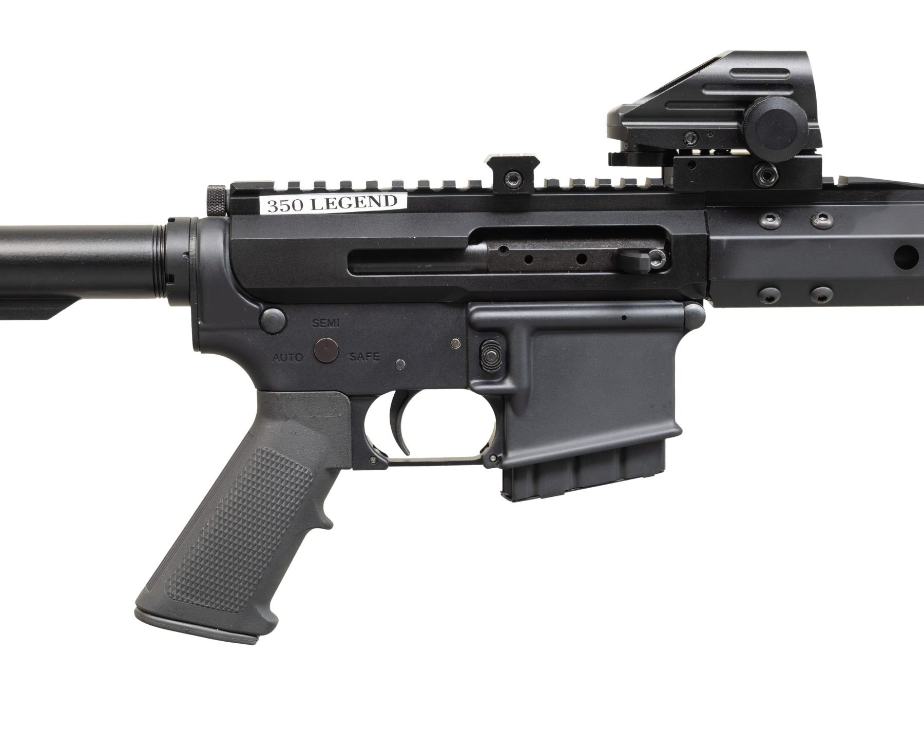 Cal. 350 Legend. S# J2-011226. Bbl. 18". 1:16 barrel terminated w/ spiral flash hider. 15" free floating handguard. Flat top, right-side charging upper receiver. Currently sporting Dagger Defense electronic sight. 6 position buffer tube w/ Magpul MOE collapsible shoulder stock. M16 profile bolt carrier. MAGS: 3 steel 5 rd. UNATTACHED ACCESSORIES: black nylon transport case. CONDITION: All aspects indicate very little use, if any. Sight appears to function as intended. Bright bore w/ strong rifling. Fire control mechanism appears to function correctly when cycled by hand. (25-6102/JZ). MODERN. $500-800.