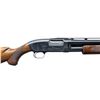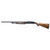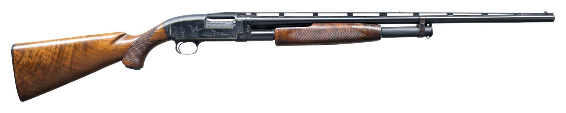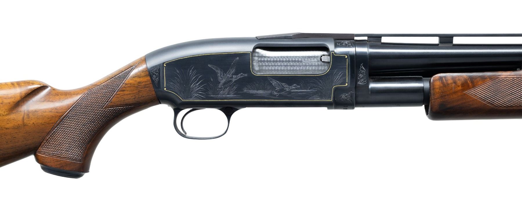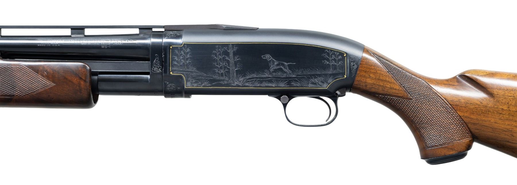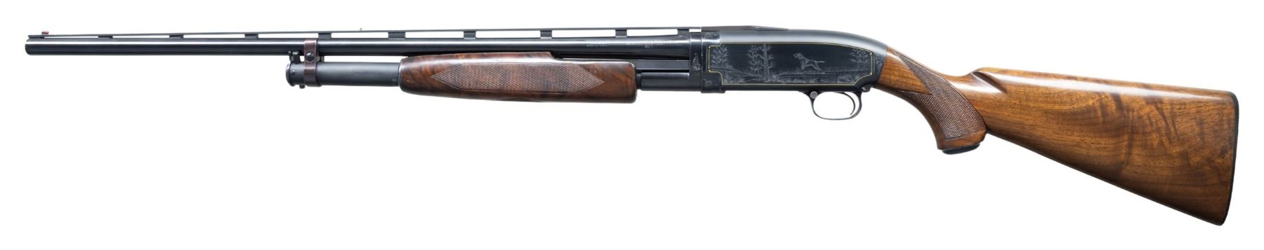 GRADE PUMP SHOTGUN. Cal. 20 ga. 2 3/4". S#1919761. Bbl. 26" with New Style factory vent rib having a duck bill receiver extension. The action has custom 12-2 engraving with gold borders by former FN master engraver Angelo Bee. Right side features a marsh scene with 2 flying mallards. Left side woodland scene depicts a pointer. Highlights of scroll continue to upper & lower receiver areas, trigger guard bow and receiver extension. The extension also has an added pigeon. Bolt & carrier are finely jeweled. Original beavertail forend & steel capped pistol grip skeet stock of fancy black walnut have standard target checkering and original buttplate. Mfg. 1961. CONDITION: near excellent as upgraded retaining nearly all restored metal finish on the bbl. & action. The mag tube shows slide wear. Stocks have very good original finish showing a few small marks. Sound action. Bright near excellent bore. (25-4964/DS). CURIO. $5,000.-8,000.