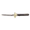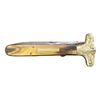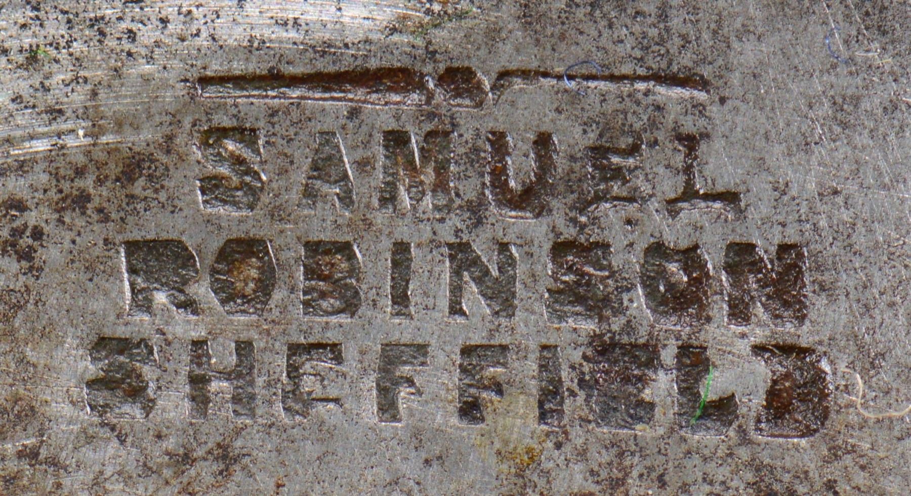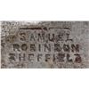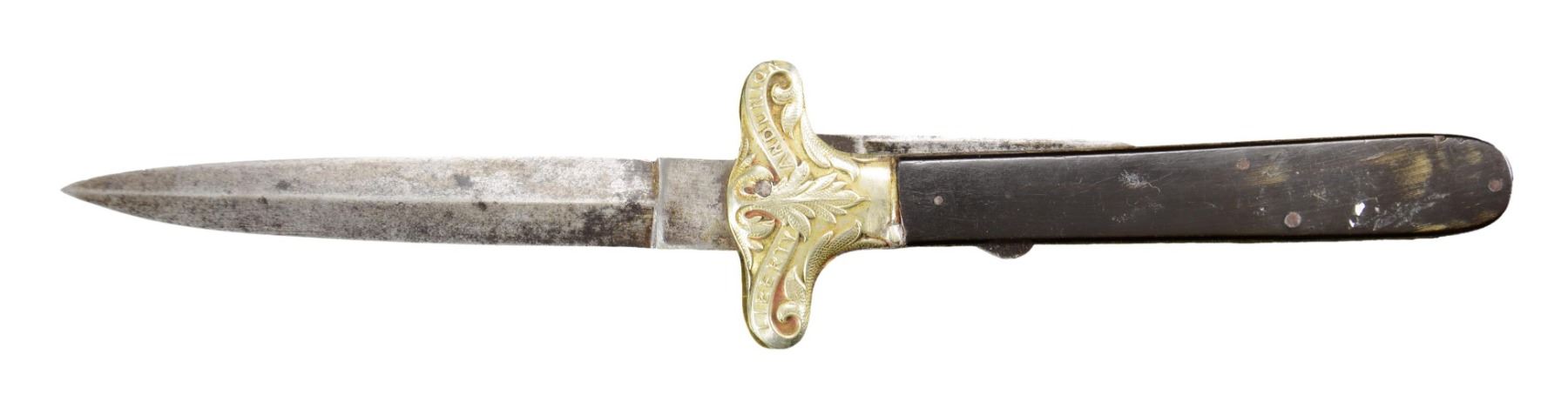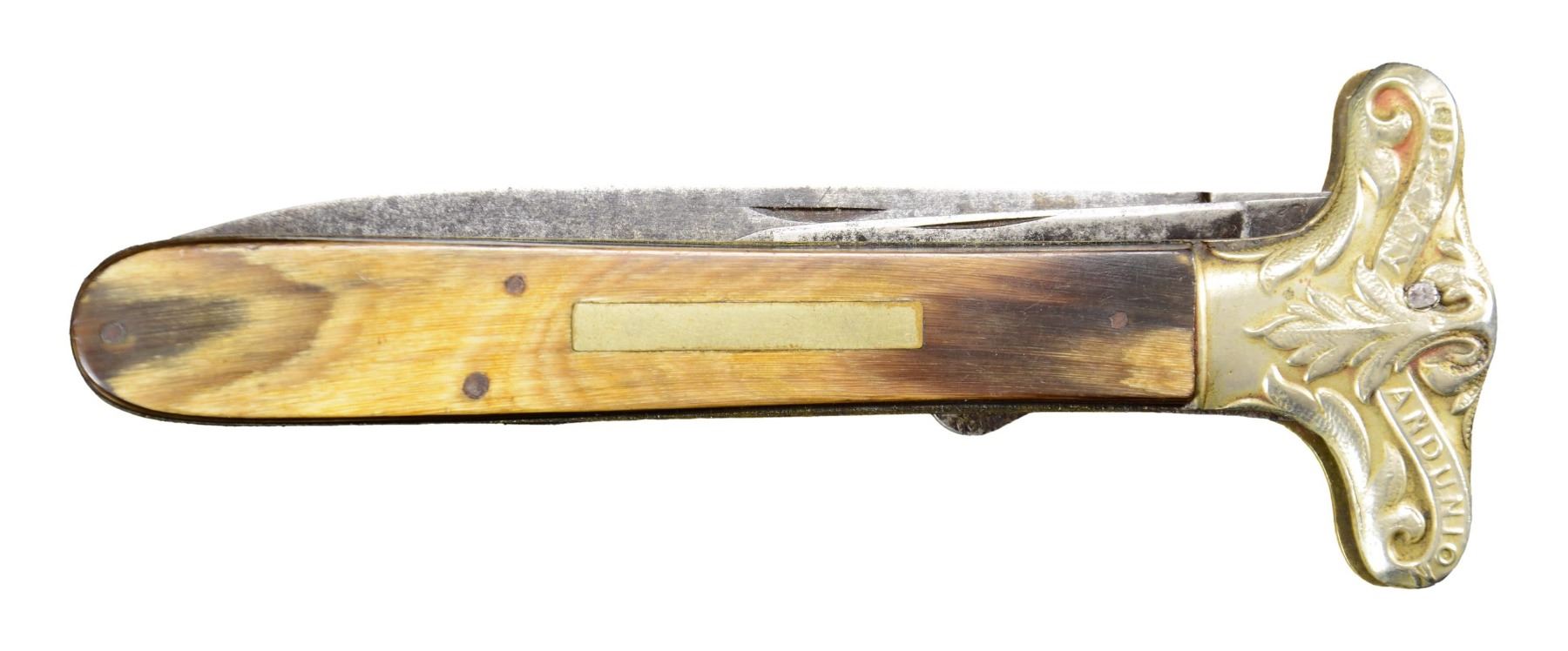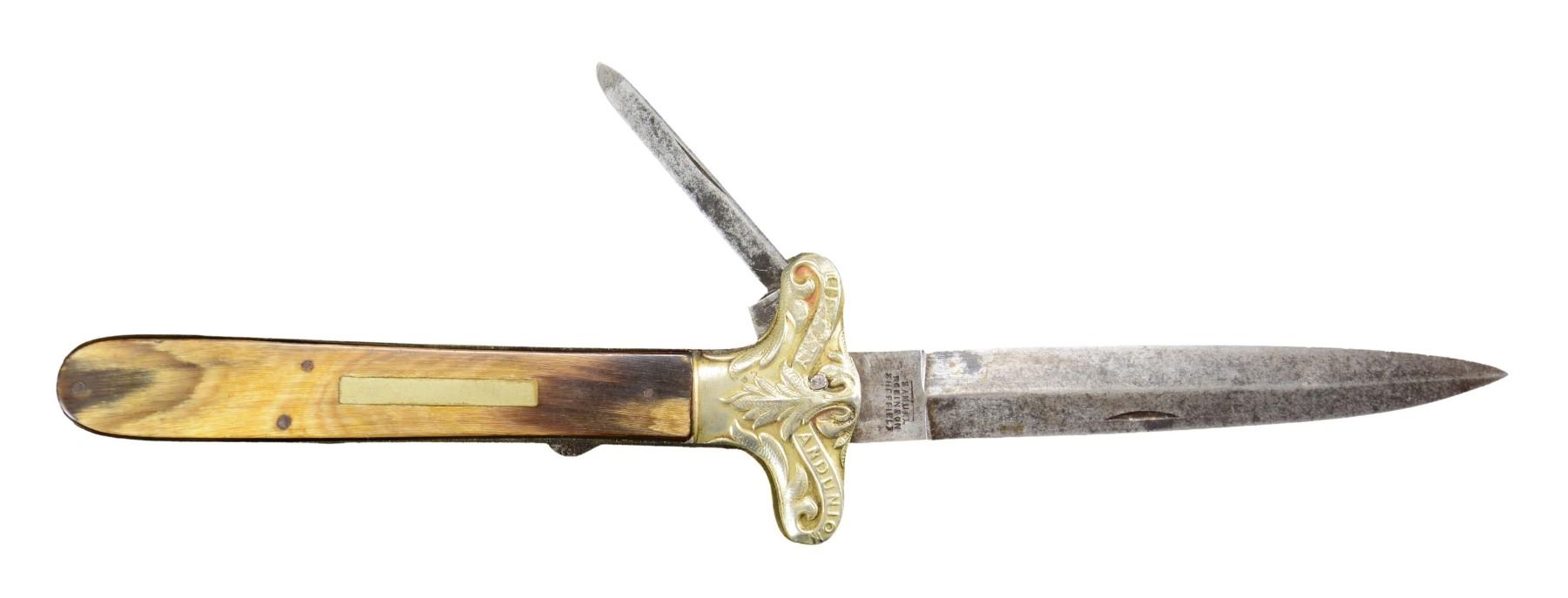LOCKBACK KNIFE 9.5"overall, 4.25" spear point blade and locks open, the second blade is a small pen blade. "SAMUEL / ROBINSON/ SHEFFIELD" on ricasso. Both blades have Robinson’s mark. The handle scales are colorful horn with a rectangular German silver escutcheon and iron pins. The front bolsters are German silver in the form of Liberty and Union cross guards. There are no rear bolsters. UNATTACHED ACCESSORIES: Custom protective sleeve. CONDITION: very good overall, blades are gray, stained, bolster has denting to one side, obscuring portion of LIBERTY, otherwise handled very good. PROVENANCE: Larry W. Williams lifetime collection 1976. (02-23262/JS). NON-GUN. $1,500-2,500.