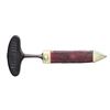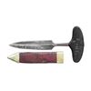 6.75" overall, 4" double edged dagger point blade. 3.25" ebony grip numbered "10" on top, adjacent to German silver capstan rivet. This unknown maker has always been thought by most knife collectors to be made by Mississippi River manufacturer in either New Orleans or Memphis. This example has name "W. H. [W]RIGHT" nicely carved on one side of the grip and two sets of initials on the other side. This is an attractive knife with well fit contemporary sheath. CONDITION: good overall, blade is gray with old sharpening and pitted areas. Accompanying Sheffield altered sheath matches well with replaced German silver tip. PROVENANCE: ex- John Bates collection, Memphis TN. (02-22913/JS). $3,500-4,000.