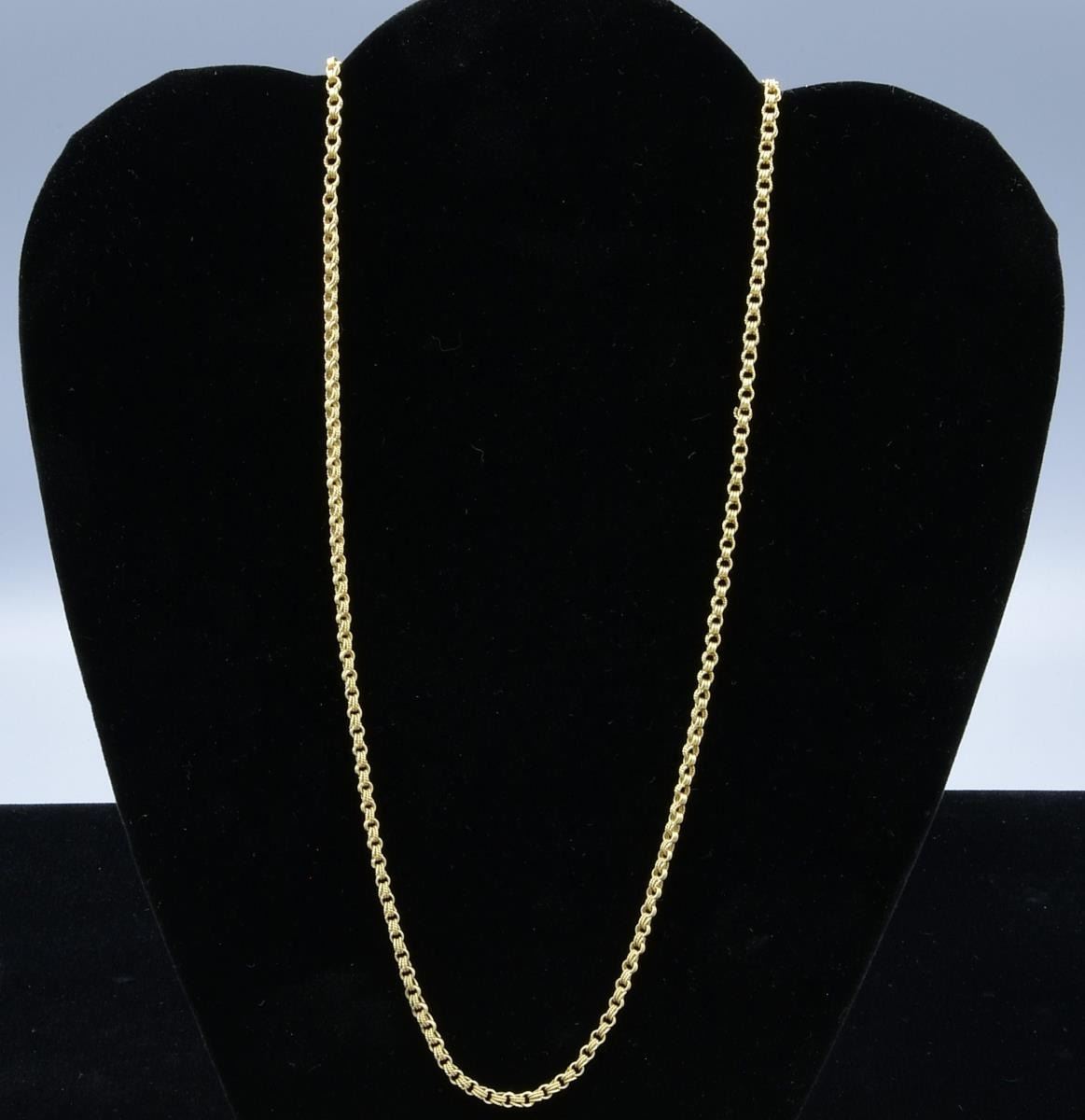 This lovely 14kt (tested) chain marked on clasp "750". SIZE: Total weight 18 grams and approx. 24" long. PROVENANCE: John Webber Estate, Bangor, Maine. CONDITION: excellent. (05-802-5/JJ). $350-550.