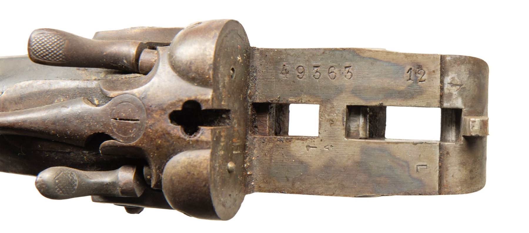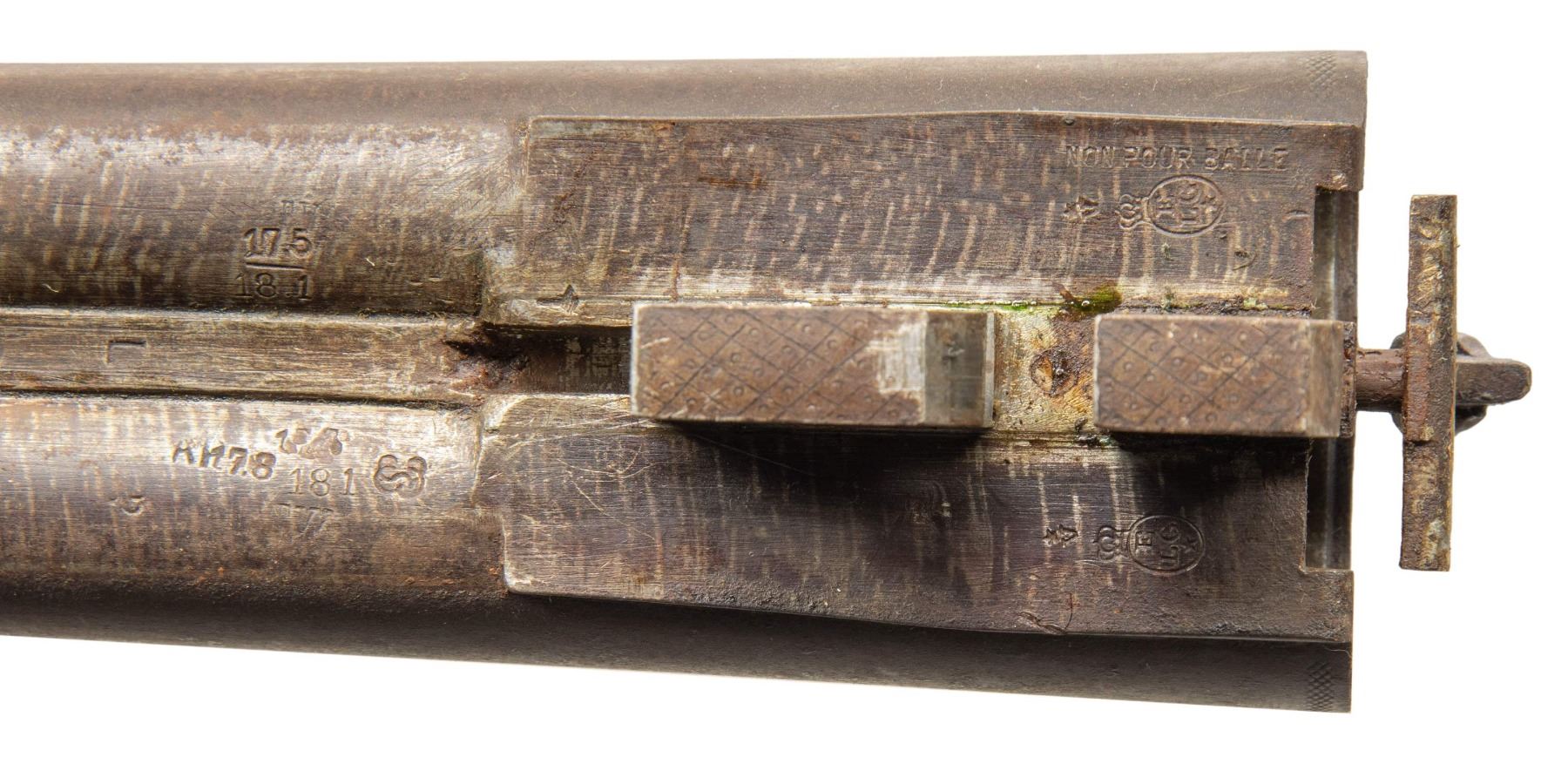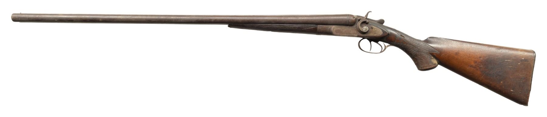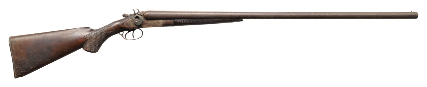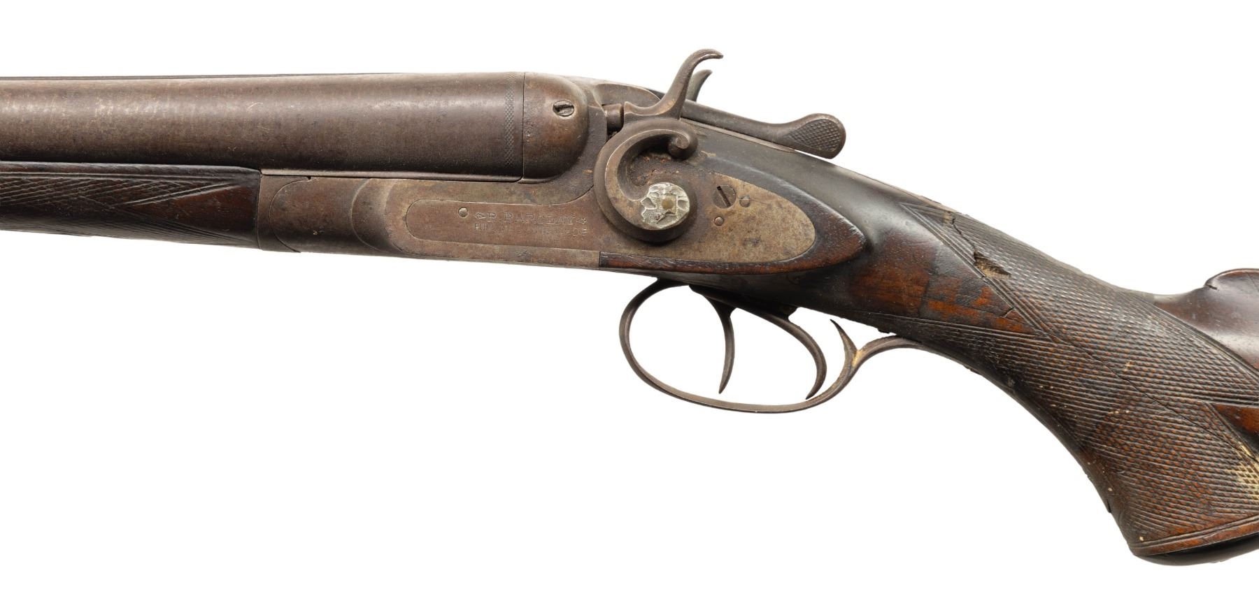 Cal. 12 Ga. S# 49363. The Laminated Steel 30" barrels have brass bead & 3-leaf clover rib extension. Water table has pre 1898 Belgian proofs as evident by "NON POUR BALLE" proof. Hammer action w/ top lever, dbl. triggers & extractors. Checkered walnut stock set w/ Deeley forearm release, oval toeline name plate, hard rubber grip cap & elk's head buttplate. CONDITION: metal has heavy patina & oxidized appearance. Fair worn wood with missing forearm tip, repaired break through wrist, deep handling marks & large piece missing from buttplate. Left hammer appears replacement w/ solder to lock. Pitted bores. Bores shows heavy pitting. (01-28898/MD). ANTIQUE. $200-300.