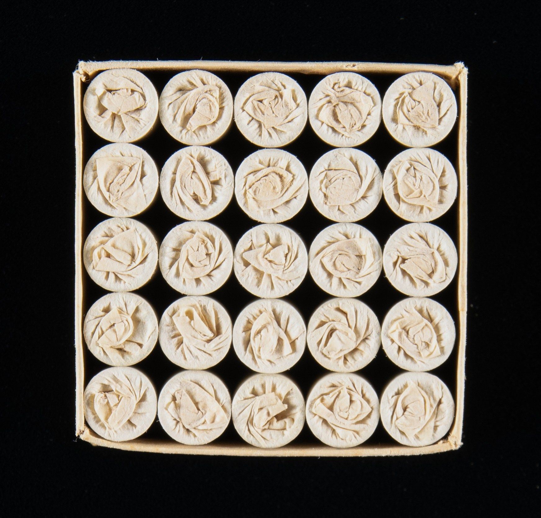 BULLETS. Full brown box of 25 paper patched bullets. CONDITION: box in good overall with lower box having clear tape reinforcement to corners & labels being torn & partially discernable. (02-25094/MD). $300-500.