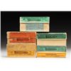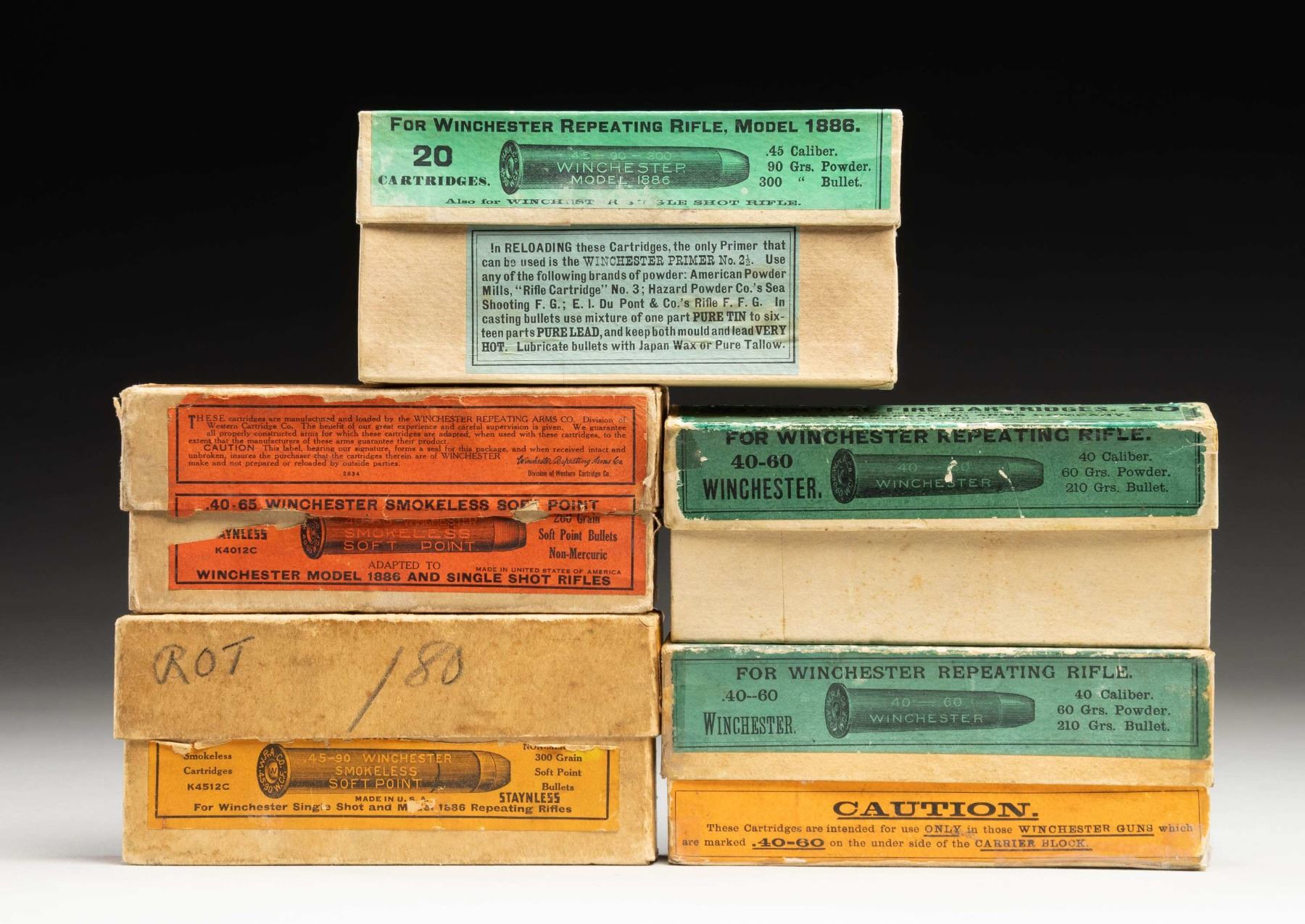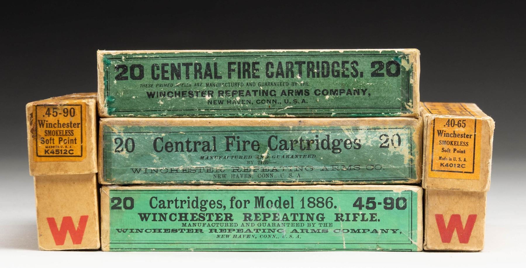 Very good appearing 20 round 2 piece boxes. 1). .40-60 caliber with headstamps of "W.R.A. Co. .40-60 W.C.F." yet varying fonts and degrees of patina; generally good plus with small copper colored dome profiled primers. 2). same as #1 yet cartridges appear to have been cleaned and lacquered looking very nice and with a sheen. 3). .40-65 caliber with headstamps of "W.R.A. Co. .40-65 W.C.F." having slight variances to degrees of patina; generally good appearance. 8 with lead bullets and large copper colored dome profiled primers. 7 with lead bullets and large brass colored dome profiled primers. 3 with silver jacketed bullets and brass colored dome profiled primers. 1 with copper jacketed bullet and brass colored dome profiled primer. 1 with copper jacketed bullet and brass colored dome profiled primer having circled "W" proof. 4). .45-90 caliber with 18 having headstamps of "W.R.A. Co. .40-60 W.C.F."; 1 lead and 17 jacketed. Generally very good with large silver colored dome profiled primers. 2 REM-UMC marked jacketed with more faded brass tone. Box cover marked "ROT 180"; likely code for cost and selling price. 5). .45-90 caliber in exceptional Winchester box having vivid bright green top label and sky blue side label. Cartridge headstamps are "W.R.A. Co. .45-90 W.C.F.". Lead bullets and brass colored dome profiled primers. Cartridges are also in exceptional condition. PROVENANCE: The Esteemed Norm Greenberg Collection. (02-24841-3/NW). 350-500.
