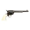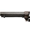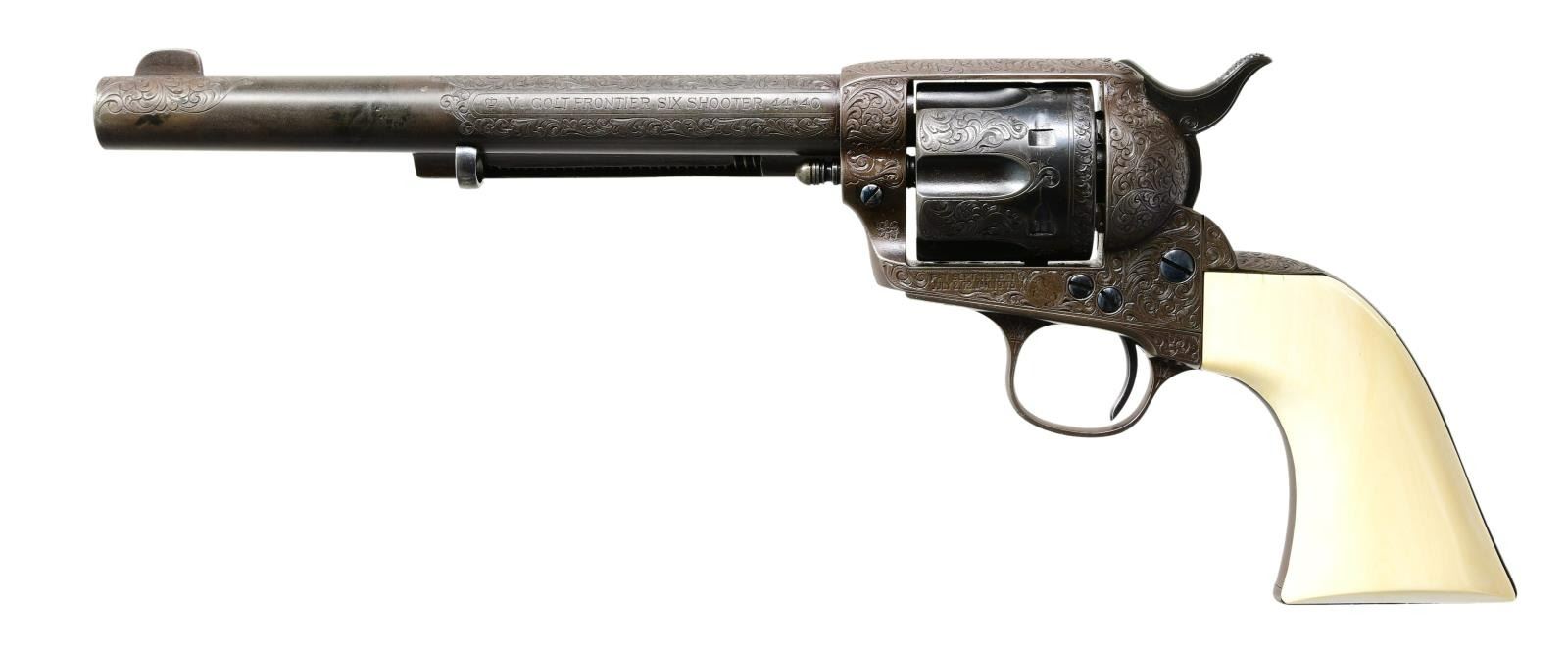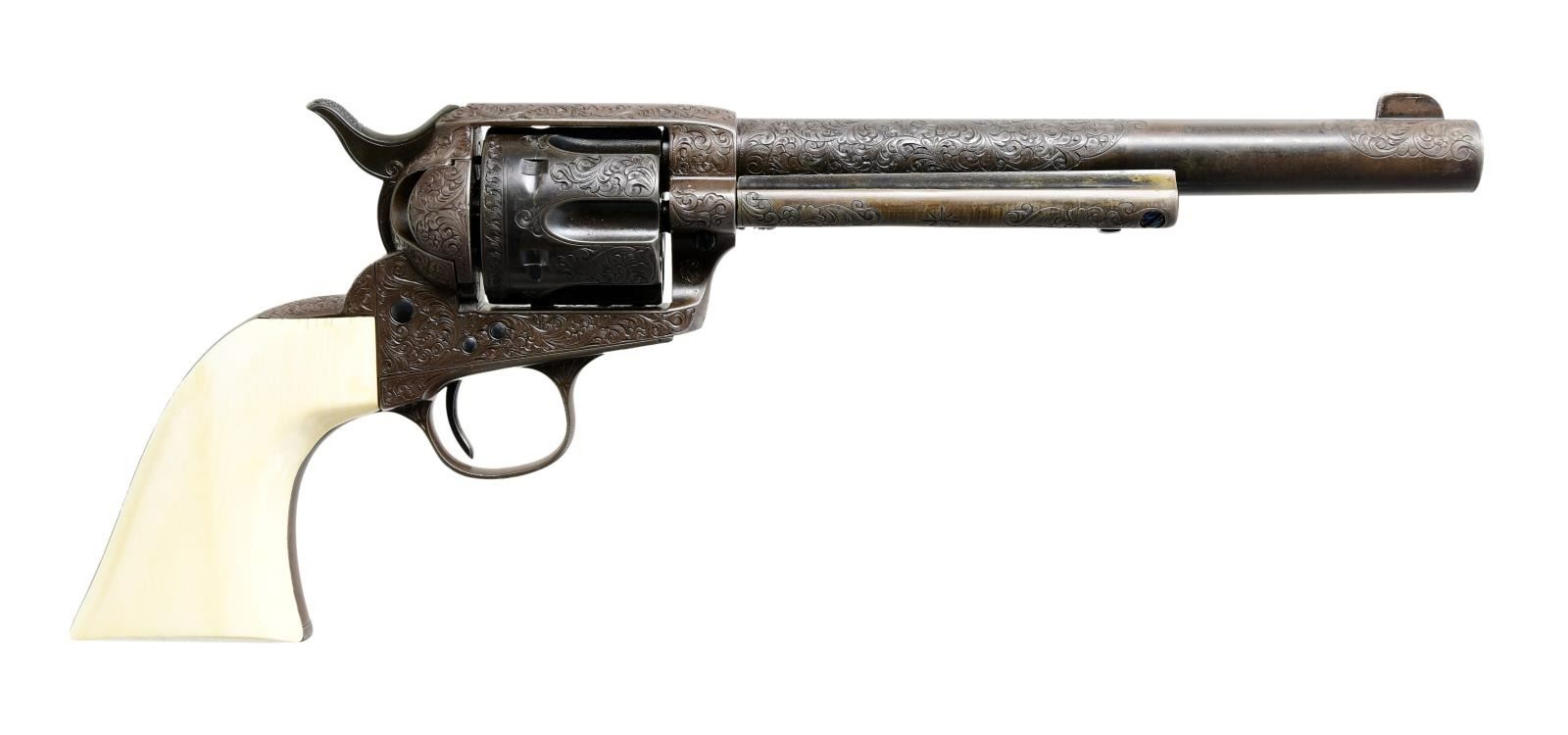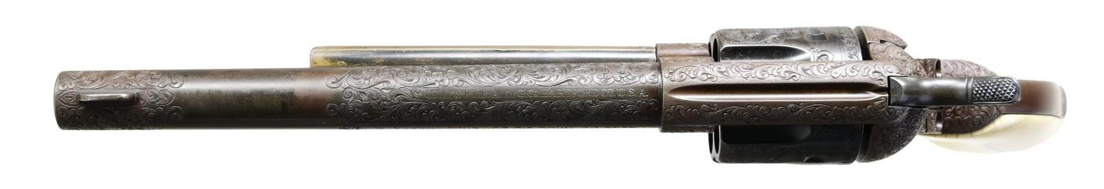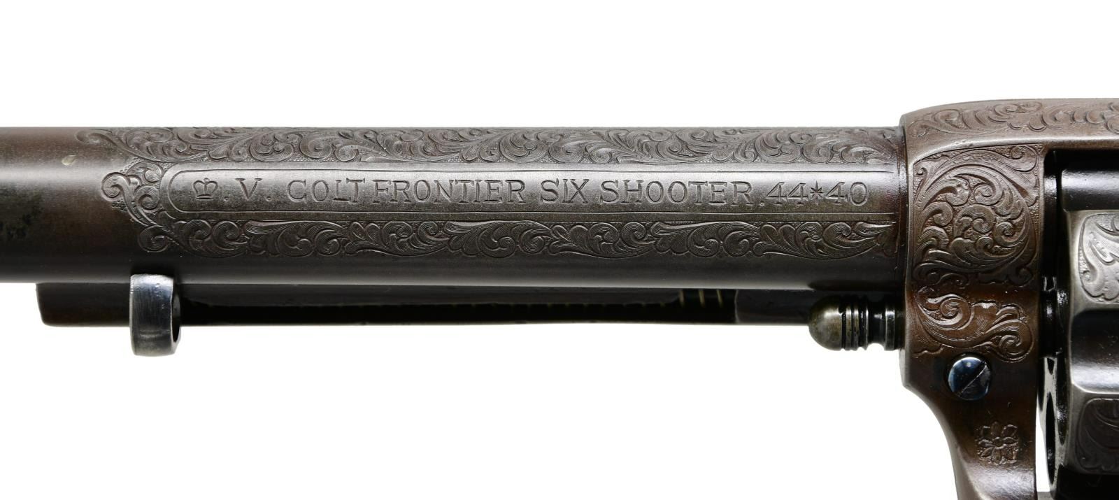 SAA REVOLVER. Cal 44-40. S# 177343 Mfg. 1898. Bbl. 7 1/2" with blade front sight. 6 Shot fluted cyl. Action, cyl. & bbl. tastefully custom engraved with 50% coverage floral scroll. Bbl. marked on left side in engraved panel with crown "V. COLT FRONTIER SIX SHOOTER 44*40" Bbl., cyl, trigger, hammer & screws are blued with action having a contrasting plum hue. 1 Piece smooth grips. CONDITION: metal components retain 80% custom finish over a few scattered dents with notable thinning on outer portion of ejector rod housing. Near excellent grips. Bright, shiny bore with sharp rifling having appearance of mild frosting at throat. (01-25306/BH) ANTIQUE. $7,000-10,000.