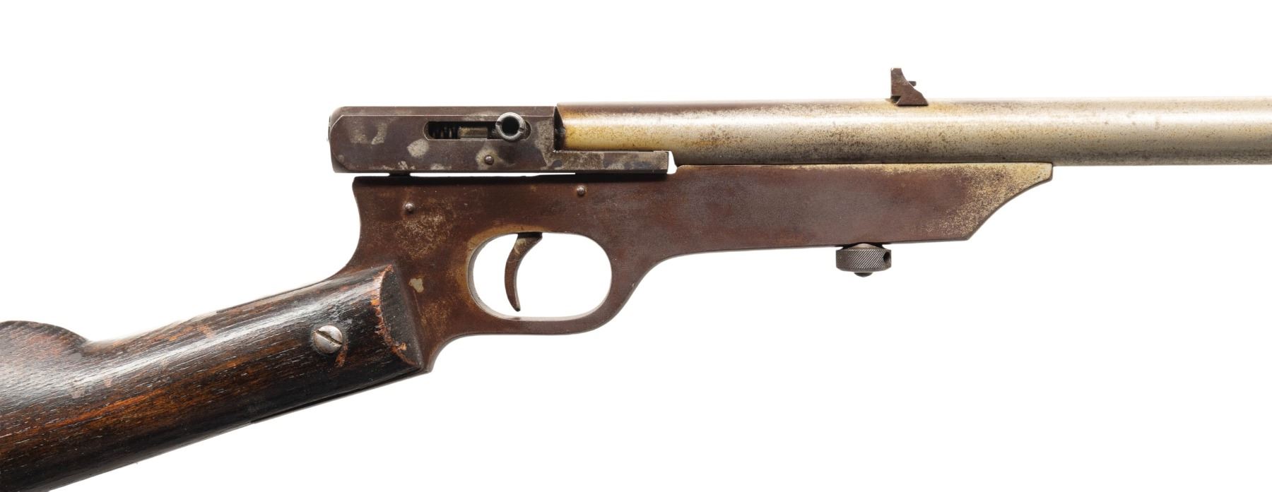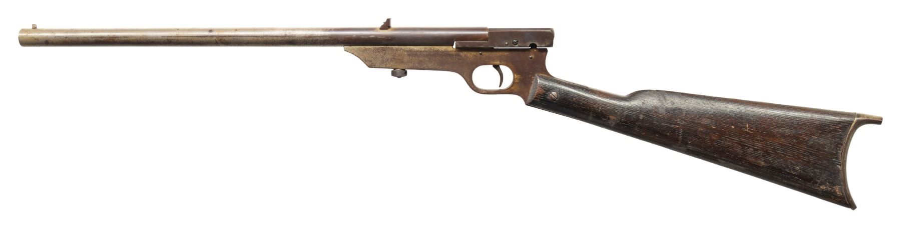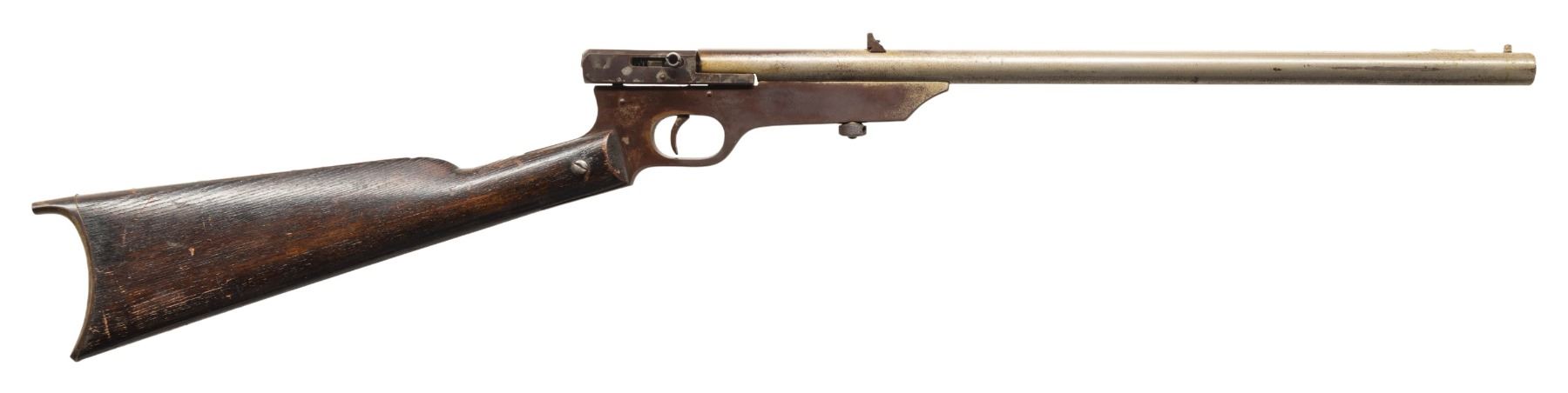 Cal. 22 S, L, BB. NSN. Mfg. 1890-1896. Nickel finished 18" bbl. Post front sight & adj. rear sight. Swivel breech. Nickel finished receiver. Walnut straight grip buttstock w/ iron crescent buttplate. CONDITION: large portions of frame & barrel has faded to brown patina with marks. Good appearing wood finish with large marks. Bore shows strong rifling with pitting. PROVENANCE: Estate of Groves Herrick. (01-28897/MD). ANTIQUE. $200-300.