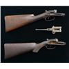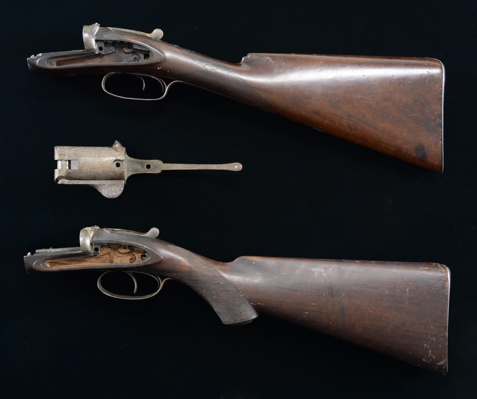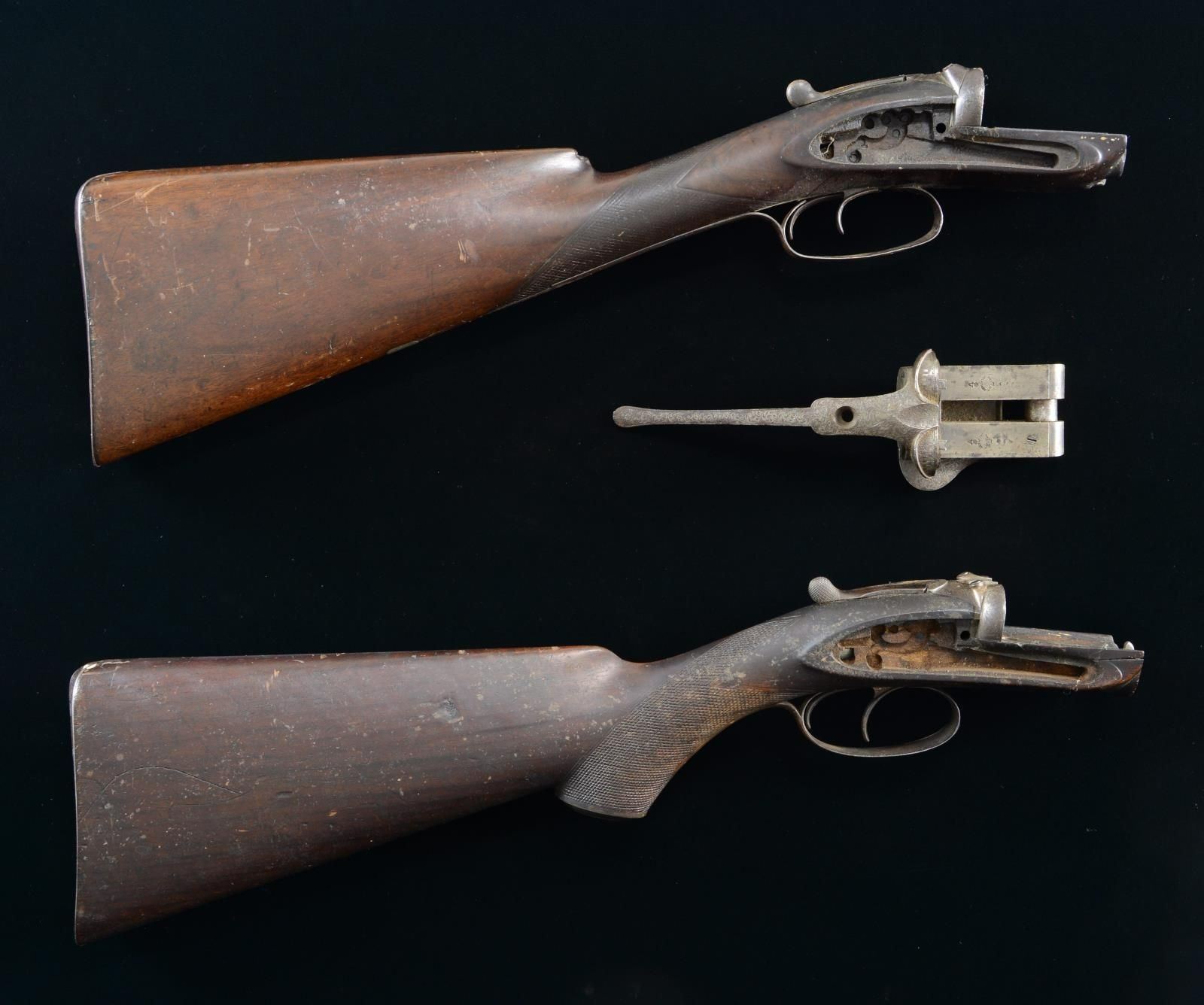 1) Crab Joint Westley Richards Frame Assembly. S# 113. Parts include a Westley Richards Crab Joint frame, double triggers, trigger guard, top lever, pistol grip stock, grip cap, & buttplate. CONDITION: front of stock shows a couple notable cracks w/ one having a glue repair. Stock otherwise shows a chip at toe, wear to checkering, scattered staining, dings, & handling marks. Metal is mostly a dull gray patina w/ scattered oxidation. (01-23904/MJC). 2) Dougall Patent SXS Pinfire Frame. S# 1488. Dougall frame w/ upper tang & right side lever. Action has floral engraving. CONDITION: frame is mostly a dull gray patina w/ scattered traces of case colors & some oxidation. (01-23905/MJC). 3) Antique Westley Richards SXS Frame Assembly. S# 1508. Parts include a Westley Richards frame, checkered butt stock, top lever, double trigger, trigger guard, & buttplate. CONDITION: stock shows heavy wear to checkering w/ a couple cracks, a couple chipped areas, scattered dings, & handling wear. Metal is mostly a gray patina w/ some pitting & scattered oxidation. (01-23906/MJC). ALL ANTIQUE. $1,000-1,500 for lot.