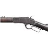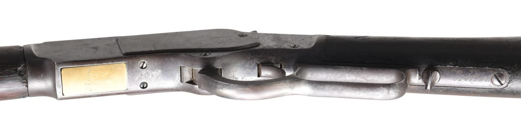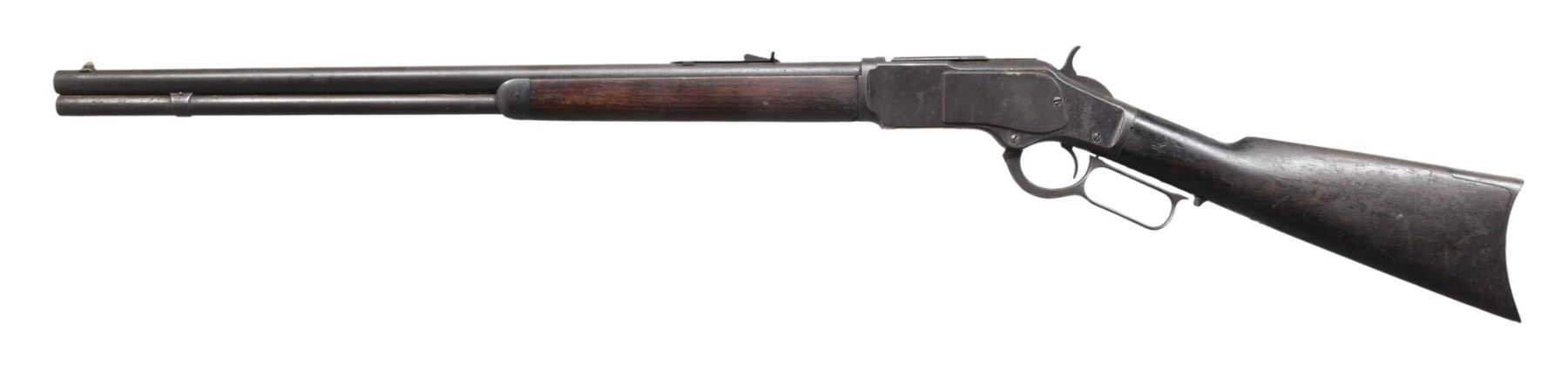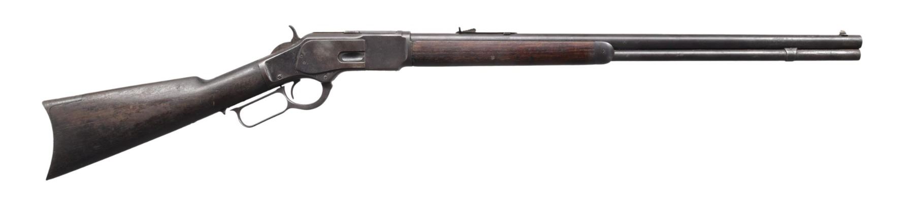 RIFLE. Cal 38-40. S# 314770B. Bbl. 24" round with German silver blade front sight & elevator adjustable sporting rear. Mfg 1889 with full blue metal finish. Uncheckered walnut straight grip stock & forend. CONDITION: metal retains traces of original blue finish in protected areas with balance displaying an overall brown patina along with areas of light to moderate pitting, notably at muzzle end of bbl. & mag tube. Bottom right side action screw appears replacement. Wood retains traces of original finish with scattered light scratches & dings. Receiver end of forend exhibits small wood losses on all sides. Dark bore retains intact rifling. Mechanically in need of attention as lifter does not drop when closing lever and must be manipulated manually. Trigger requires stronger than normal pressure to utilize. May just be in need of a cleaning but unable to verify for certain. Overall a nice of a well used, but not abused, Winchester 1873, "the gun that won the west". (01-25991/BH). ANTIQUE. $1,200-1,800