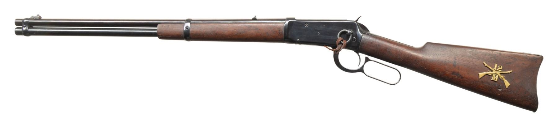 RING CARBINE. Cal. 30 WCF. S# 88911. Bbl. 20". Model 1894 lever action saddle ring carbine mfg. by Winchester in 1897. Top of the bbl. is marked with a mostly legible Winchester address, with the cal. designation and "NICKEL STEEL BARREL/ ESPECIALLY FOR SMOKELESS POWDER" marked towards the breech. Metal components exhibit a reapplied blue finish overall. Sanded and refinished single band fastened plain wood forearm and straight grip buttstock with steel carbine buttplate. Left side of buttstock is fitted with a U.S. 12th Infantry, Company M brass kepi insignia, with 2 Mexican coins inlaid on the right. Left side of receiver features a contemporary replacement saddle ring stud and ring. Apparent King (patent markings mostly illegible) triple bead front sight with period aftermarket V-notch rear sight. Upper receiver tang has been drilled with an extra hole, likely for a tang sight attachment. CONDITION: metal components retain the vast majority of their reapplied blue finish, exhibiting some superficial handling marks, spots of surface oxidation, as well as some light pitting beneath the bluing. Buttplate exhibits patches of mild to moderate oxidation around the peak. Dark bore, exhibiting consistent mild to moderate pitting, while retaining fair to good rifling throughout. Proper manual mechanics. Wood furniture shows scattered marks from handling and storage, with a crack present on the left side of the forearm, ahead of the bbl. band. (01-28185/MLW). ANTIQUE. $500-900.