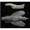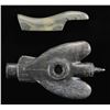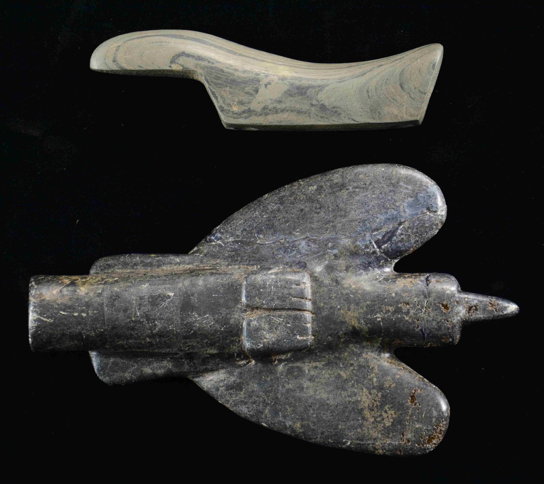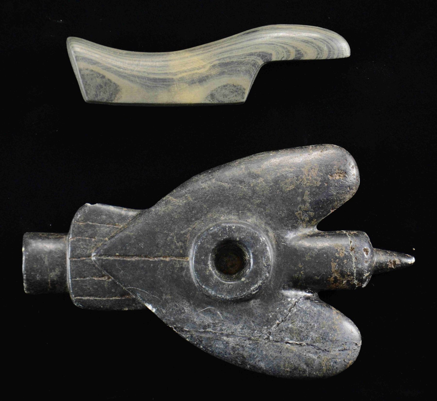 "BIRD EFFIGY PIPE". Stylized bird in flight measures 6.5" x 4" black polished stone. Accompanying pipe is an unknown polished stone tool with two holes drilled for cords. CONDITION: unknown tool is very good, bird pipe is broken in four pieces and glued back together. (02-22637/JS). $200-300.