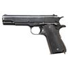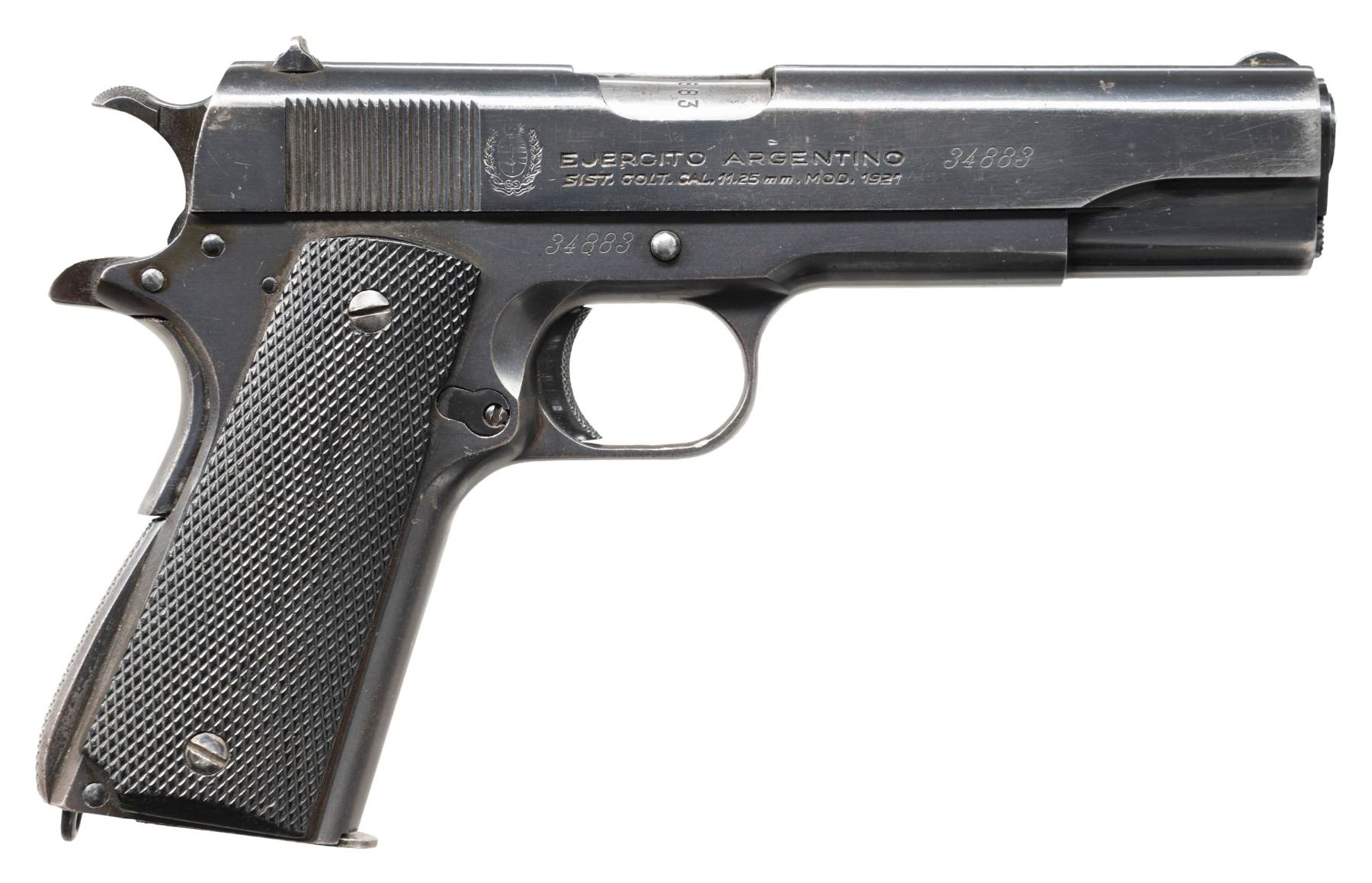 PISTOL. Cal. 11.25mm (45 ACP). S# 34883 (1947). A licensed copy of the Colt 1911A1 mfg. in Argentina. Matching number on 5" barrel & slide. Black plastic grips. MAGS: 1 - 7 rd. numbered "56535". CONDITION: good original blued finish with light oxidation & wear. Very good grips. Good rifling with light frosting. (25-6550/MD). CURIO. $500-750.