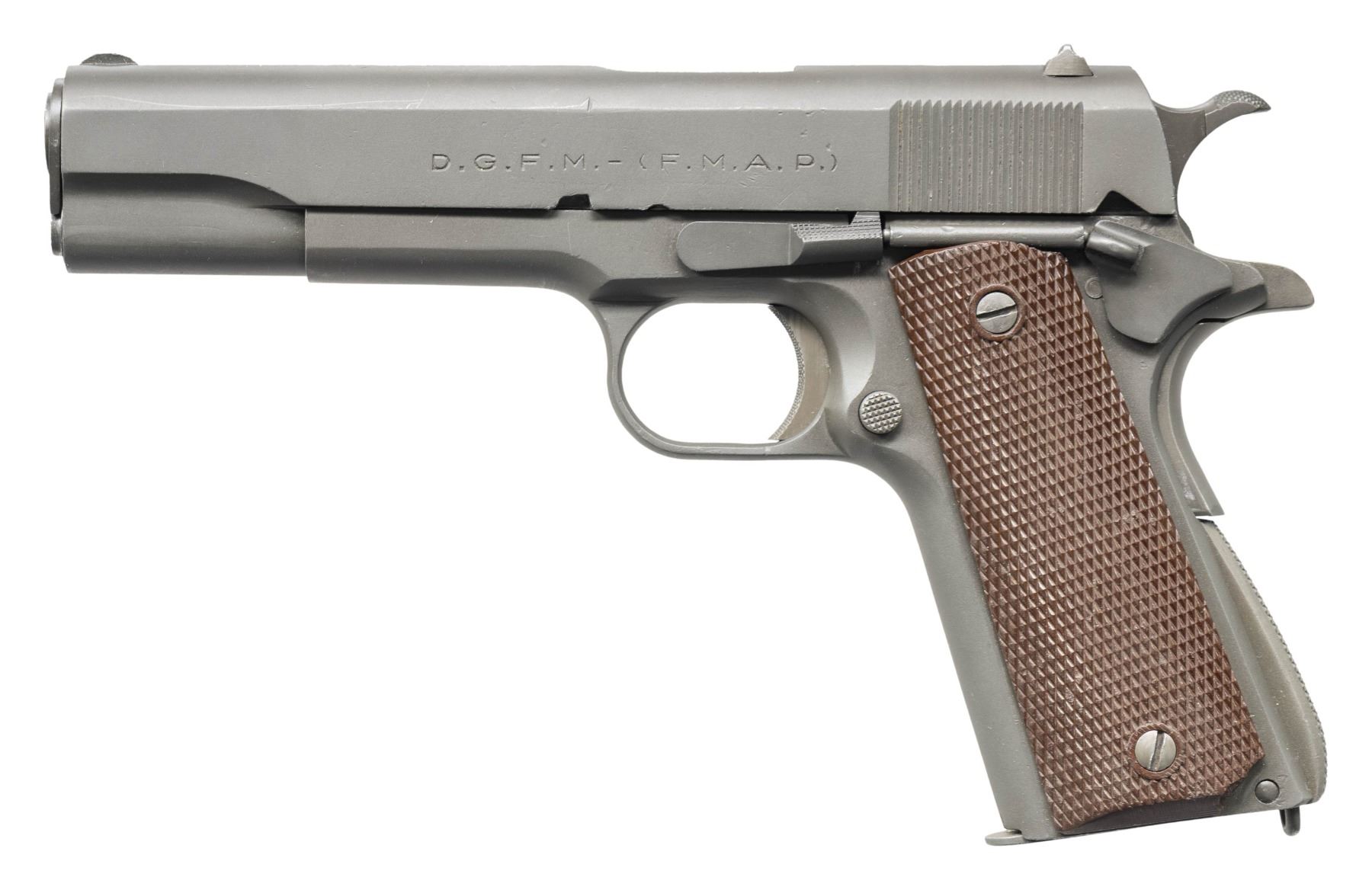 AUTO PISTOL. Cal. 11.25MM (45 ACP). S# 31369 (1946). A licensed copy of the Colt 1911A1 mfg. in Argentina. Matching number on 5" barrel & slide. Replacement Keyes Fiber grips. MAGS: 1 - 7 rd. numbered "6279". CONDITION: very good parkerized refinished metal with prior marks. Good grips with some wear to diamonds. Good rifling with fouling in grooves. (25-5254/MD). CURIO. $800-1,200