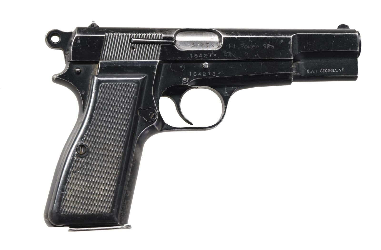 Cal. 9mm Luger. S# 164278. Bbl. 4 5/8". Round blade front sight. U-notch rear sight. Hi Power clone produced under FN license in Argentina by D.G.F.M. All visible matching numbers. Rear right of slide has "(Star)/N" proof. Right side of slide has Century import markings. Safety is stiff but functional. Arsenal black enamel finish. Checkered black grips. No lanyard ring present. MAGS: 1-13 rd. in fair condition w/ worn finish & oxidation. CONDITION: grips show some dirt staining, chipping near right screw hole, scattered dings & handling marks. Metal retains 70% arsenal black enamel w/ scattered flaking most notably on the front strap. Good plus bore that is bright for much of its length w/ a few light pits & some frosting. (23-6945/MJC). MODERN. $800-1200.