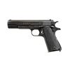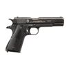 Cal. 11.25MM (45 ACP). S# 75346 (1952). A licensed copy of the Colt 1911A1 mfg. in Argentina. Matching number on "5 barrel & slide. Left side of the slide has remnants of the stamp "CATURA". Left side of the frame has inventory number "0952". Two-piece black plastic grips; the left panel appears to be a replacement. MAGS: 1–7 rd., numbered "75375". CONDITION: pistol has an export-reblued finish over prior pitting (concentrated around grips on the frame) with handling marks, scratches, & wear. Fair right panel with two worn spots; good left panel with marks. Barrel has a reblued finish; a very good bore with strong rifling and a couple of spots of light pitting. (23-6884/MD). CURIO. $1,000-1,500.