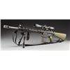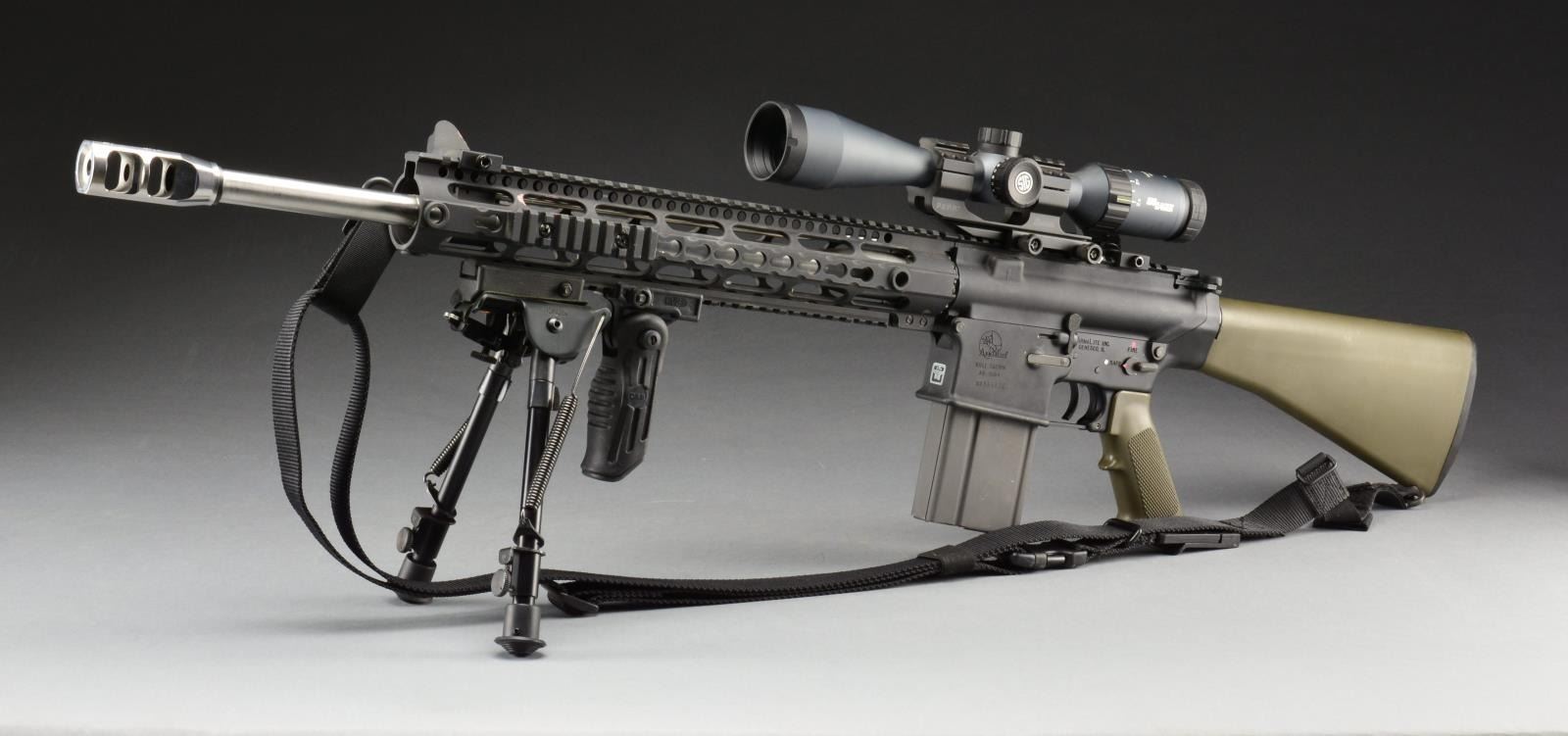 Cal. 7.62 MM. S# US566636. Bbl. 20". Heavy stainless bbl. terminated w/ threaded muzzle & JP muzzle brake. YHM low profile gas block. Midwest Industries slim line Keymod rail w/ 11" picatinny rail surface added at 6:00. Regulated picatinny rail at 12:00 to provide over 22" of mounting space. QD sockets front & rear on both sides. Harris type telescoping tubular bipod in front of CAA FVG mounted on forend. Currently sporting a Sig Sauer Whiskey 5, 2-10x42 scope w/ duplex crosshairs & illuminated aiming point. AUKMONT 45 degree offset sights, protected post at front w/ A2 windage & elevation adj. rear sight. Ambidextrous safety/ selector w/ red & white painted dots to signify Safe/Fire. Extended mag release. OD green A2 style pistol grip & full length 10 1/2" shoulder stock w/ trap door. Black nylon Blackhawk sling. MAGS: 1 metal 20 rd. CONDITION: exterior finish is complete & correct w/ gentle thinning only in areas of mechanical intervention. All outward appearances indicate very little use. Shiny bore w/ strong rifling & fire control mechanism appears to function correctly when cycled by hand. (21-1465/JZ). MODERN. $1,800-2,400.
