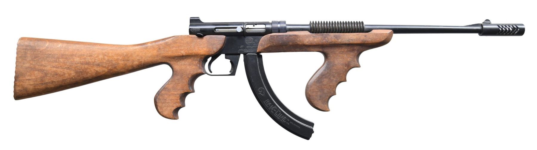 Cal. 22 LR. S# 58529. Bbl. 16" with fins & muzzle brake. Ramped blade front sight. Aperture rear sight. Thompson style AR-7 Explorer rifle made in Costa Mesa, CA. Matte black finish. Hardwood Thompson style stock set with vertical foregrip. MAGS: 1-25 rd. Ramline made. CONDITION: stock set shows some black staining, handling marks, light dings & flaking finish. Metal retains 92% black enamel finish with some oxidation spots, handling marks & light flaking. Mag release is stiff but action is otherwise functional when hand cycled. Very good + bright bore. (25-2163/MJC). MODERN. $400-600.