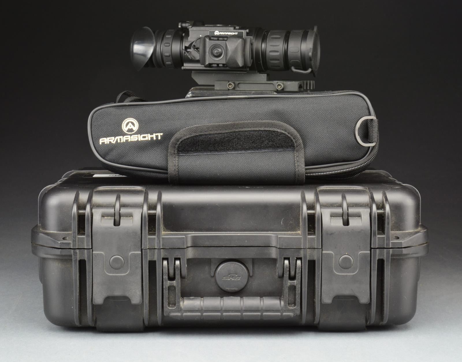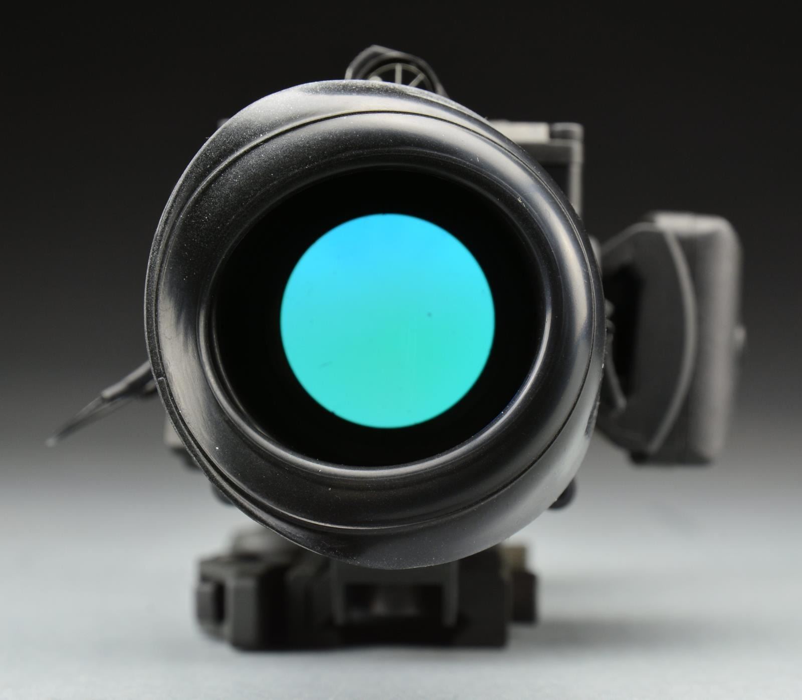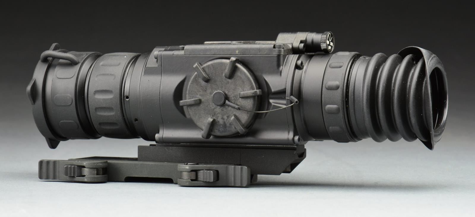 S# 98201. Finally there are optics on the market that rival those seen in grainy news footage & available in video games for years. The only sight that may be more desirable than night vision is thermal imaging. Effective day or night w/ out the use of any residual light source what so ever, the Zeus 4 utilizes the proven 160 x 120 microbolometer core & has the ability to cut through dust, smoke, fog, or haze. W/ a refresh rate of 30 Hz imaging is natural & smooth. W/ magnification starting at 4x, targets become closer & easier to identify. This system utilizes a digital reticle w/ a field of view of approximately 8°. Several temperature imaging modes (palettes) including white hot, black hot, fusion & rainbow. Six digital reticle patterns line dot, crosshair & dot 4 MOA. Powered by two CR-123 batteries. Mounts on standard picatinny rail surface & utilizes a QD mounting system. UNATTACHED ACCESSORIES: factory paperwork, video cable, advanced wireless remote control, fitted hard case & black canvas carry pouch. CONDITION: all outward aspects indicate well cared for use in controlled environments. (02-14440/JZ). $2,000-3,000.