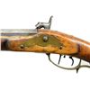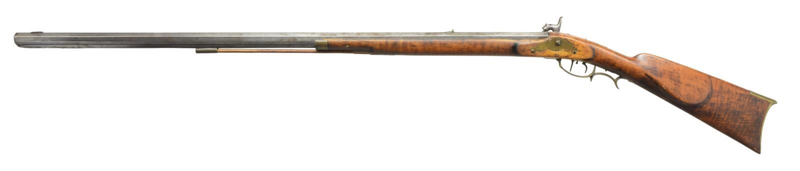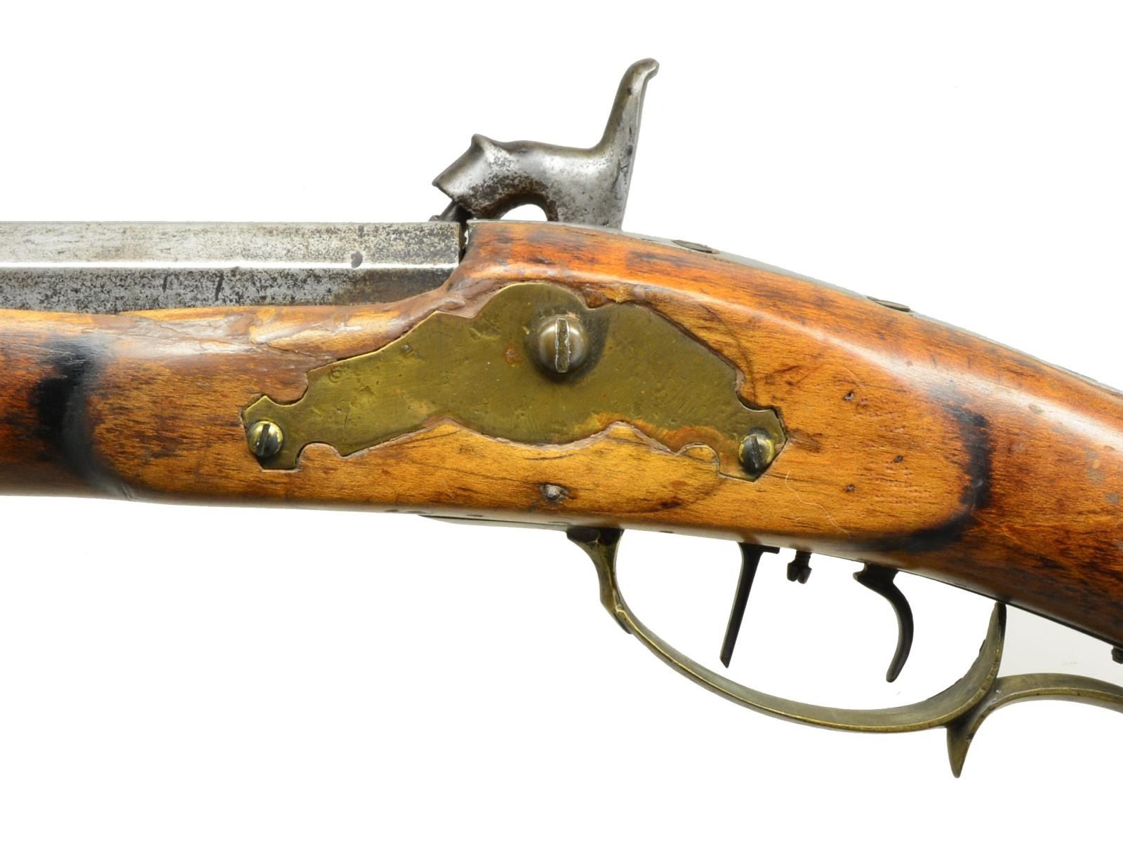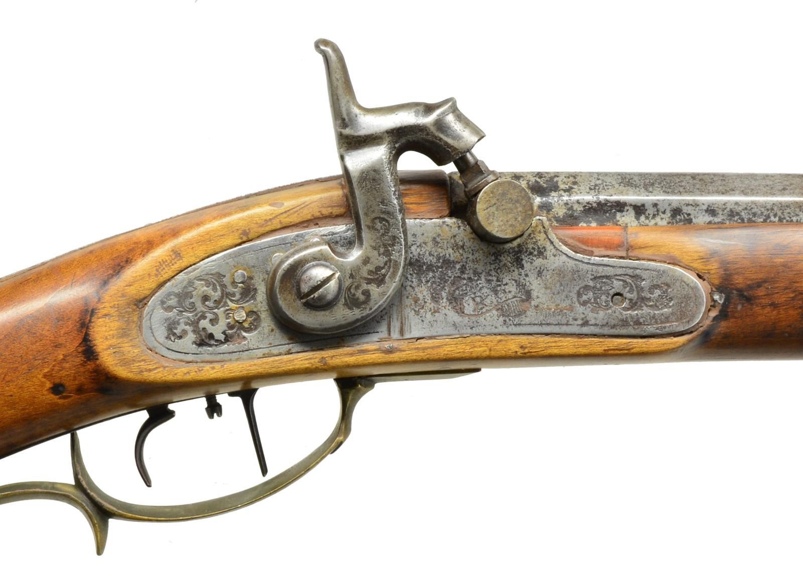 CONVERSION RIFLE. Cal. 36. NSN. Bbl. 36" oct. measuring 7/8" across flats. Top flat marked "ARMFIELD" followed by "5". Brass blade front sight w/ fixed V-notch rear sight. Bolster style conversion. Replacement trade percussion lock w/ scroll ornamentation & "R.B." marking in ribbon. Dbl. set triggers. Wedge fastened cheekpiece walnut stock w/ brass crescent buttplate, engraved finger curl trigger guard, sideplate, forearm cap & thimble. Broken ramrod is held in the remaining brass pipe, front pipe is missing. CONDITION: heavily cleaned gray metal reacquiring a mild tarnish w/ pitting becoming heaviest in breech area. Refinished stock w/ epoxy around lockplate, cracks in sideplate area having added wood behind hammer & above forward portion of lockplate. Functioning lock & triggers. Replacement nipple. Dark lightly pitted bore retaining deep rifling. (01-19146/DS). ANTIQUE. $400-600.