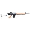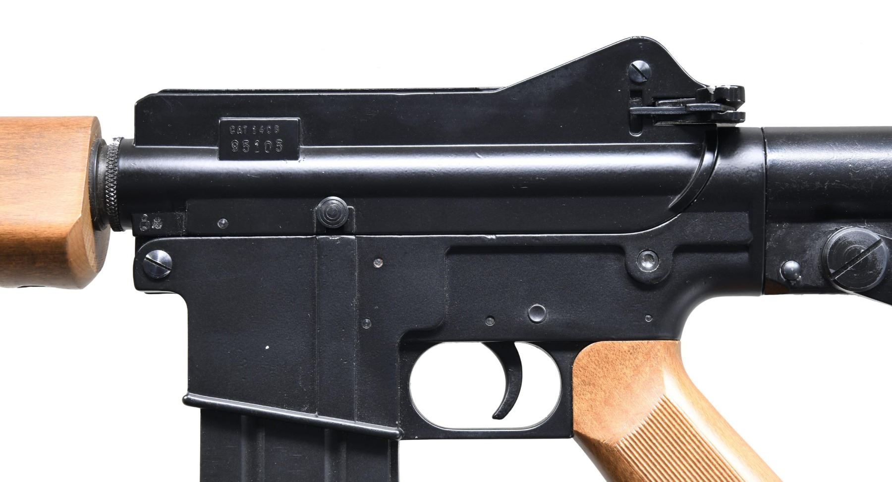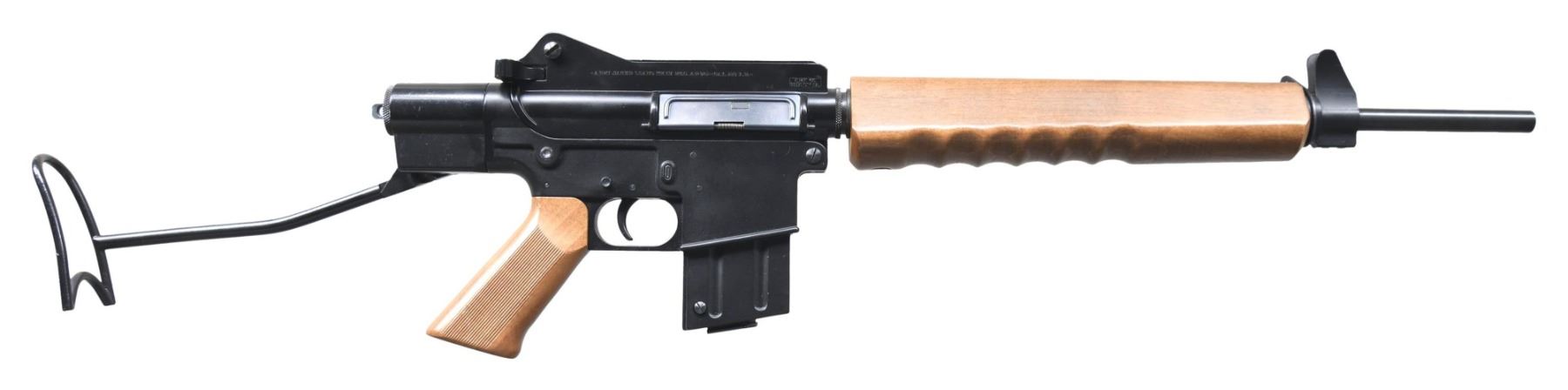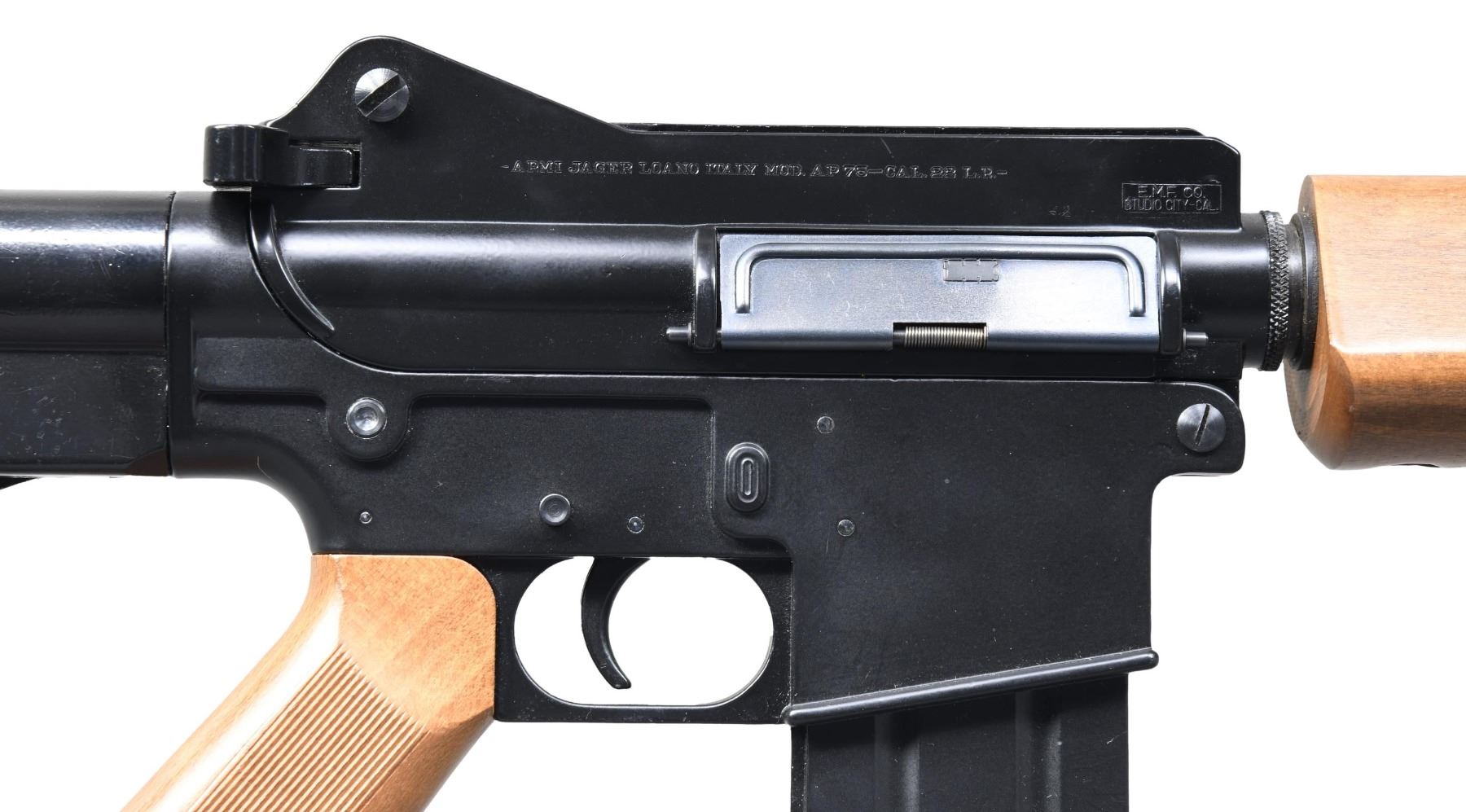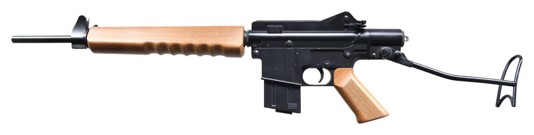 Cal. 22 LR. S# 95103. Bbl.18.5".  The Jager AP75 was designed at the time to be a reasonable facsimile of the AR-18, chambered in .22LR.  Blued barrel w/ dark black receiver finish. Protected post front sight. Wood forend w/ matching serrated wood pistol grip.  Bottom folding black metal wire stock. Cross slide safety above trigger.  MAGS:1 factory 15 rd. CONDITION: Finish complate & consistent w/ only a few gentle signs of prior use. Bore is bright w/ strong rifling. Fire control mechanism appears to function correctly when cycled by hand. (25-2230/JZ). MODERN. $300-500.