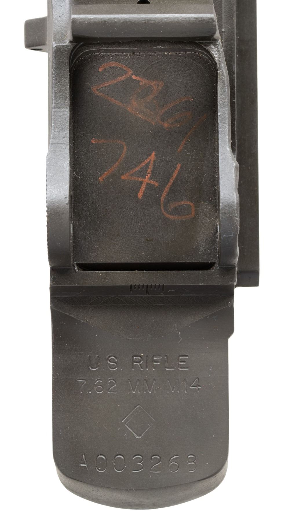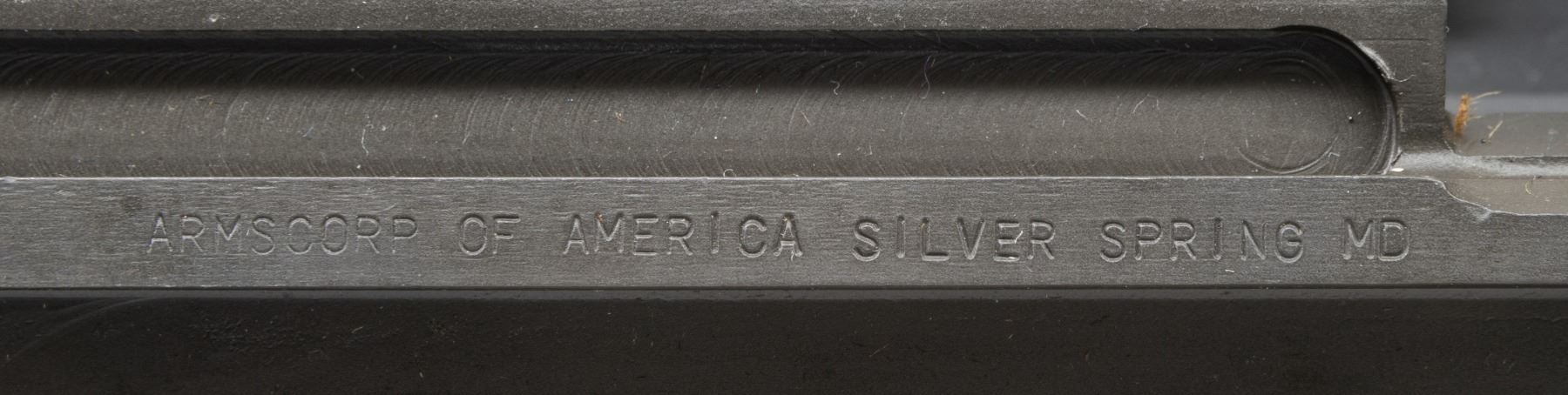 ARMSCORP of America produced both billet machined & investment cast receivers of high quality. S# A003268. This investment cast receiver is marked at heel "U.S. RIFLE / 7.62MM M14 / ARMSCORP logo / serial number". Marked on right receiver rail "ARMSCORP OF AMERICA SILVER SPRING MD". Marked inside rear of receiver "109". Receiver contains no additional parts. CONDITION: unfitted receiver appears near new. (25-2947/RW). MODERN. $300-500.