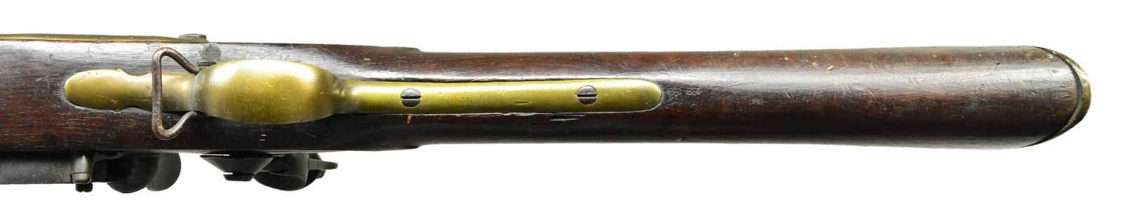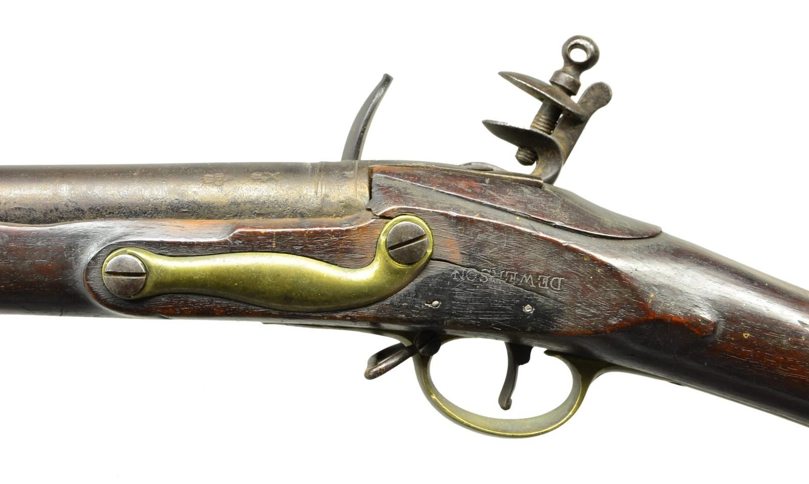 MUSKET & BAYONET CIRCA 1810. Cal. 75. S# NSN. Bbl.39.25". Standard configuration of 1793 pattern made last in 1815. Tower & GR cypher marked lock, broad arrow proofs on lock & barrel. This is an honest example of War of 1812 era Brown Bess musket. 17.25” blade bayonet proofed and contract maker stamped “J. HILL”. CONDITION: very good overall, all original, complete, & matching, smooth iron patina, pitting at breech, barrel bright where protected by attached bayonet. Mechanics fine, strong springs, clear dark smooth bore. Stock sound, stamped “DEWERSON” opposite lock. Bayonet matches well. (01-22774/JS). ANTIQUE. $2,000-3,000.