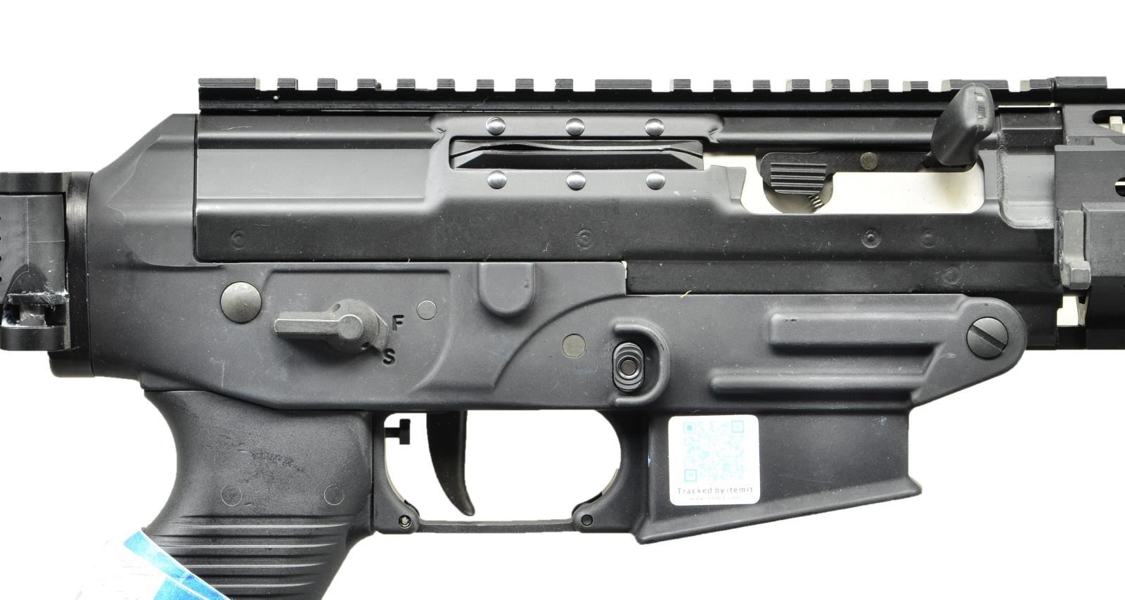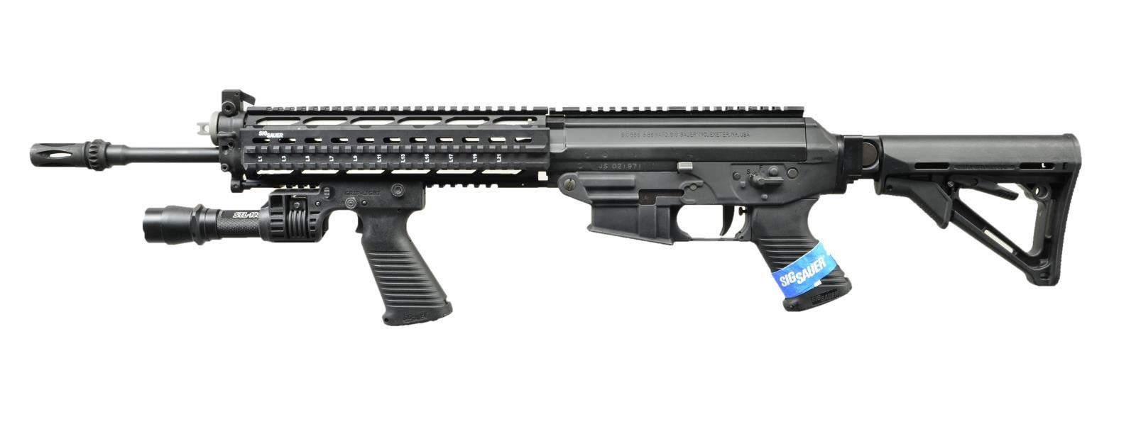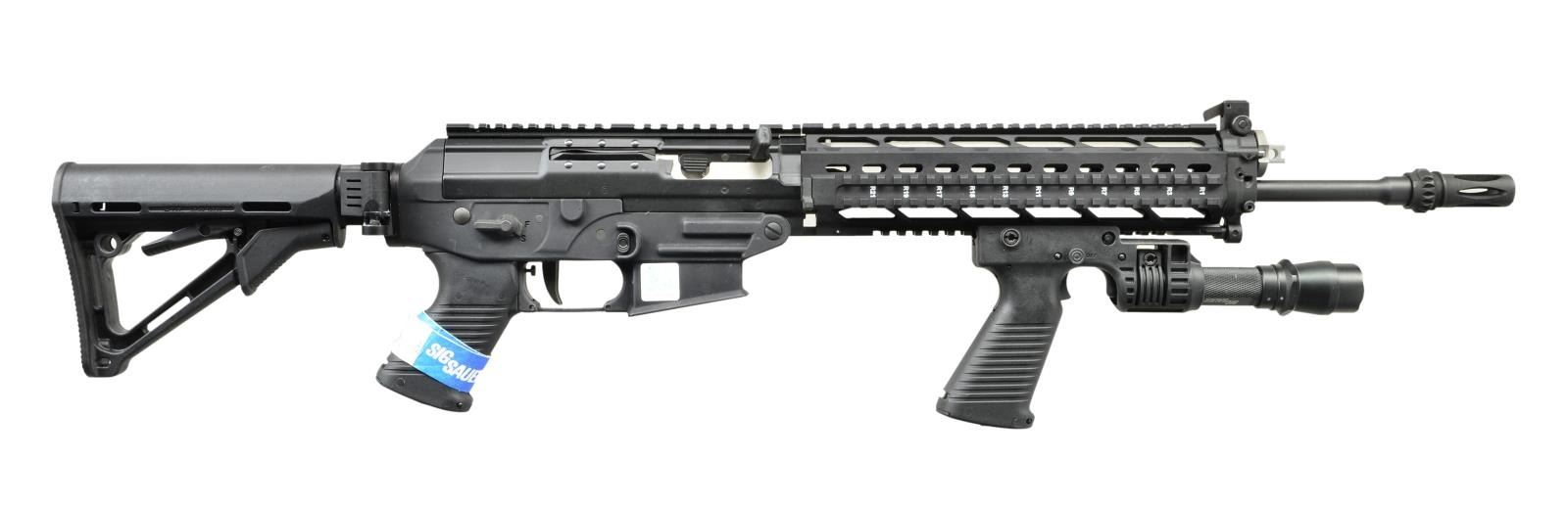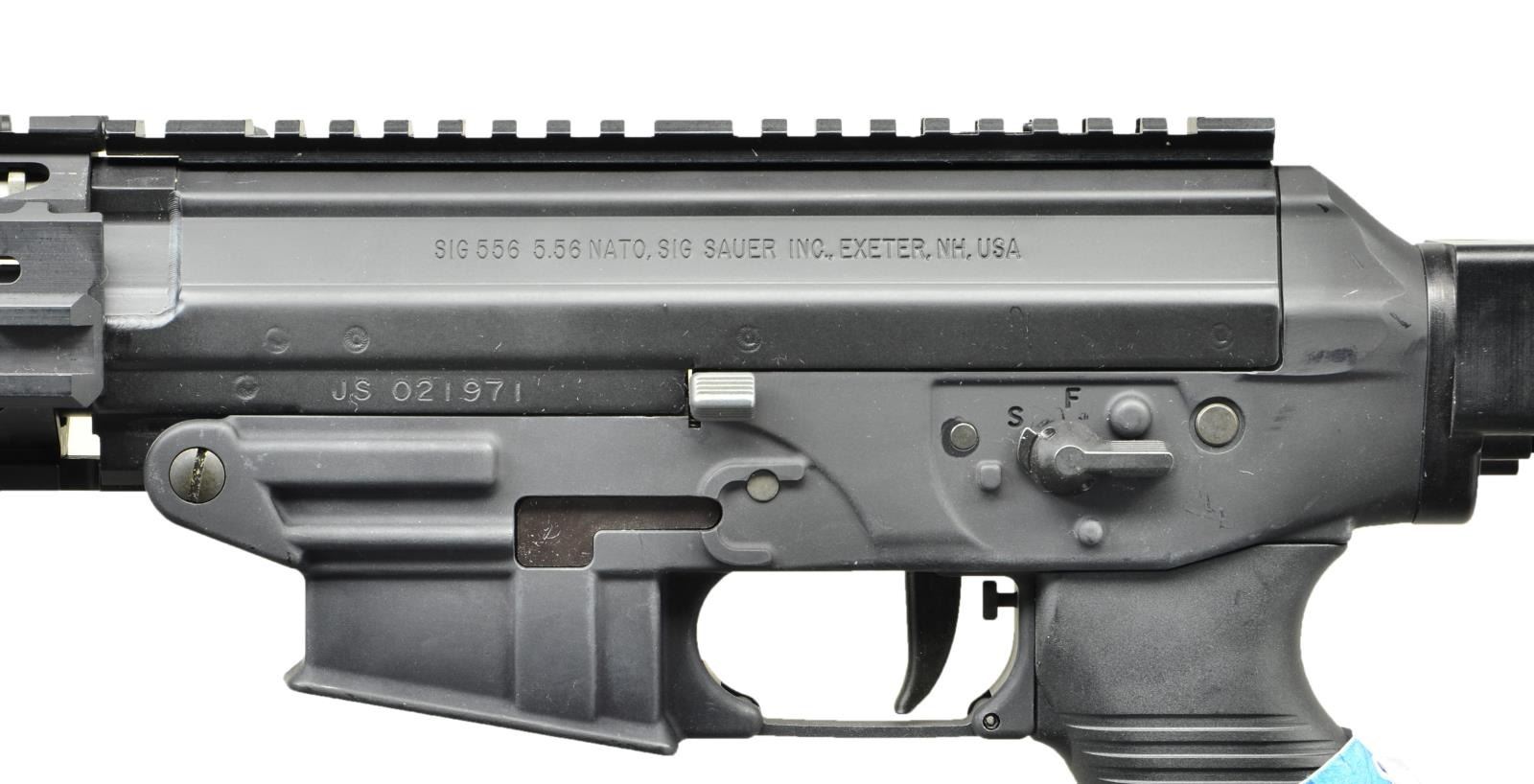 Cal. 5.56mm. S# JS021971. Bbl. 18" over muzzle brake which also functions as QD adapter for sound suppressor. New Hampshire, USA mfg. Sig 556 carbine. Black finish on all exposed metal surfaces as well as pistol grip & stock. Gas operated semi-automatic rifle w/ flat top upper receiver, allowing 18.5" of mounting space. Forward rail system has 10" MIL-STD mounting surfaces at 3, 6 & 9 o'clock. Flip up blade front sight w/ folding rear peep sight that recesses entirely below rail surface for optic mounting when desired. Right side reciprocating charging handle. Ambidextrous safety/selector. Right side folding, 5 position collapsible MagPul stock. Sig Grip-Light mounting system w/ vertical pistol grip in black mounted at 6 o'clock below bbl. Currently hosting Sig STL-100 light. MAGS: none. CONDITION: all outward appearances indicate this firearm is as new. Still retains Sig factory grip wrap. Unable to verify flashlight function, no batteries. Bright shiny bore w/ sharp rifling. Fire control mechanism appears to function correctly when cycled by hand. (22-235/JZ). MODERN. $1,000-1,500.