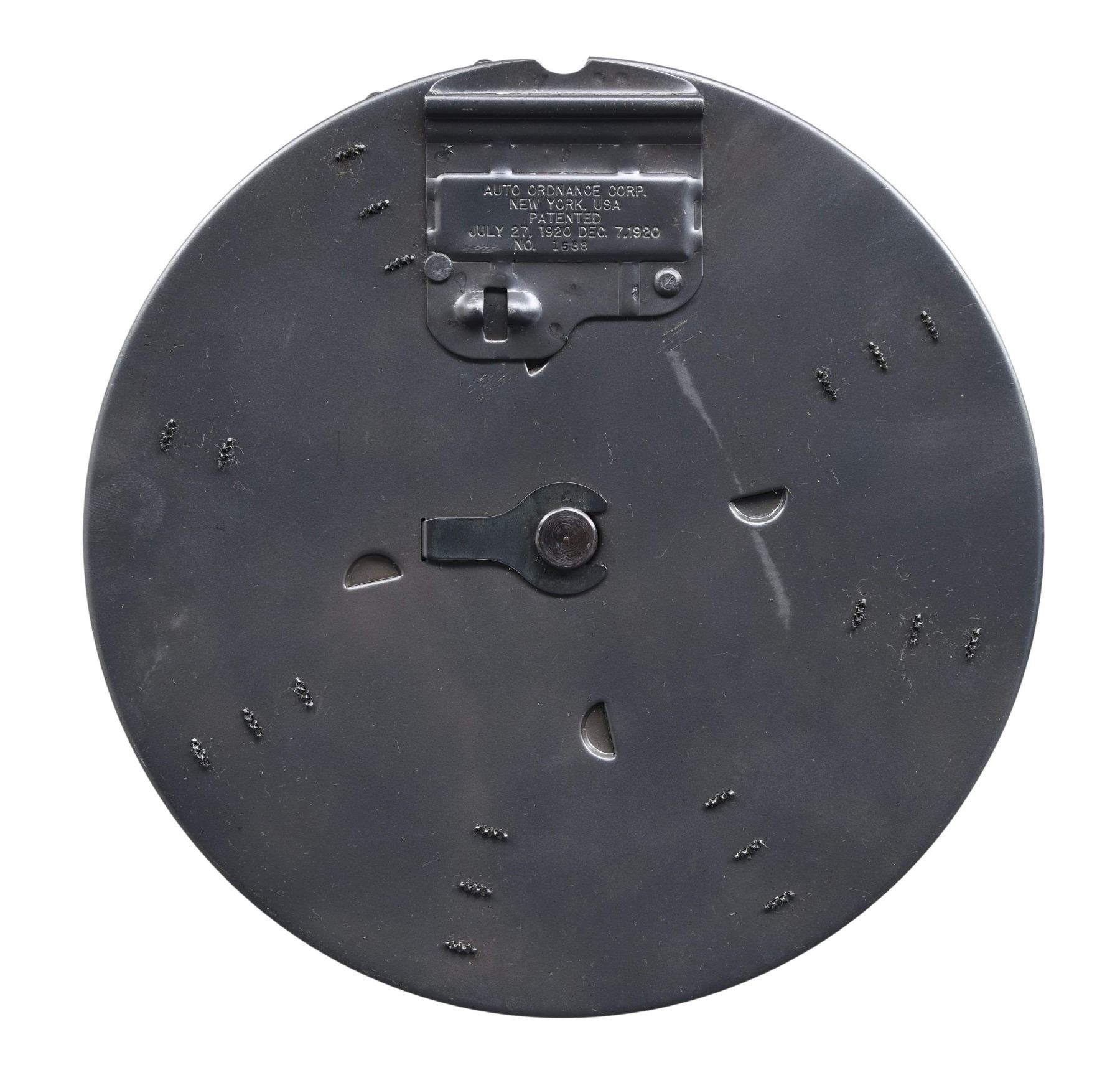 DRUM. A beautiful 100rd. Thompson C Drum, reminiscent of the "Chicago Typewriter" era. Manufactured by Auto Ordnance Corporation. Front data plate has vertical ribs & round rivets, marked; "MAGAZINE TYPE C / THOMPSON SUBMACHINE GUN / 100 CARTRIDGES CAL 45 / WIND TO 15 CLICKS/ NO 1688" & body marked "WIND TO 15 CLICKS" w/ trademark Thompson bullet logo. Rear data plate marked AUTO ORDNANCE CORP. / NEW YORK, USA / PATENTED / JULY 27, 1920 DEC. 7, 1920 / NO. 1688". Solid center pin. Blued rotor. UNATTACHED ACCESSORIES: Factory box & paperwork. CONDITION: All aspects, externally & internally demonstrate very little use, if any. It was received in the original cardboard box, lightly oiled, in bubble wrap. Finish coverage is complete & consistent w/ no noticeable wear. PROVANANCE: Lifelong Collection of Terrence McCarty. (02-21797-8/JZ). $800-1,600.
