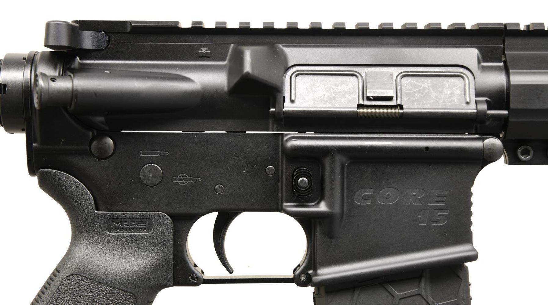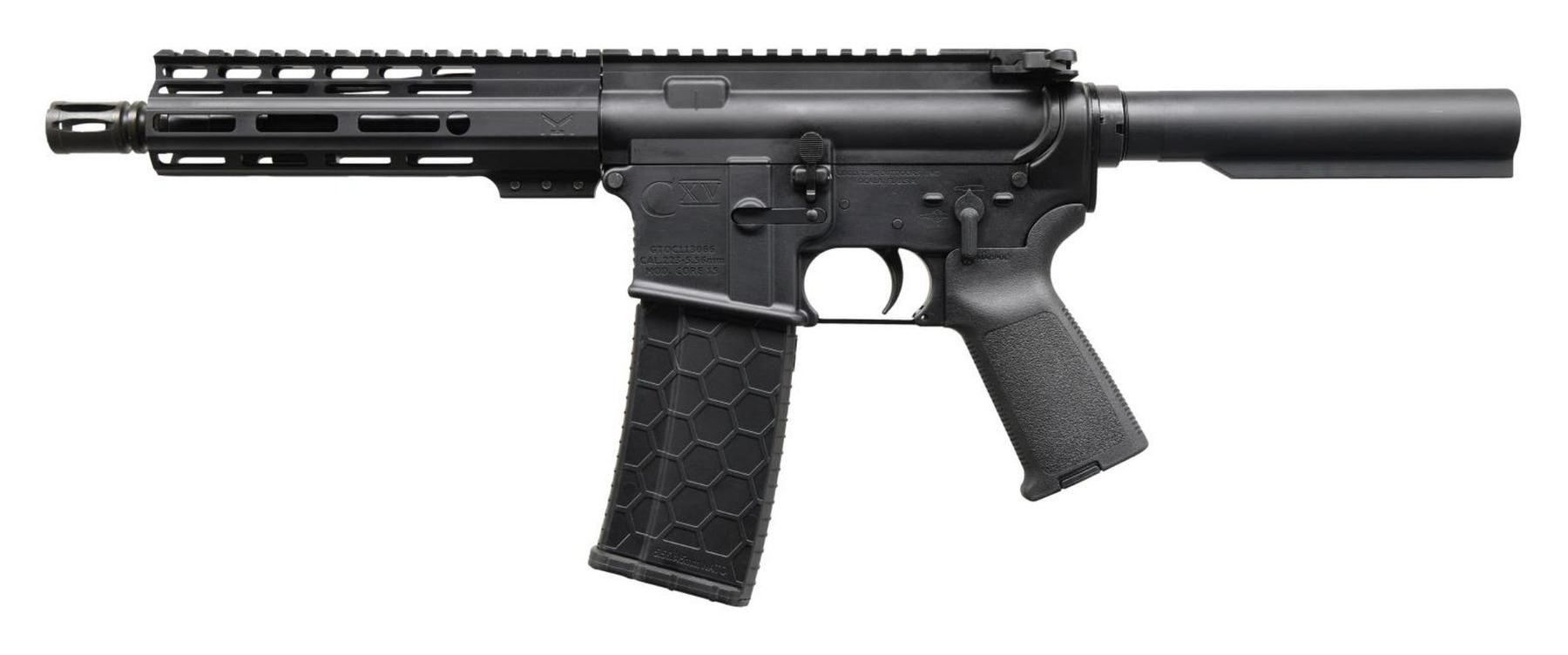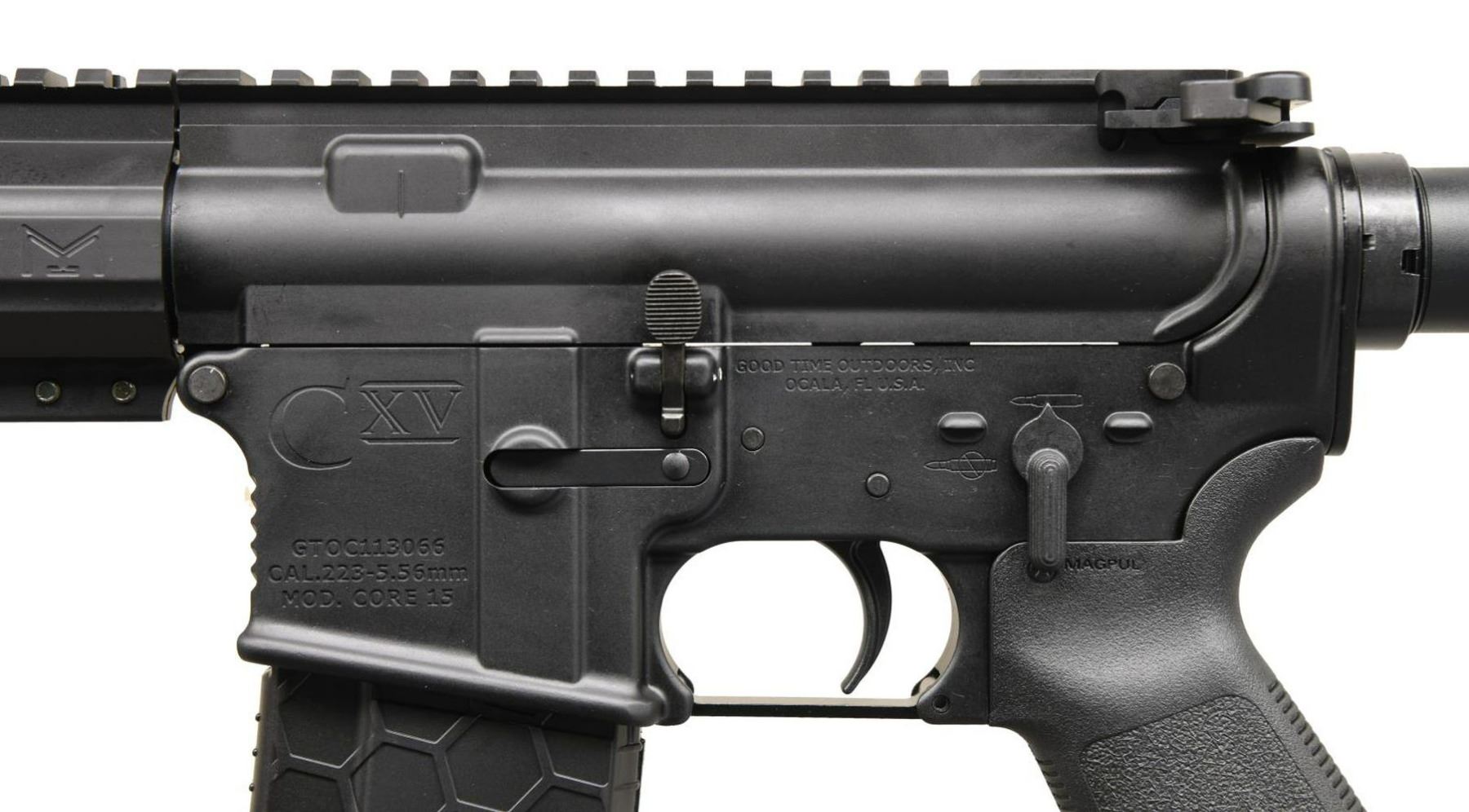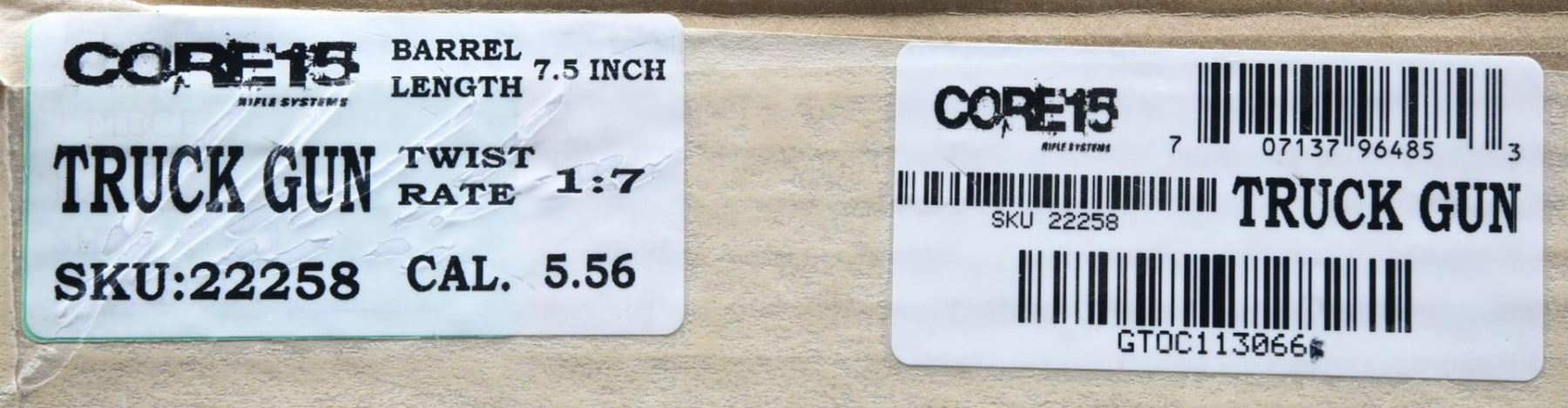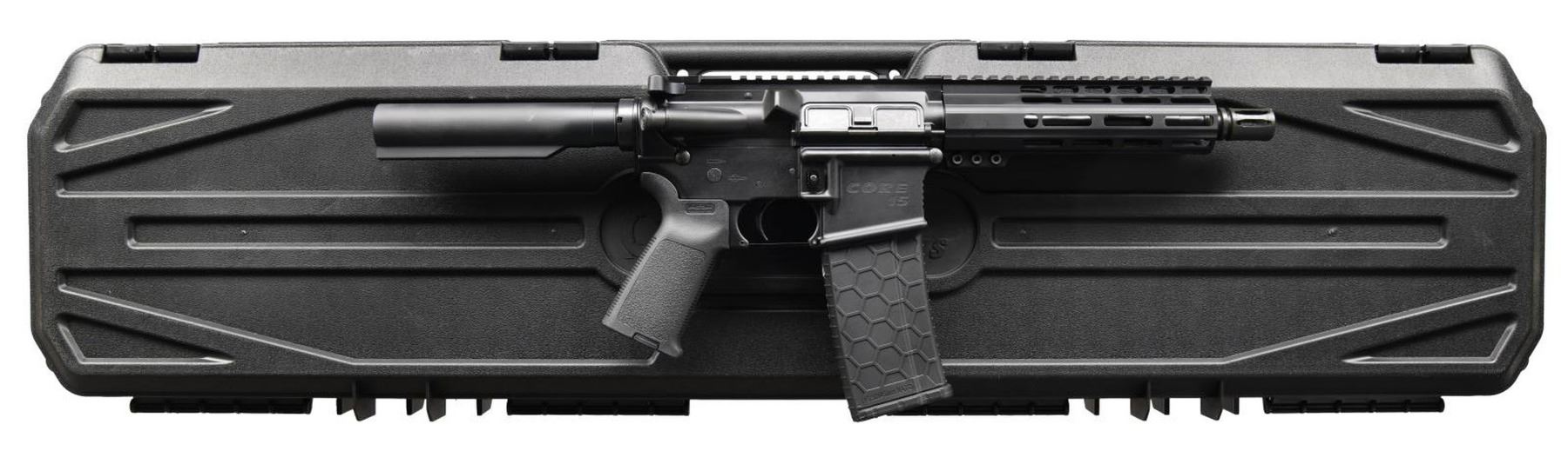 Cal. 5.56mm. S# GTOC113066. Bbl. 7.5". 7" Free Float M-LOK Handguard w/ picatinny top rail, providing 12" of sight & optic mounting real estate. Matte black finish. Threaded barrel terminated w/ A2 flash hider. Nitride Bolt Carrier Group. Pistol-Length gas system. 7075-T6 Aluminum Forged Mil-Spec upper & lower receivers. Round forward assist & brass deflector. Left side controls. Magpul MOE pistol grip. 6 Position Mil-Spec buffer tube. MAGS: 1 black 30 rd. HexMag w/ orange follower. UNATTACHED ACCESSORIES: black plastic foam lined transport case, lock & paperwork. CONDITION: all aspects appear as new. No sign of wear in any capacity. Never sold retail. Bright bore w/ strong rifling. Fire control mechanism appears to function correctly when cycled by hand. PROVENANCE: The Collection of Gun Sport Ltd owned by Jon R. Thomas. (23-3771/JZ). MODERN. $600-900.