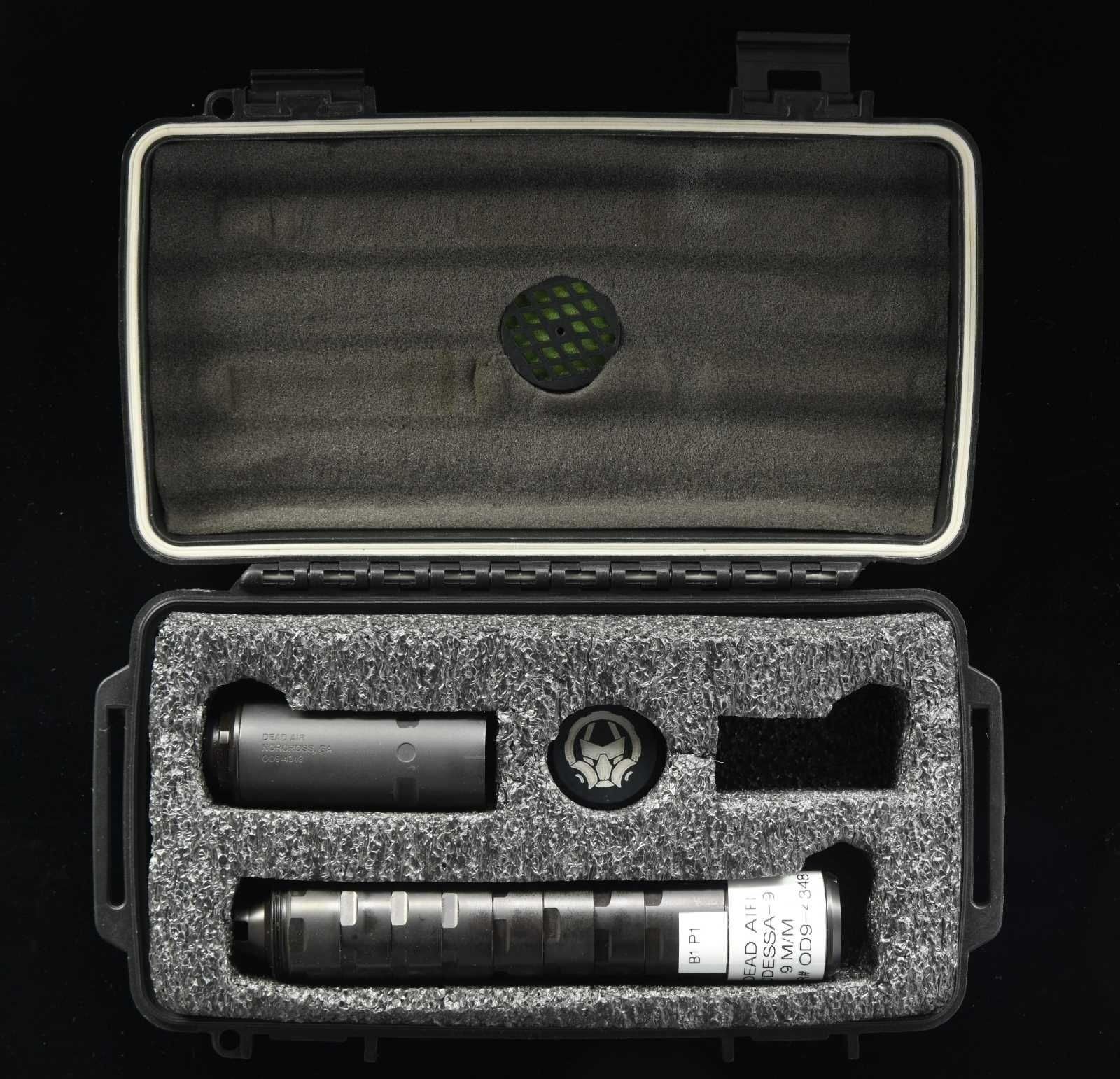 Cal. 9mm. S# OD9-4348. Dead Air Odessa 9 is an extremely modular 9mm pistol suppressor rated 22LR all the way to 9mm. There are 9 total baffles in this Dead Air suppressor that can be disassembled, meaning you get 10 configurable lengths that you can choose from based on your needs. Very small 1.1" outside diameter almost always ensures that your factory sights will be useful. Stainless steel construction w/ Black Nitride finish. UNATTACHED ACCESSORIES: Factory box, fitted hard case, 1/2x28 piston, shims, paperwork & proprietary tools CONDITION: As new in box. No indication of being mounted on host gun. Never sold retail. PROVENANCE: The Collection of Gun Sport Ltd owned by Jon R. Thomas. NATIONAL FIREARMS ACT SOUND SUPPRESSOR REQUIRING BATF TRANSFER BEFORE TAKING POSSESSION. FULLY TRANSFERABLE. (03-1666/JZ). MODERN. $500-700.