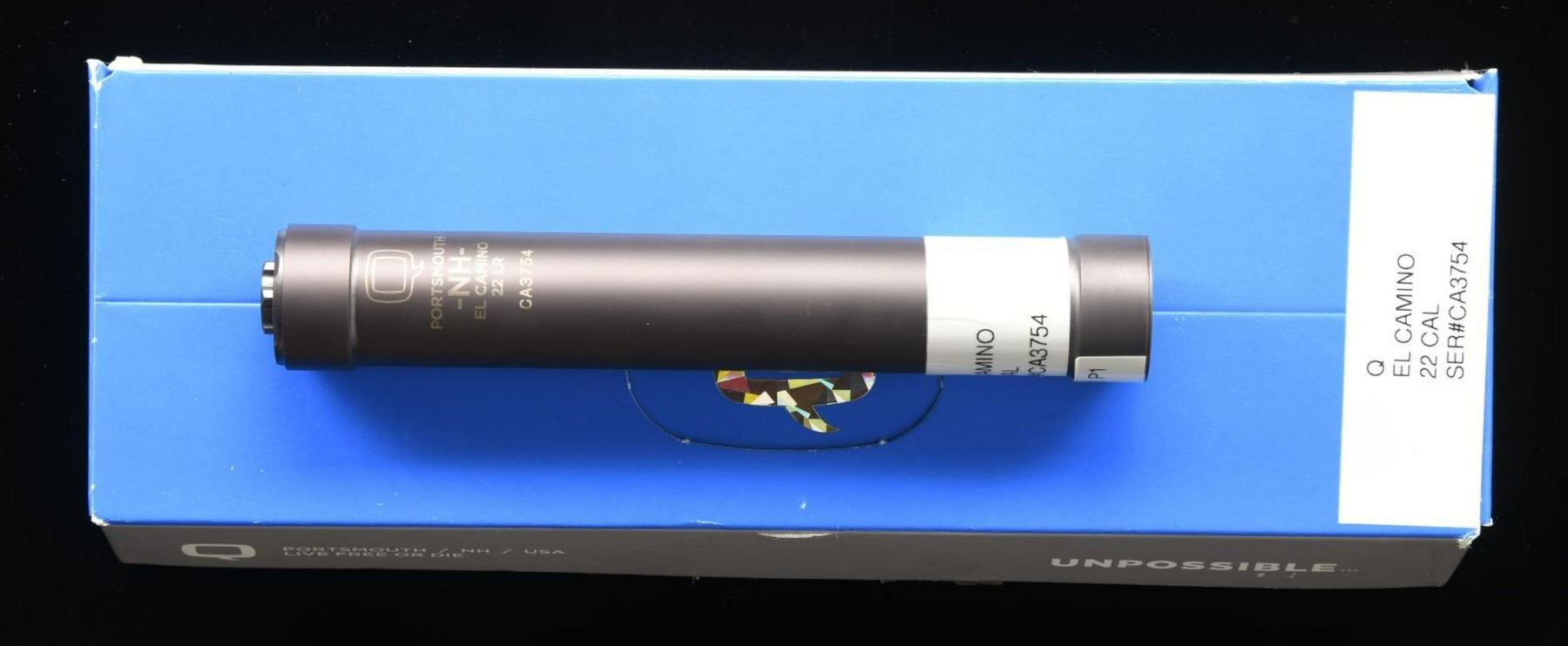 Cal. .22 LR. S# CA3754. The El Camino silencer by Q is a stainless steel & titanium, 22 caliber can built designed for a direct thread mount of 1/2x28.. From fit & finish to packaging & presentation, the El Camino will not disappoint. Designed for .22 caliber, it is full auto rated and extremely easy to clean & maintain. UNATTACHED ACCESSORIES: Factory pouch, box & paperwork. CONDITION: As new in box. No sign of having been mounted. This product has never been sold retail. PROVENANCE: The Collection of Gun Sport Ltd owned by Jon R. Thomas. NATIONAL FIREARMS ACT SUPPRESSOR REQUIRING BATF TRANSFER BEFORE TAKING POSSESSION. FULLY TRANSFERABLE. (03-1645/JZ). MODERN $200-400.