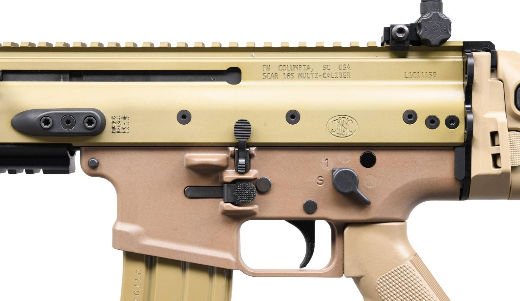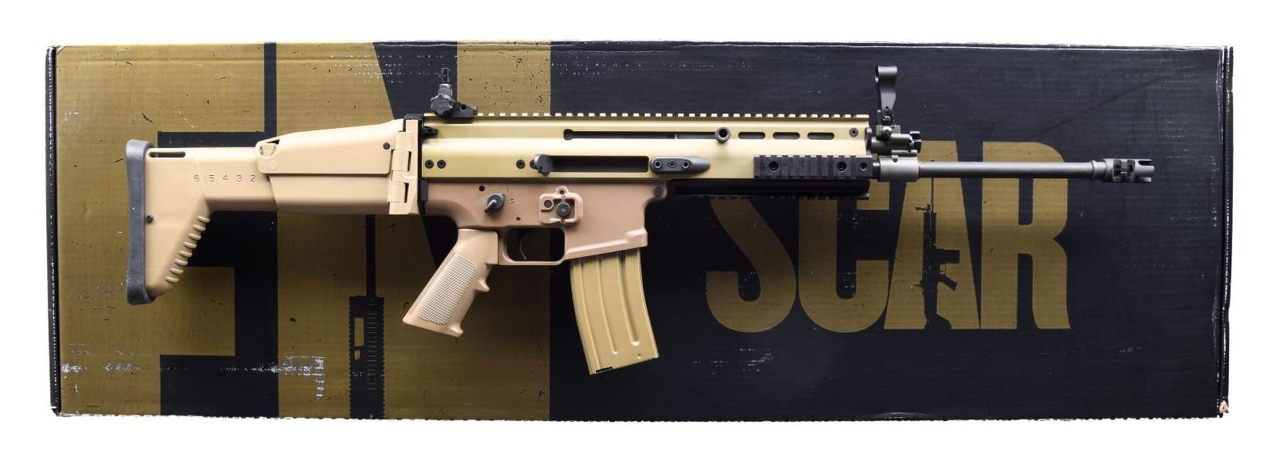 Cal. 5.56mm. S# L1C11139. Bbl. 16". The wildly popular SCAR 16 self-loading rifle, as awe-inspiring in hand as it is on the silver screen and glossy magazine pages, can be yours! All exposed metal surfaces are finished in FDE to match the plastic furniture very well. Bbl. terminated with an extremely effective muzzle brake. Folding hooded post front and folding windage and elevation adjustable rear peep sights. 16" scope rail to accommodate a plethora of sight options. Ambidextrous safety/selector and reciprocating charging handle. Ejection port buffer. 6 position collapsible, right side folding shoulder stock with height adjustable cheek piece. The forward Picatinny rail segments for accessory mounting are at 3, 6, and 9 o’clock. Left side receiver engraved: “FN COLUMBIA, SC / SCAR 16S MULTI-CALIBER”. MAGS: 1 FDE Painted 30 rd. steel. UNATTACHED ACCESSORIES: factory cardboard box and paperwork. CONDITION: all outward appearances indicate as-new in the box. The finish is complete and consistent, with no visible blemishing. Stock locks tightly in all positions. Bore is bright with strong rifling. The fire control mechanism appears to function correctly when cycled by hand. PROVENANCE: the collection of Gun Sport Ltd., owned by Jon R. Thomas. (23-3466/JZ). MODERN. $3,000-4,000.