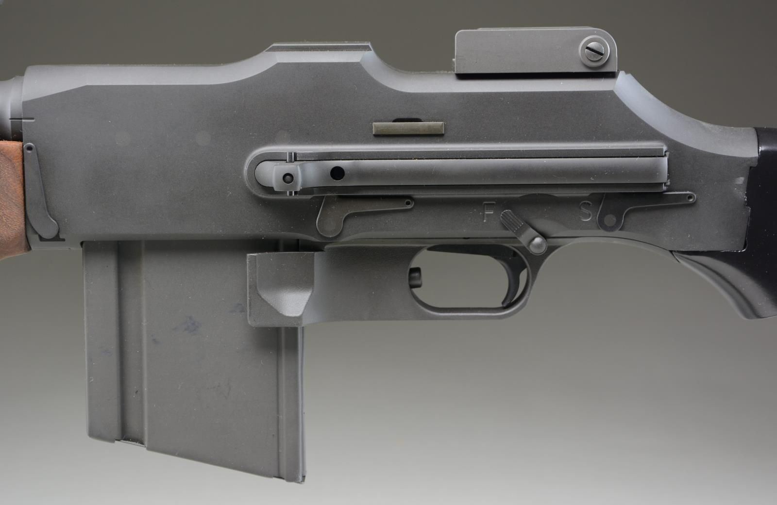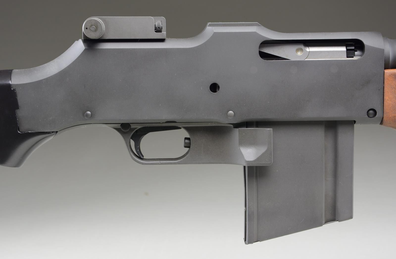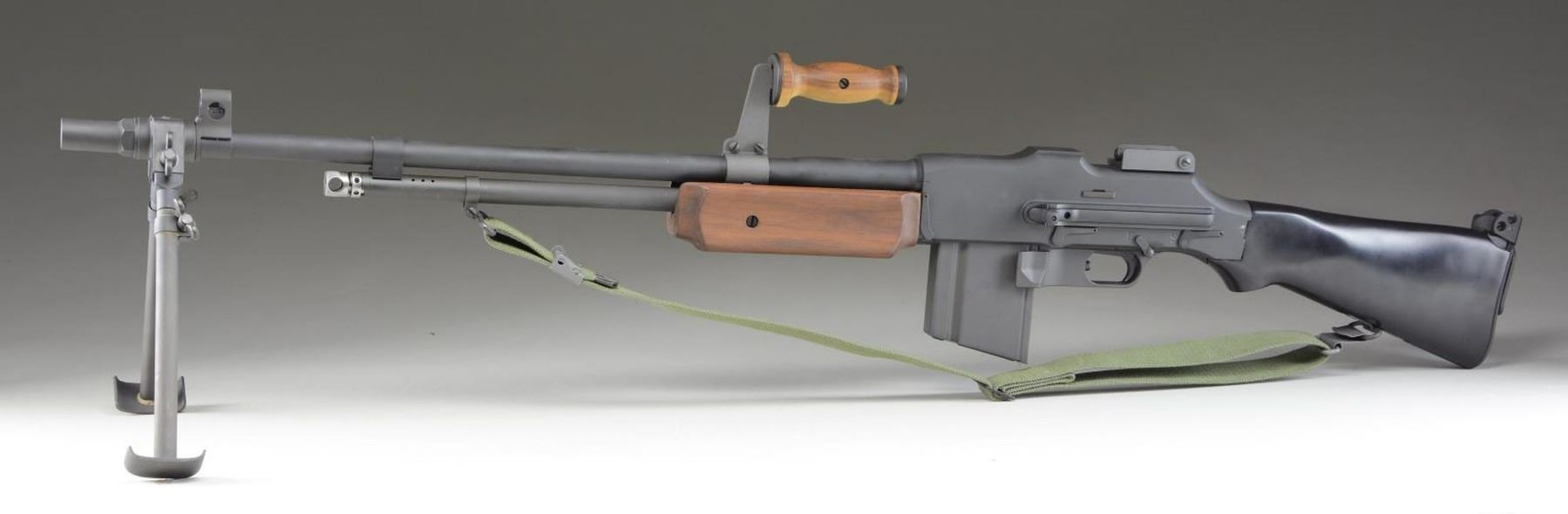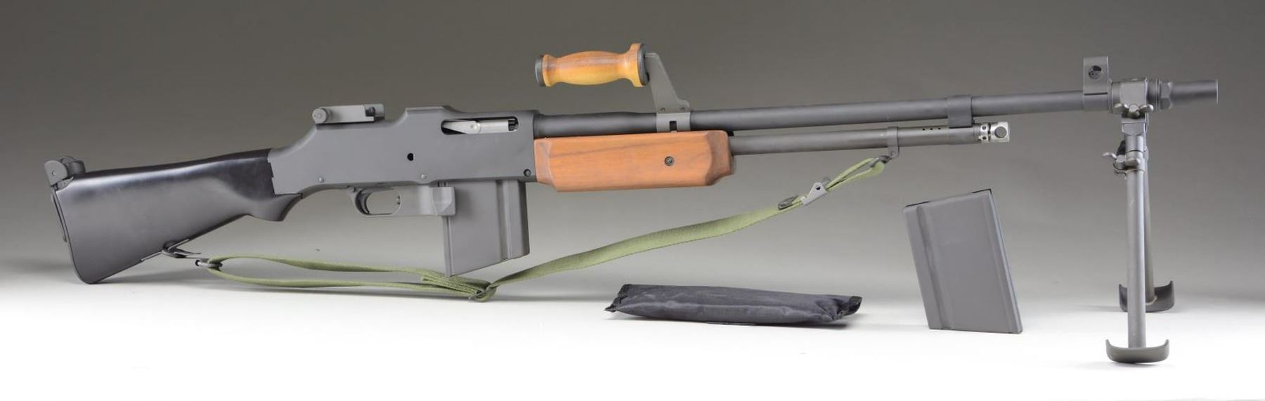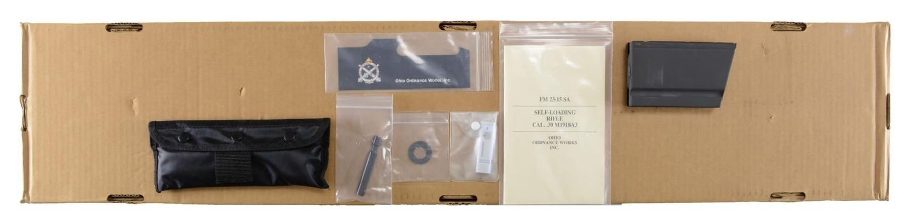 LOADING RIFLE. Cal. 30-06. S# 3801. Bbl. 27" over flash hider. The BAR was developed by John Browning in 1917 as an air cooled, gas operated, mag. fed, shoulder fired automatic rifle as a requirement for WWI. Early manufacturers included Colt, Winchester & Marlin Rockwell. Approx. 85,000 were mfg. Prior to the armistice. This particular example is by Ohio Ordnance Works & is designated "The Self Loading Rifle Mod. 1918A3". It is a semi auto only, closed bolt self loading rifle variant of the historical BAR. From its matte parkerized finish to its hardwood forend & carry handle, the looks & feel take the operator back 100 years. Gas operated w/ an adj. gas system. Has a threaded muzzle w/ cone flash hider. Fixed blade protected front sight. Ladder elevated peep rear sight graduated to 1500 yards w/ folding battle sight setting. 31" Sight radius. Green canvas sling. Left side safety selector & non reciprocating charging handle. Black plastic stock w/ folding steel buttplate. Front mounted folding adj. bipod. MAGS: 1 steel 20 rd. UNATTACHED ACCESSORIES: Factory packaging, cleaning kit & paperwork. CONDITION: all aspects indicate as new. The parkerized coverage is complete & consistent w/ full coverage. Wood forend & buttstock are unblemished. Bore is bright w/ strong rifling. Fire control mechanism appears to function correctly when cycled by hand. PROVENANCE: The Collection of Gun Sport Ltd. owned by Jon R. Thomas. (23-3808/JZ). MODERN. $3,000-4,000.