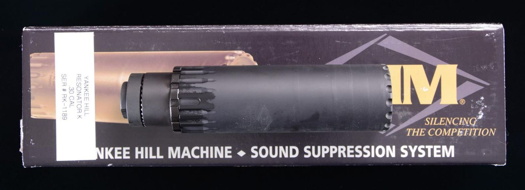 SUPPRESSOR. Cal. 30.. S# RK-1189. Short, rugged 30 caliber sound suppressor w/ matte black Cerakote finish. 4.8" overall length. 5/8"x24 threads. YHM QD mount doubles as flash hider. Full auto rated and built to handle up to 300 Win Mag. Heat treated 17-4 stainless steel & Inconel construction.. UNATTACHED ACCESSORIES: Disassembly tools, original box & paperwork. CONDITION: As new. Never sold retail. PROVENANCE: The Collection of Gun Sport Ltd owned by Jon R. Thomas. NATIONAL FIREARMS ACT SOUND SUPPRESSOR REQUIRING BATF TRANSFER BEFORE TAKING POSSESSION. FULLY TRANSFERABLE. (03-1652/JZ). MODERN CLASS III. $400-600.