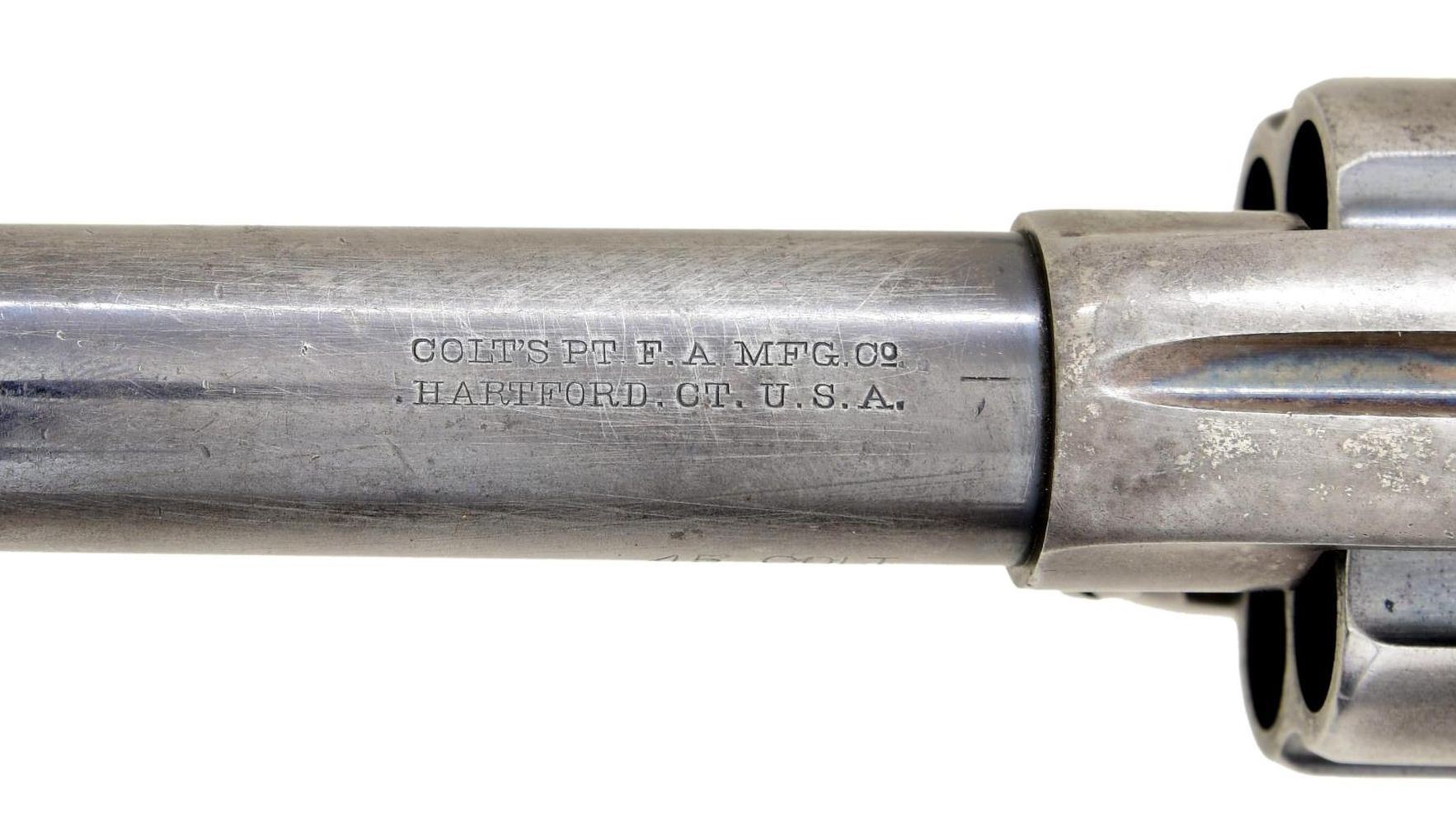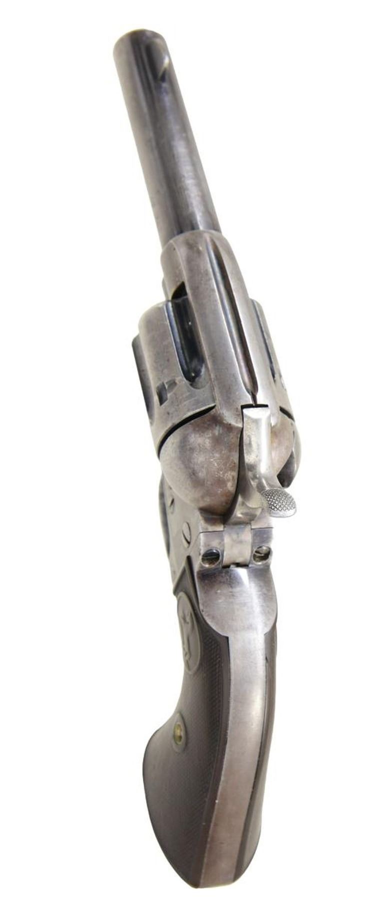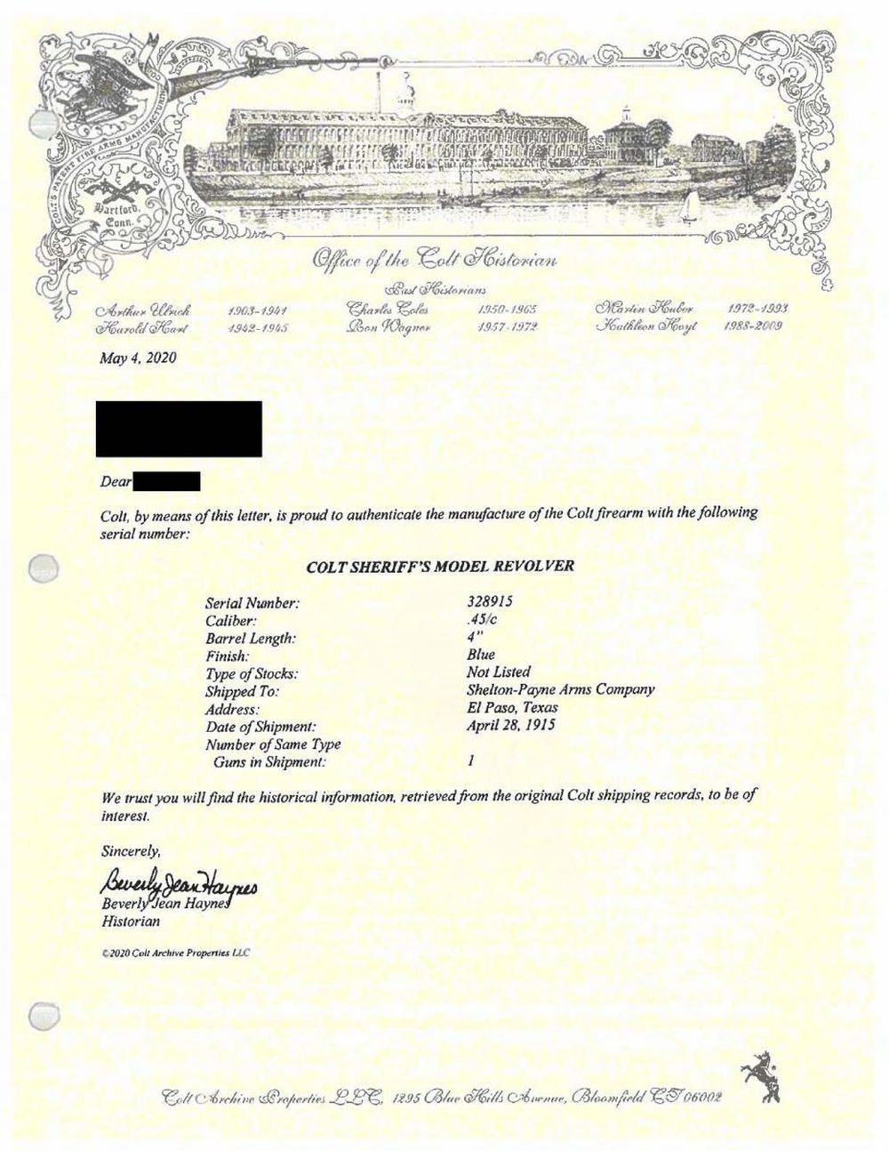 ARMY" VERY RARE COLT LONG FLUTE SHERIFF'S MODEL SAA REVOLVER. Cal. 45 Colt. S# 328915. Bbl. 4" w/o ejector. Six shot long flute cyl. Long flute cyls. remaining after the model 1878 double action was discontinued were altered for use in single action revolvers. The normal S# range for long flute use is 330,001 to 331,479. "A Study of the Colt Single Action Army Revolver" by Graham, Kopec & Moore lists 8 out of range known long flute revolvers on page 157-158. Among these is this revolver, no. 328915 listed as a 4" Sheriff's model, assembly completed April 27, 1915 & shipped April 28th, 1915. This revolver is also pictured on page 77 under the chapter pertaining to Sheriff's Models. Blue & case colored finish. 2 piece checkered hard rubber rampant colt grips. Frame & grip straps have matching S#s. Sheriff's model revolvers with long flute cyls. are practically unheard of. UNATTACHED ACCESSORIES: letter from Colt Archive Properties LLC detailing the following information, "Serial Number: 328915 / Caliber: .45/c / Barrel Length: 4" / Finish: Blue / Type of Stocks: Not Listed / Shipped To: Shelton-Payne Arms Company / Address: El Paso, Texas / Date of Shipment: April 28, 1915 / Number of Same Type Guns in Shipment: 1". CONDITION: bbl., cyl. & grip straps retain worn blue in protected areas, carry areas have faded to gray. Frame shows 30% visible case colors primarily on the right side & forward portions of frame w/ balance fading to gray from carry use. Grips have worn checkering w/ small chips at toe. Cyl. stops short of indexing when action is cycled. Bore retains strong rifling. (24-2052/DS). CURIO. $15,000-22,500.