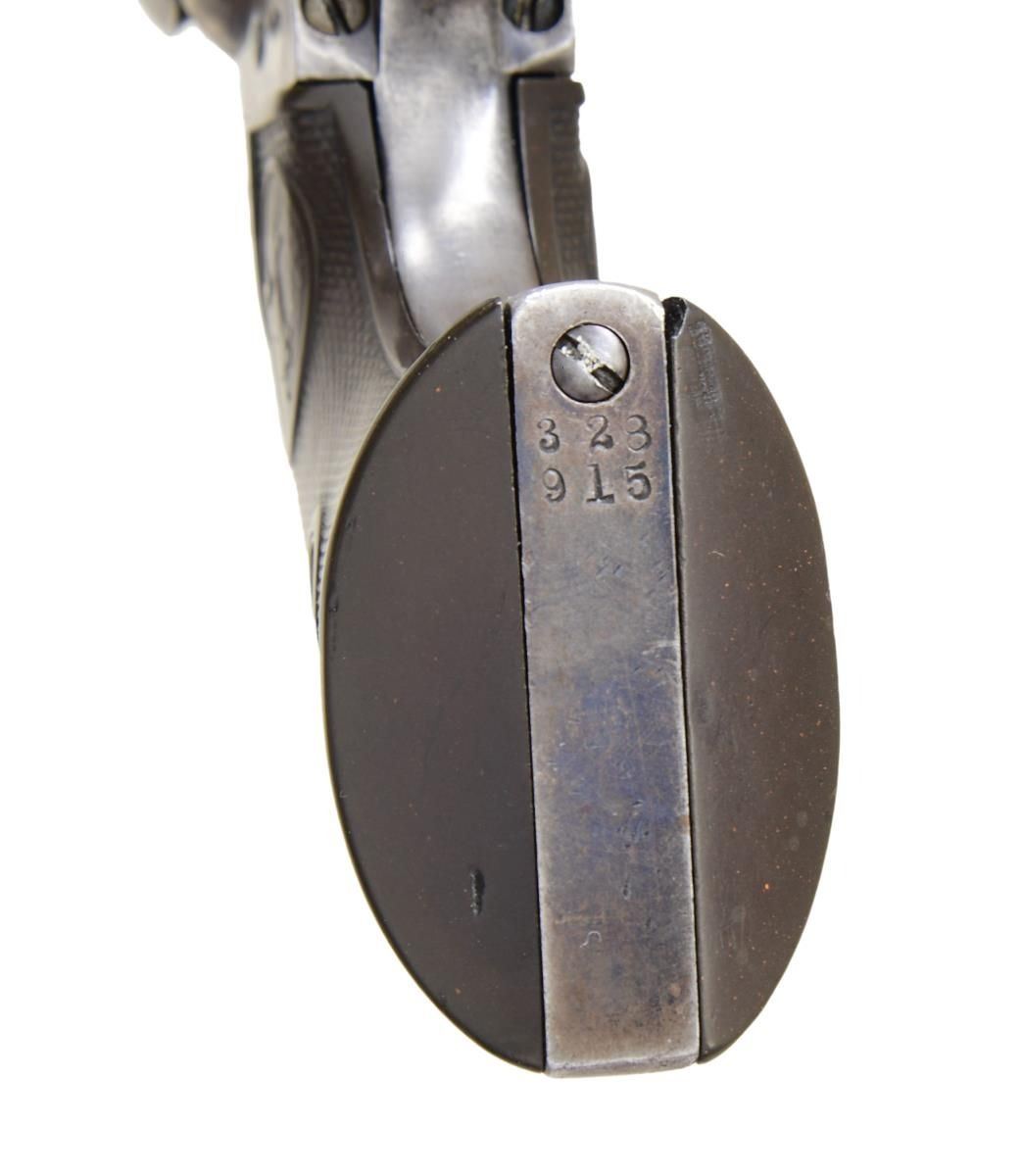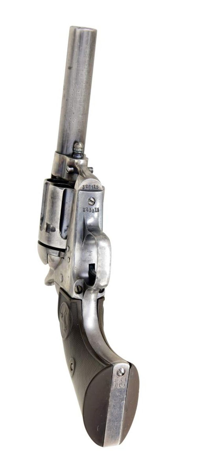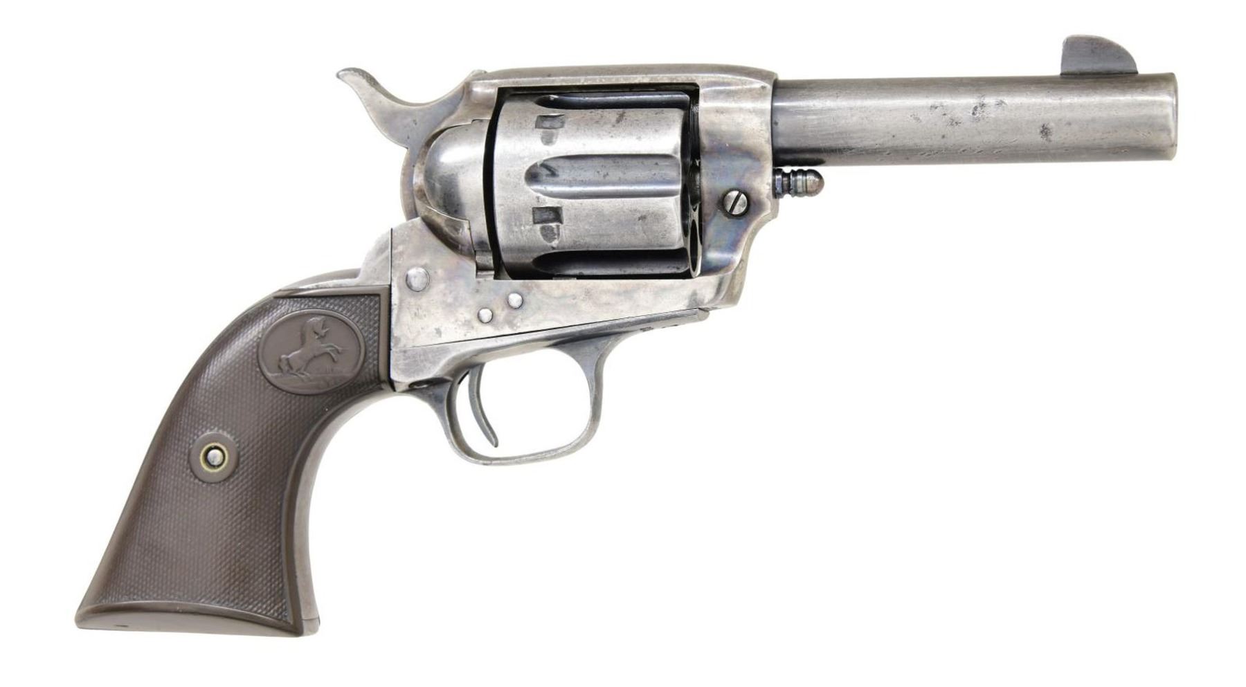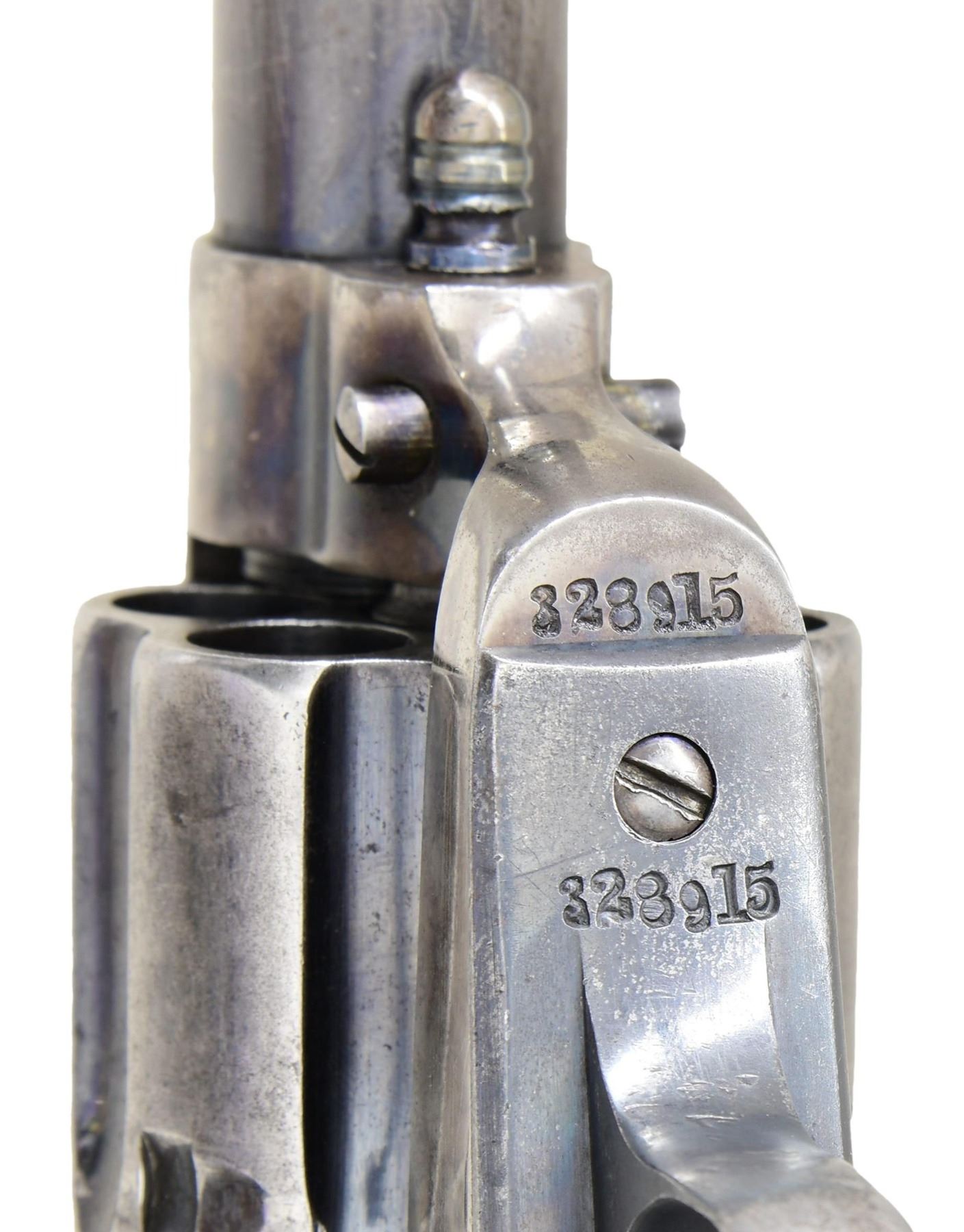 ARMY" VERY RARE COLT LONG FLUTE SHERIFF'S MODEL SAA REVOLVER. Cal. 45 Colt. S# 328915. Bbl. 4" w/o ejector. Six shot long flute cyl. Long flute cyls. remaining after the model 1878 double action was discontinued were altered for use in single action revolvers. The normal S# range for long flute use is 330,001 to 331,479. "A Study of the Colt Single Action Army Revolver" by Graham, Kopec & Moore lists 8 out of range known long flute revolvers on page 157-158. Among these is this revolver, no. 328915 listed as a 4" Sheriff's model, assembly completed April 27, 1915 & shipped April 28th, 1915. This revolver is also pictured on page 77 under the chapter pertaining to Sheriff's Models. Blue & case colored finish. 2 piece checkered hard rubber rampant colt grips. Frame & grip straps have matching S#s. Sheriff's model revolvers with long flute cyls. are practically unheard of. UNATTACHED ACCESSORIES: letter from Colt Archive Properties LLC detailing the following information, "Serial Number: 328915 / Caliber: .45/c / Barrel Length: 4" / Finish: Blue / Type of Stocks: Not Listed / Shipped To: Shelton-Payne Arms Company / Address: El Paso, Texas / Date of Shipment: April 28, 1915 / Number of Same Type Guns in Shipment: 1". CONDITION: bbl., cyl. & grip straps retain worn blue in protected areas, carry areas have faded to gray. Frame shows 30% visible case colors primarily on the right side & forward portions of frame w/ balance fading to gray from carry use. Grips have worn checkering w/ small chips at toe. Cyl. stops short of indexing when action is cycled. Bore retains strong rifling. (24-2052/DS). CURIO. $15,000-22,500.