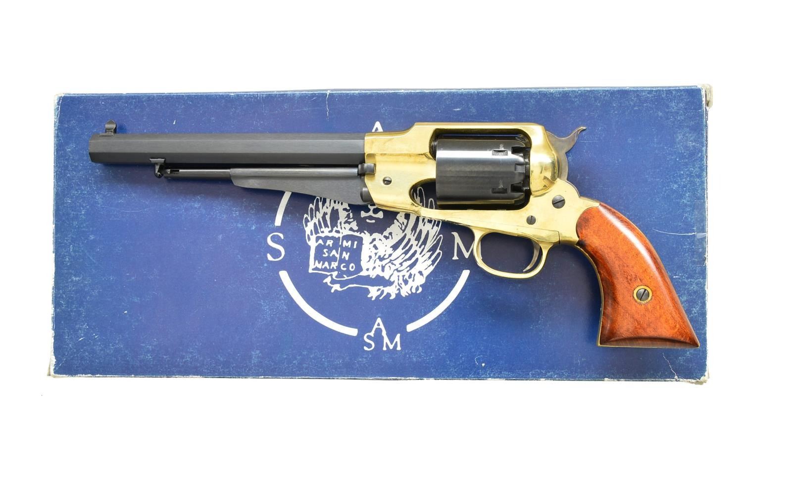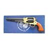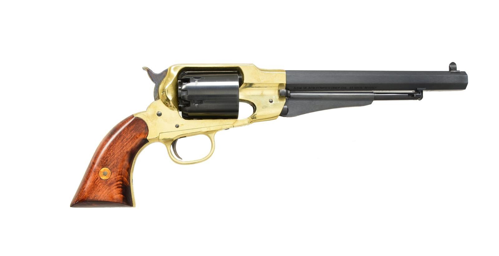 Cal. 44. S# DO4527. Bbl. 8" oct. w/ blade sight. Brass frame & trigger guard. 6 Shot rnd. cyl. Case colored hammer & trigger. 2 Piece hardwood grips. Italian mfg. UNATTACHED ACCESSORIES: foam lined blue box w/ Armsport Inc. instruction pages. Box contains red tin of Dixie Gunwork No. 11 percussion caps & nipple wrench. Revolver appears unused. Brass parts are obtaining spots of light tarnish. Very good blue & wood finish. Bright near excellent bore. (01-19410/DS). ANTIQUE. $150-250.