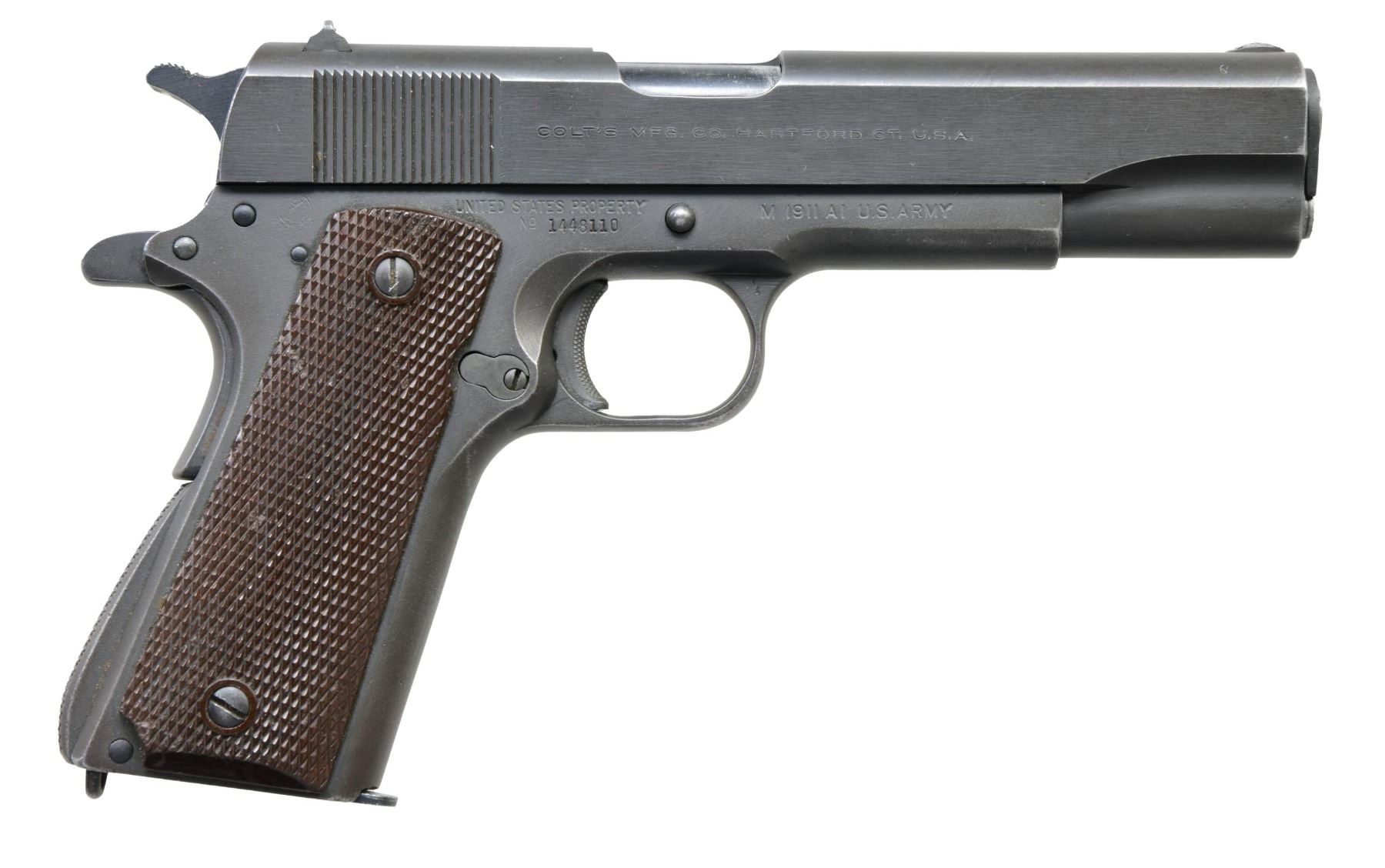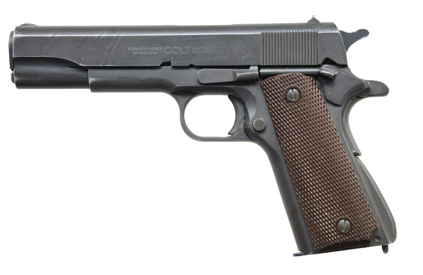 ITHACA FRAME. Cal. 45 ACP. S# 1448110. Post WWII Colt Commercial slide with High Standard 5" barrel & fixed sights. WWII Ithaca frame with Keyes Fiber grips. MAGS: 1 Scovill Mfg. Co. 7 rd. mag. CODNITION: Pistol has very good military style parkerized refinish showing wear, scratches & marks. Very good grips. Very good bore. (24-5498/MD). CURIO. $600-900.