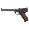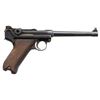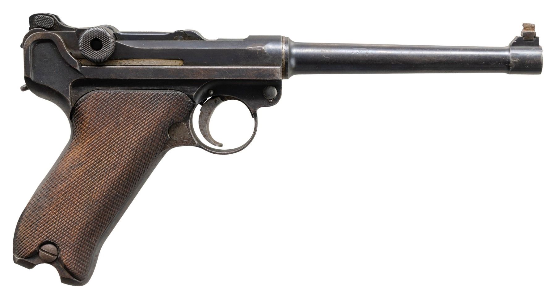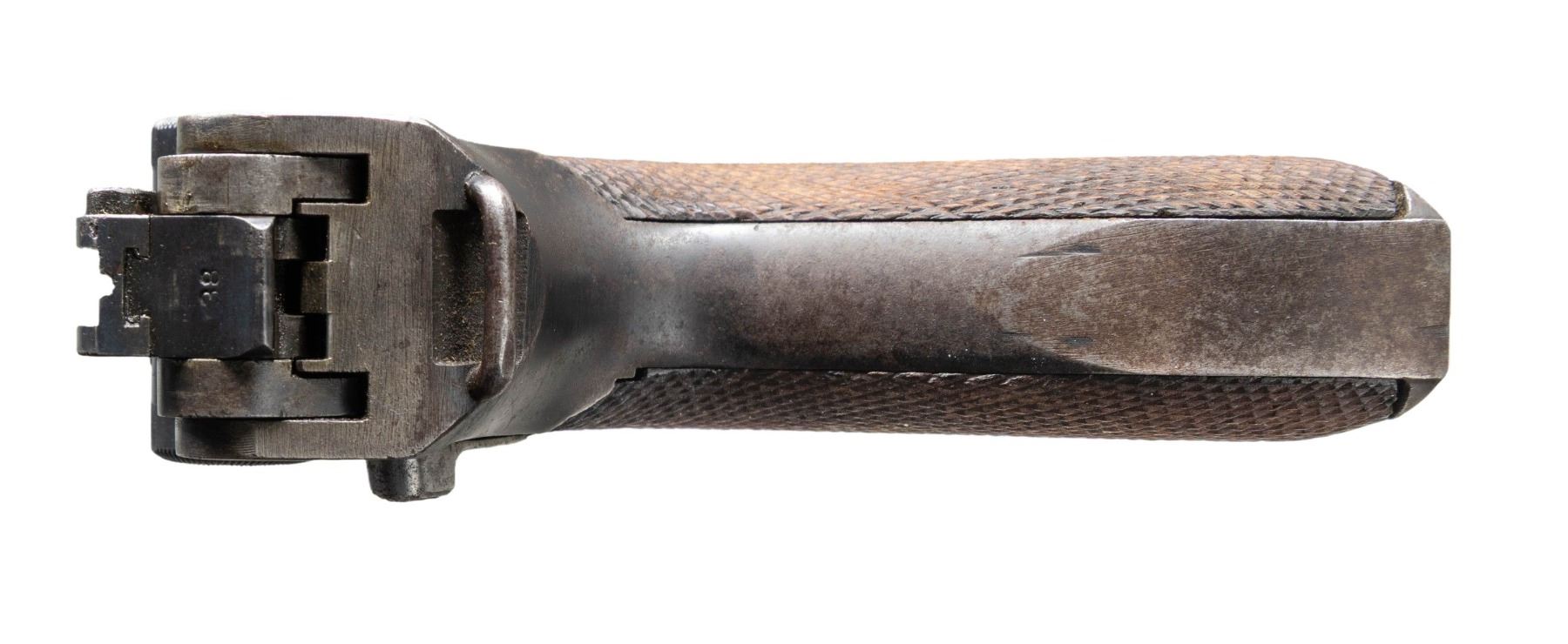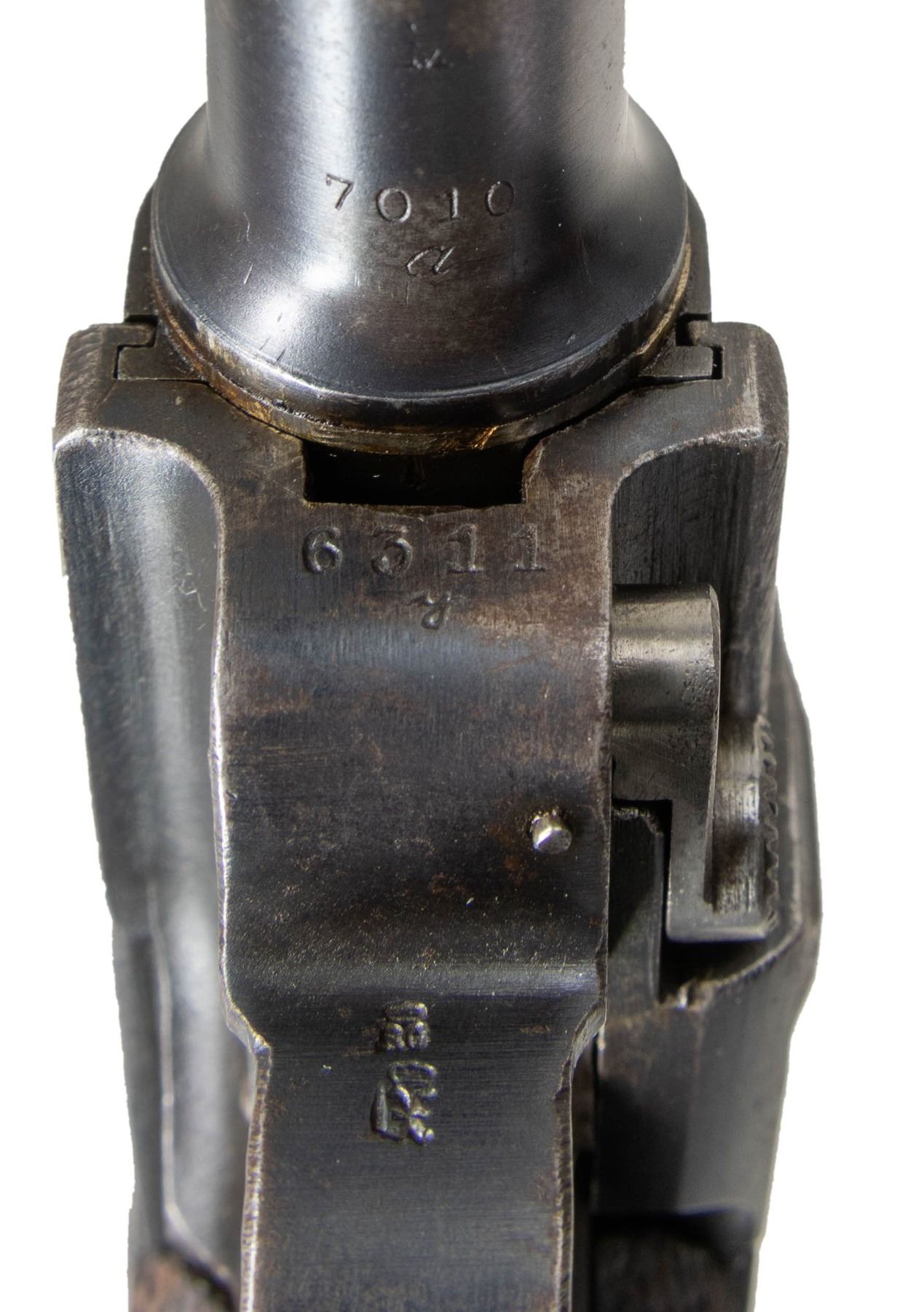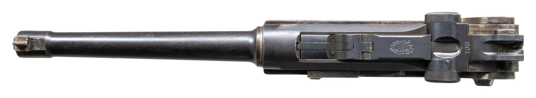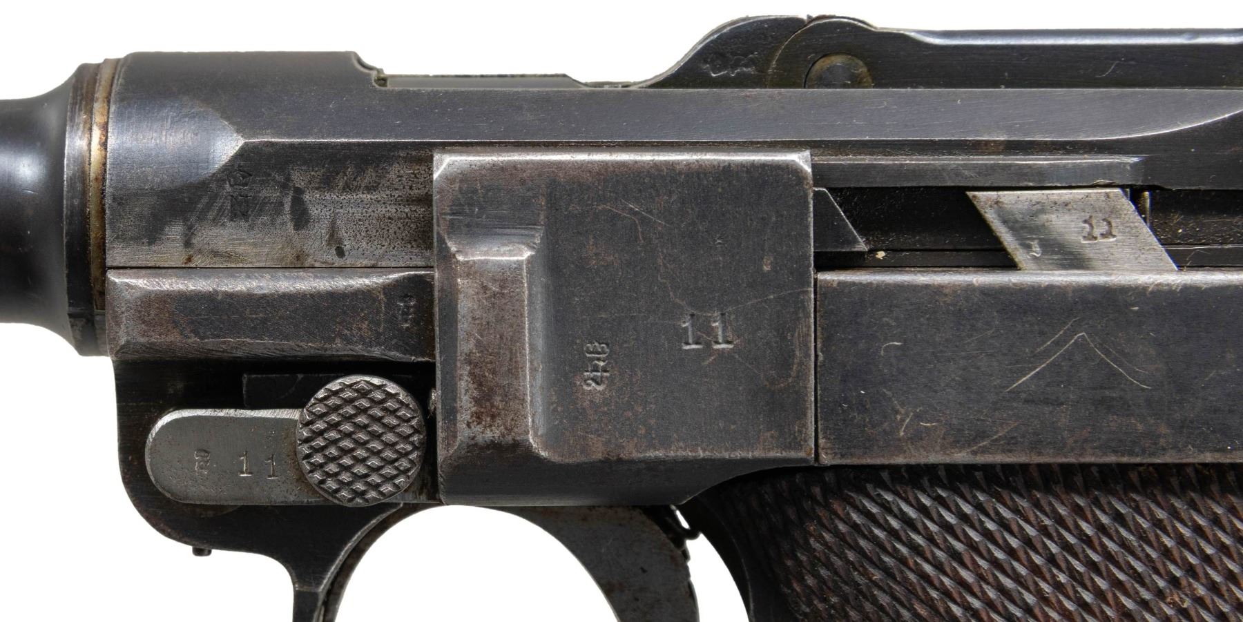 LUGER SEMI-AUTOMATIC PISTOL. Cal. 9x19mm. S# 6311g. Bbl. 5 7/8". Model 1920 Commercial Navy style Luger assembled from assorted WWI and post-war commercial parts. Frame assembly and sideplate of WWI Erfurt mfg. Bbl. extension, breechblock, and forward toggle link of DWM mfg. Bbl. and rear toggle link of WWI mfg. Left side of bbl. extension and breechblock exhibit a Crown/N commercial nitro proof. Toggle is marked with the intertwined "DWM" monogram. Metal components exhibit a rust blue finish overall. Frame is mounted with 2-piece checkered wood grips. Replacement blade front sight with 2-position navy rear sight, modified to U-notch configuration. Bbl. is fitted with a washer at the breech area. Stock lug on frame has been ground down. Matching numbers are present on the frame, takedown lever, sideplate, trigger, safety lever & bar, as well as the hold-open latch. Grips do not match, but match themselves via "50". Mag. is absent. CONDITION: metal components retain large amounts to the majority of their rust blue finish, showing areas of wear and thinning that are fading to gray patina, scattered spots of light to mild surface oxidation, scattered superficial marks and scratches, as well as some marks/impressions from assembly/disassembly. Strawed parts have been cleaned in-the-white, exhibiting scattered spots of light pitting, oxidation, and age related discoloration. Very bright bore, exhibiting light pitting, while retaining strong rifling throughout. Proper manual mechanics. Grips show light wear and some superficial handling marks, but are otherwise sound. (25-5221/MLW). MODERN. $1,000-1,500.