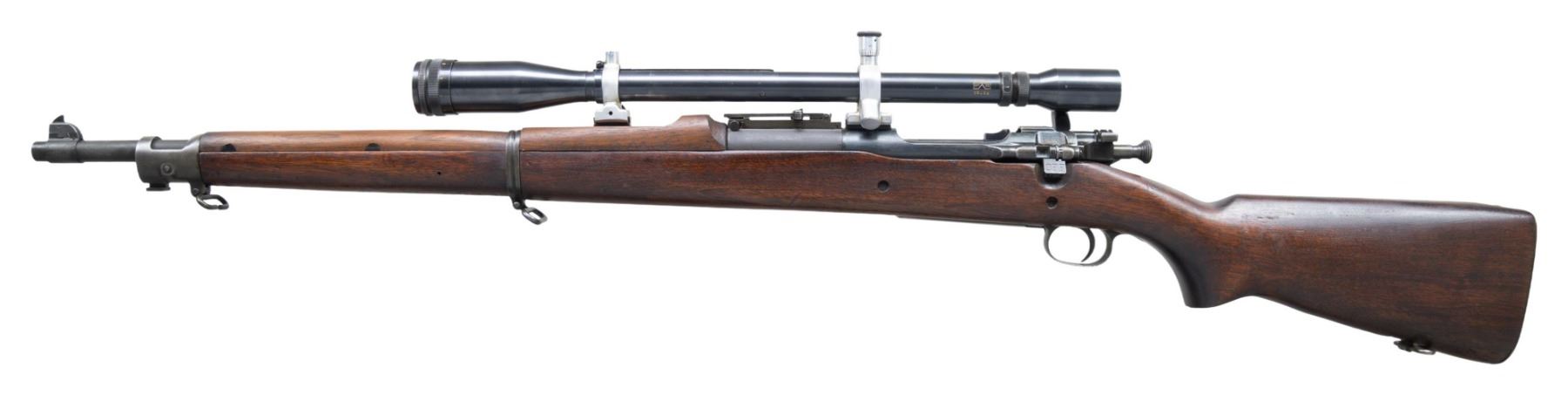 Cal. 30-06. S# 1312233. Bbl. 24". Replacement bbl. is marked "HS / flaming bomb / 9-44". Rifle has been assembled to replicate the Model 1903A1 sniper rifle using a receiver manufactured in 1929. It is equipped w/ a Remington made 03A3 bolt which has been electro-penciled to match. The rear sight base is the Remington produced type w/o lightening cuts. Ladder rear sight w/o volley notch graduated to 2,850 yards. Blade front sight. The rifle is equipped w/ a Unertl 12 power 7/8" tube target scope in aluminum Unertl marked mounts. Scope has adjustable objective lens & fine crosshair reticle. Bolt cannot be operated with scope installed as bolt handle will not clear scope. Scope return spring is not present. Handguard has been modified to accept the front scope block w/ professional workmanship. 1903A3 full pistol grip walnut buttstock. Stock w/ two recoil bolts is unmarked, except for "K" in cutoff recess indicating Keystone manufacture. All milled furniture except butt swivel. Fine checkered trap buttplate. CONDITION: stock set has light wear w/ a moderately worn refinish showing scattered handling marks throughout. Metal parts show approx. 70% of their mix of blued & parkerized finishes. Scope retains a large degree of its original blue finish w/ thinning, light wear & scattered tiny handling marks. Very good shiny bore w/ sharp lands. (25-2714/RW). CURIO. $800-1,200.