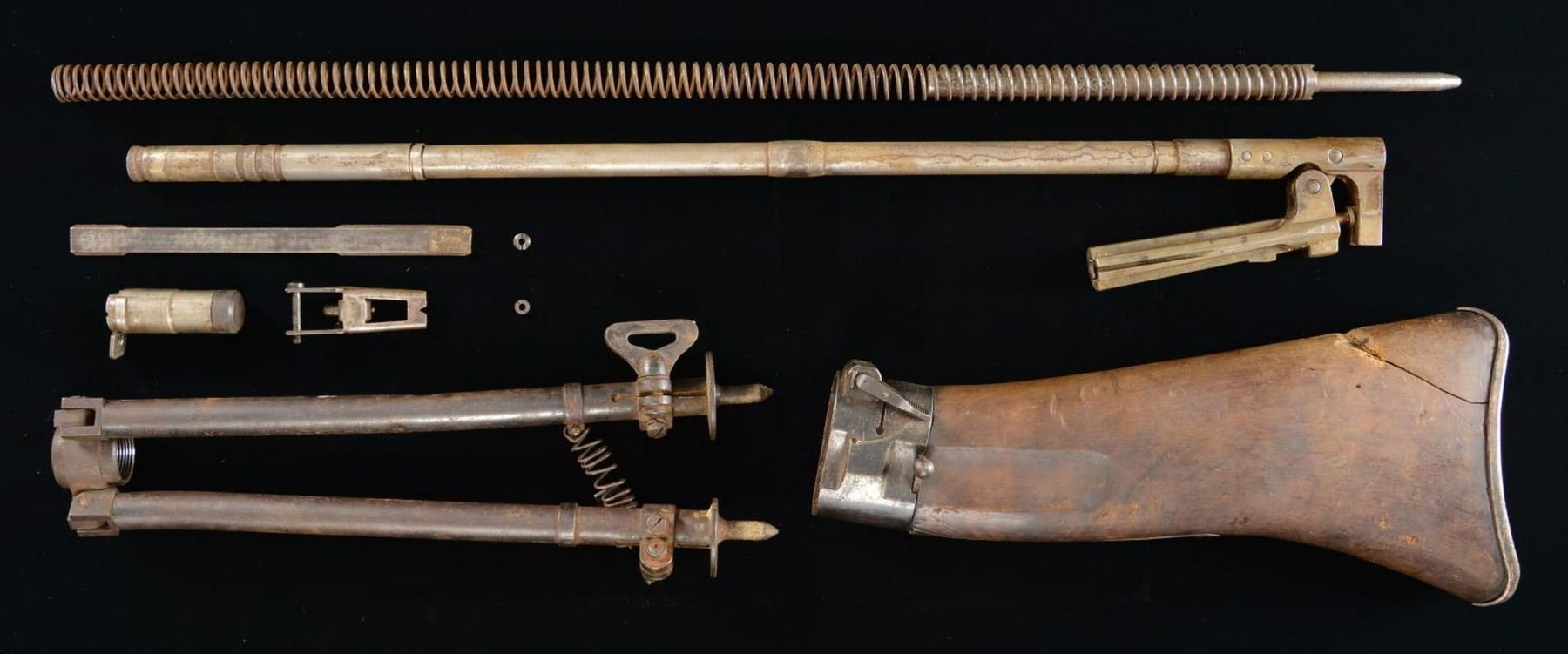 Selection of parts from an original Knorr-Bremse MG 35/36 machine gun including bolt, op-rod, bipod, recoil spring, shoulder stock, & some small internals. CONDITION: As liberated from original, issued machine gun. Stock has crack on top, forward of steel butt plate. (02-20158/JZ). $300-500.