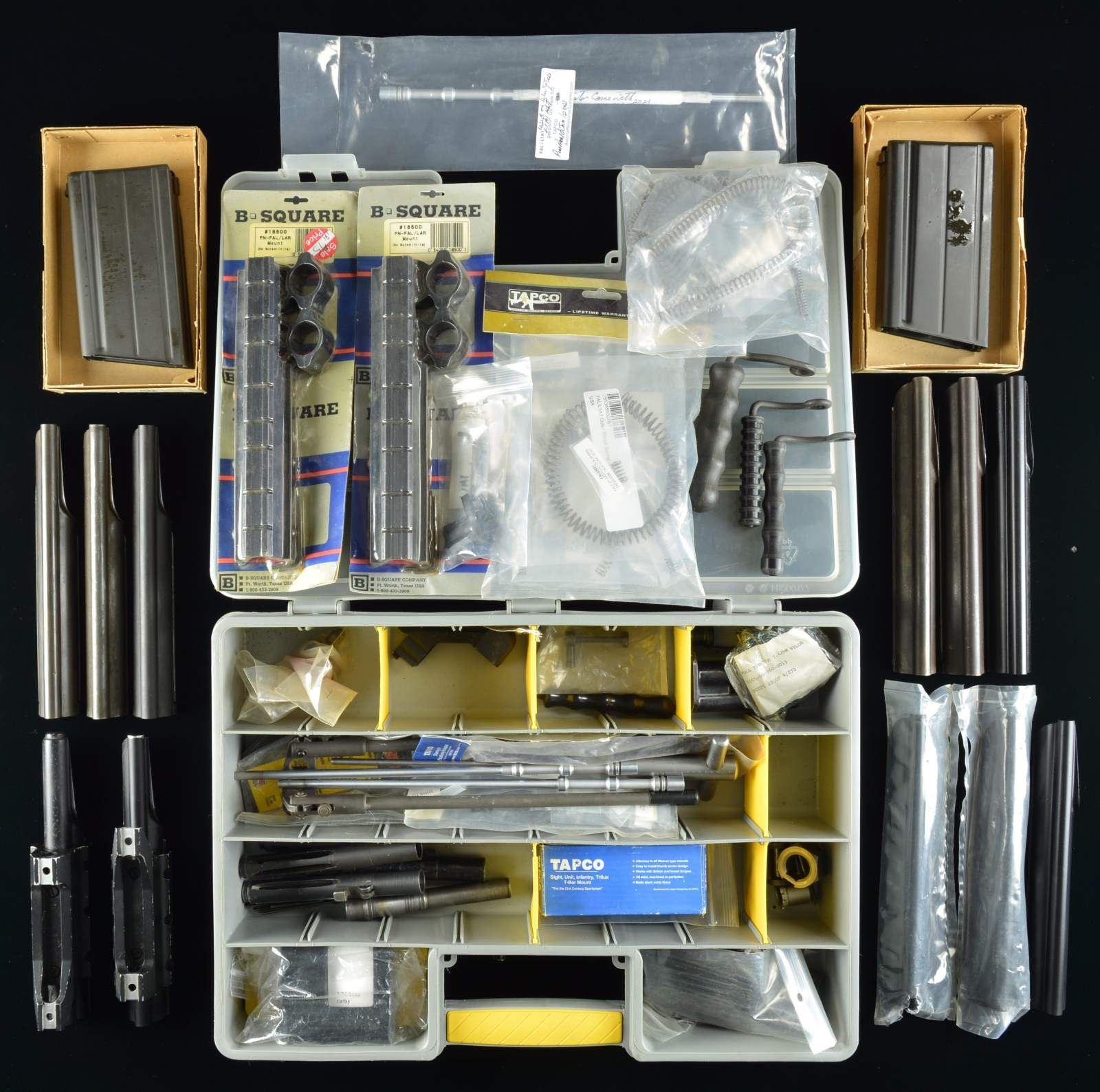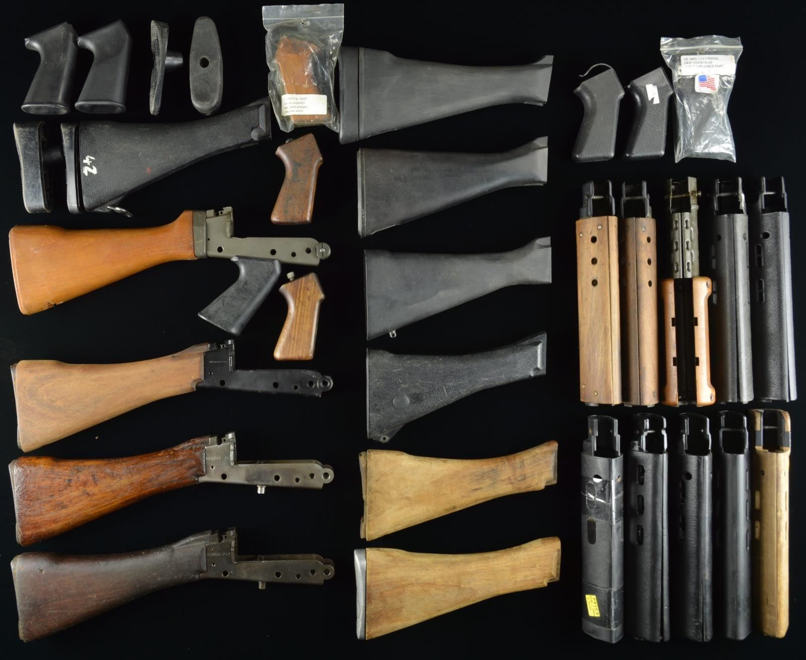 Grouping of assorted FN-FAL parts & pieces including the following; 1) 13 sets of handguards, some wood, plastic & metal. 2) 11 stocks, some wood & some plastic. 3) 4 stripped lower receivers. 4) 9 pistol grips, some wood & some plastic. 5) 11 steel receiver covers, 2 fitted w/ Stanag scope mounts. 6) 3 carry handles. 7) 2 B-Square #18500 scope mounts. 8) 2 new 20rd, inch pattern mag bodies. Also several small parts, springs & tools. (02-16807-4/JZ). $200-400.