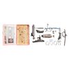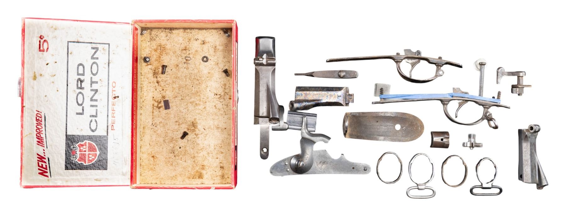 All parts are good to very good by antique ratings with signs of age with patina. Side plate assembly missing 1 mounting screw. / 1884 action (serial #30410) missing breech block cap screw and tang screw. / stripped 1878 breech block. / stripped high arch 1873 breech block with spectacular case colors that have an original appearance. / compete trigger plate and guard assembly; includes screws. / trigger plate, guard and trigger. / buttplate without screws. / Tumbler with spring stirrup. / Stock tip. / Cam latch assembly. / Combination tool. / Small stacking swivel; missing 1 swivel. / Large in the white band with swivel and cross groove on top. / Similar large band without provision for swivel but with cross groove on top. / Large band without swivel provision or cross groove. PROVENANCE: Norman Olliff Estate. (02-25728/NW). $350-500.