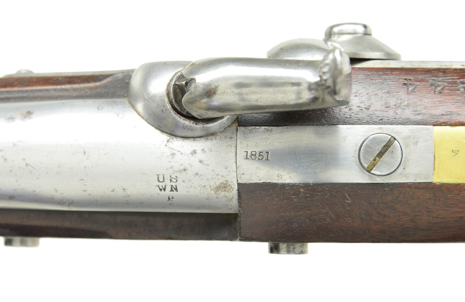 Cal. 54. NSN. Bbl. 8 1/2" round with brass blade sight. Manufactured by Henry Aston (also by Ira Johnson) 1851 (6,000 units 1851-1852.); total production 1845-1852. Top of bbl. marked "U S", inspector Walter North's initials of "W N" and military "P" proof. "1851" on Tang and lock (flat with beveled edges) that also has "U S / 8.ASTON & CO." in front of hammer and "MIDD'TN / CONN / 1851" at tail. This exact pistol with stamped A B Brooks number "944" (twice, left side above brass connector and top right above lock tail) of catalog in 1889 as part of a pair carried by Connecticut Governor's Horse Guard until 1885. The matching pistol with mixed dates of 1851 and 1852 was sold by Poulin's in May of 2022. Left panel of stock has vivid oval "W.A.T." (William A. Thornton) and boxed "LM". "M" on brass backstrap immediately behind tang, in front of trigger guard and also in front of front lockplate screwhead. "W" on brass connector between lockplate screws and on left rear side flat of barrel. Captured swivel ramrod with threaded end for accessories. Brooks listing states both No. 944 pistols were altered from flint lock to percussion and listed as items 107 and 108 in the catalog. CONDITION: fine antique condition with crisp markings and good to very good bore. Proper mechanical functioning. (01-22120/NW). ANTIQUE. $800-1,200.