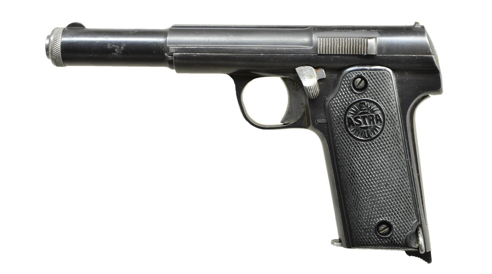 Cal. 9mm Largo. Ser. #5138. Bbl. 5-7/8". Slide is marked on top left 'PISTOLA DE 9M/M (38)" "MODELO 1921 (400)". Marked on top right "UNCETA Y COMPANIA GUERNICA ESPANA". Marked at forward top of end of slide w/ Astra logo. Marked on rear of bbl. in ejection port "9M/M & 38" "91623". Rear right of slide "74358". Frame is marked on left side behind trigger w/ "R" & on forward edge of trigger guard w/ 5 pointed star. Fixed sights. Checkered black plastic grips w/ Astra logos. Lanyard loop on lower left of slide. Mags: 1 8 rd. non matching w/ Astra logo on floorplate. CONDITION: pistol retains 70% thinning original blue w/ light wear & scattered spots of oxidation. Trigger guard has slightly dented appearance in forward portion of bow. Grips have moderate wear w/ flattening of diamonds. Worn bore turning dark. (22-4307/RW) CURIO. $300-500.